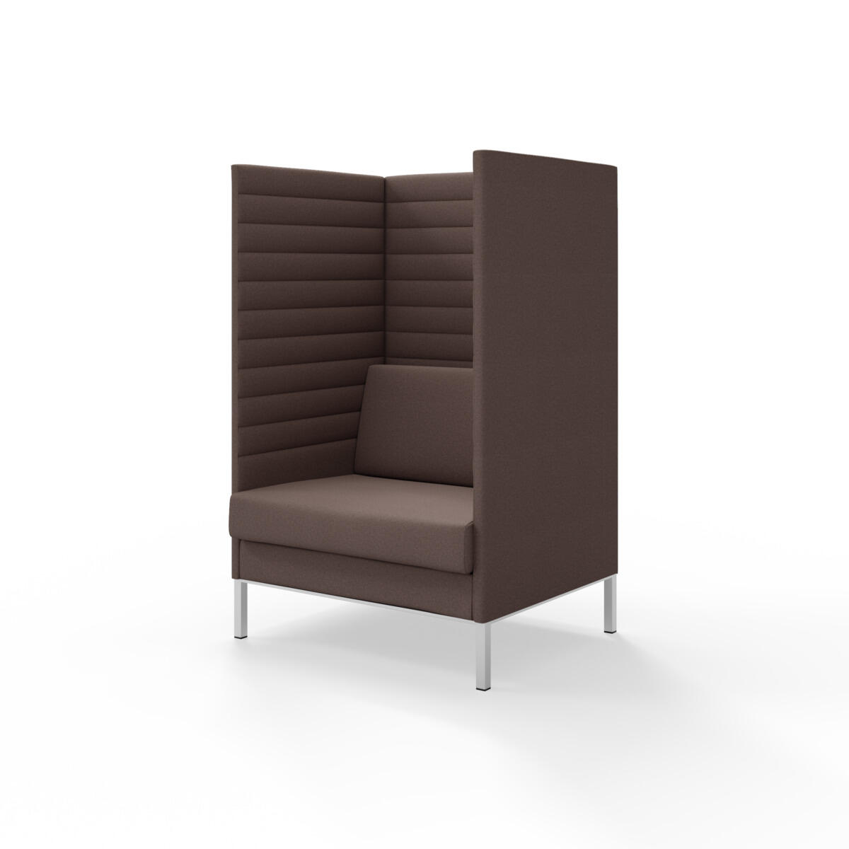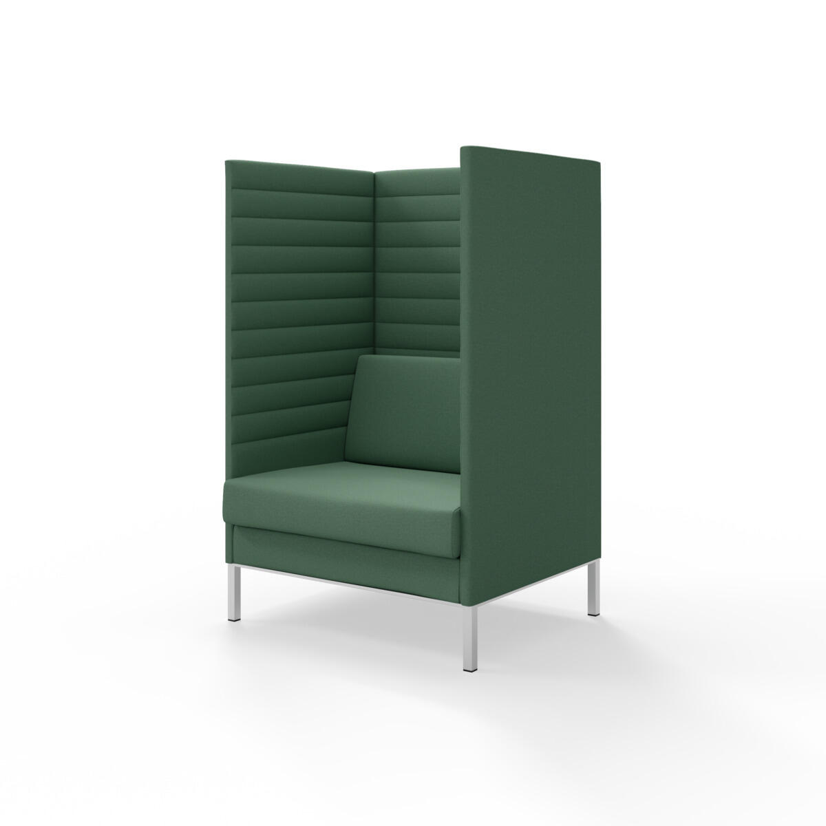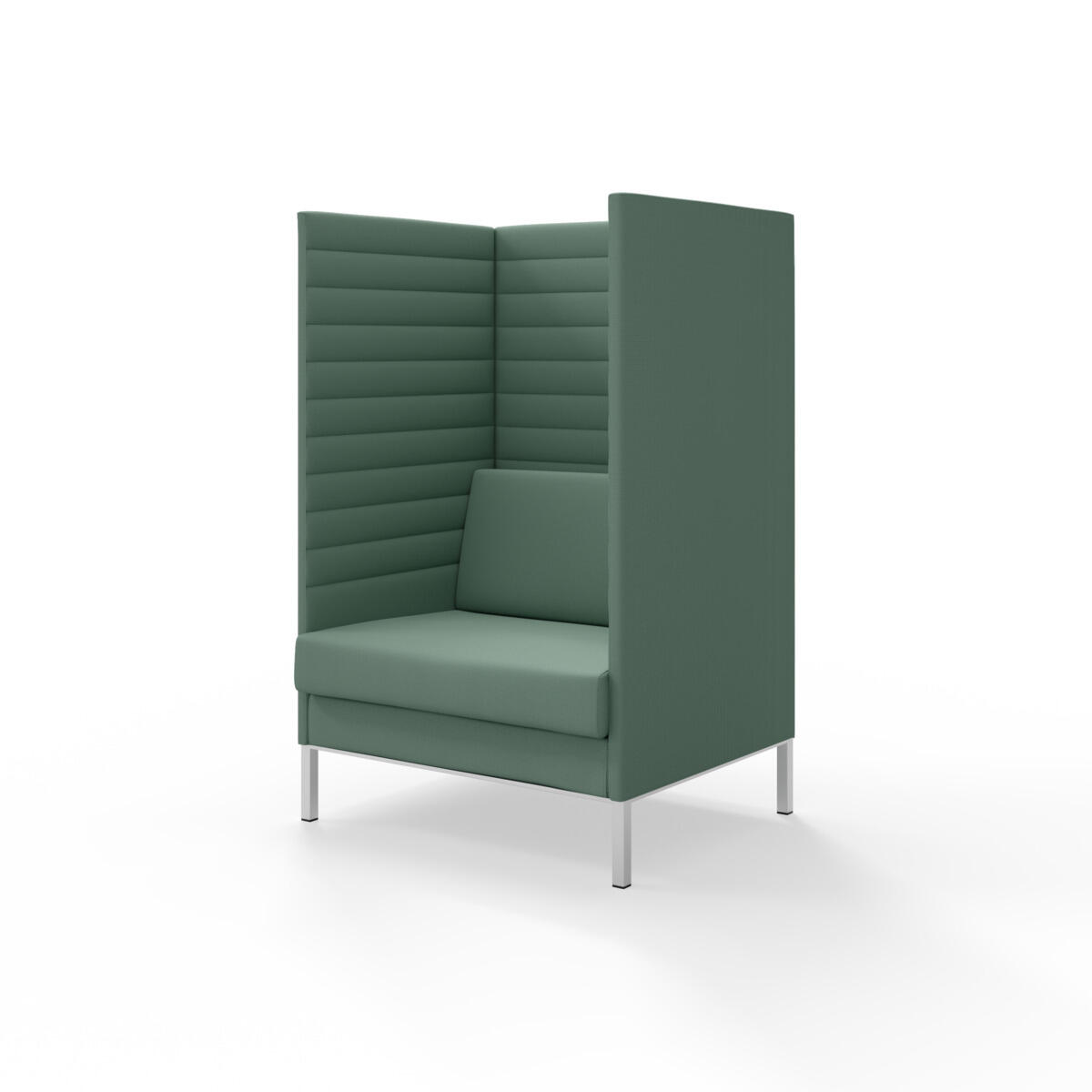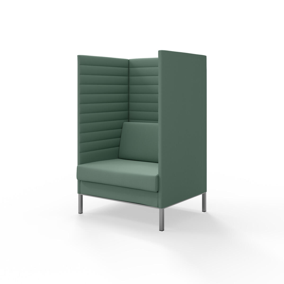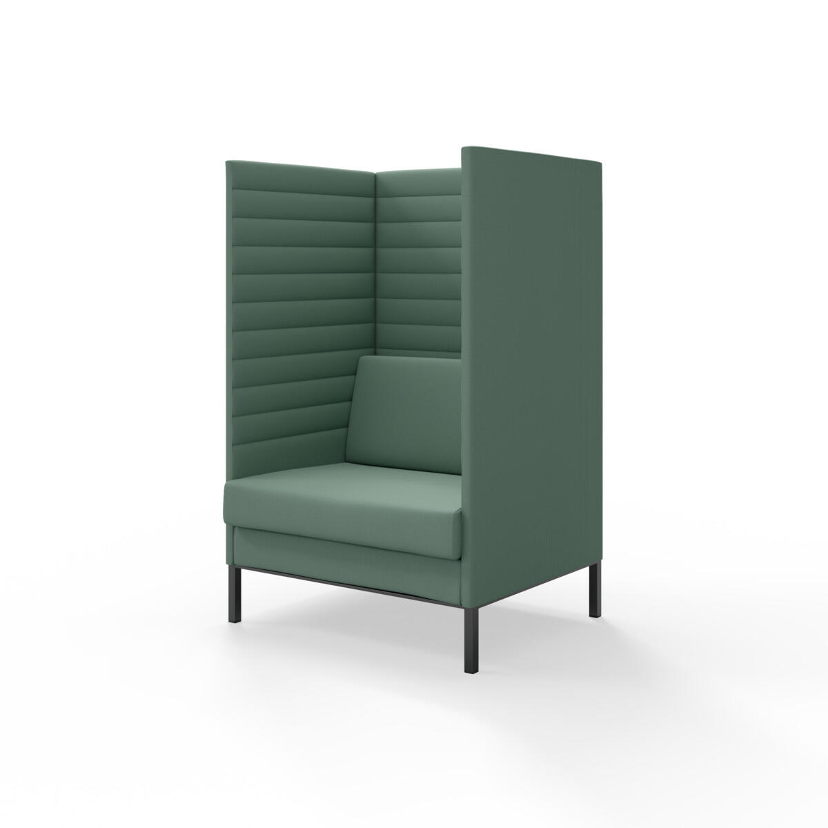 Den høye ryggen og de høye sidene skjermer og demper lyden effektivt. Treramme med nozag-base og polstring av kaldskum. Understell i pulverlakkert metall. Avtakbart trekk på rygg- og sittepute.