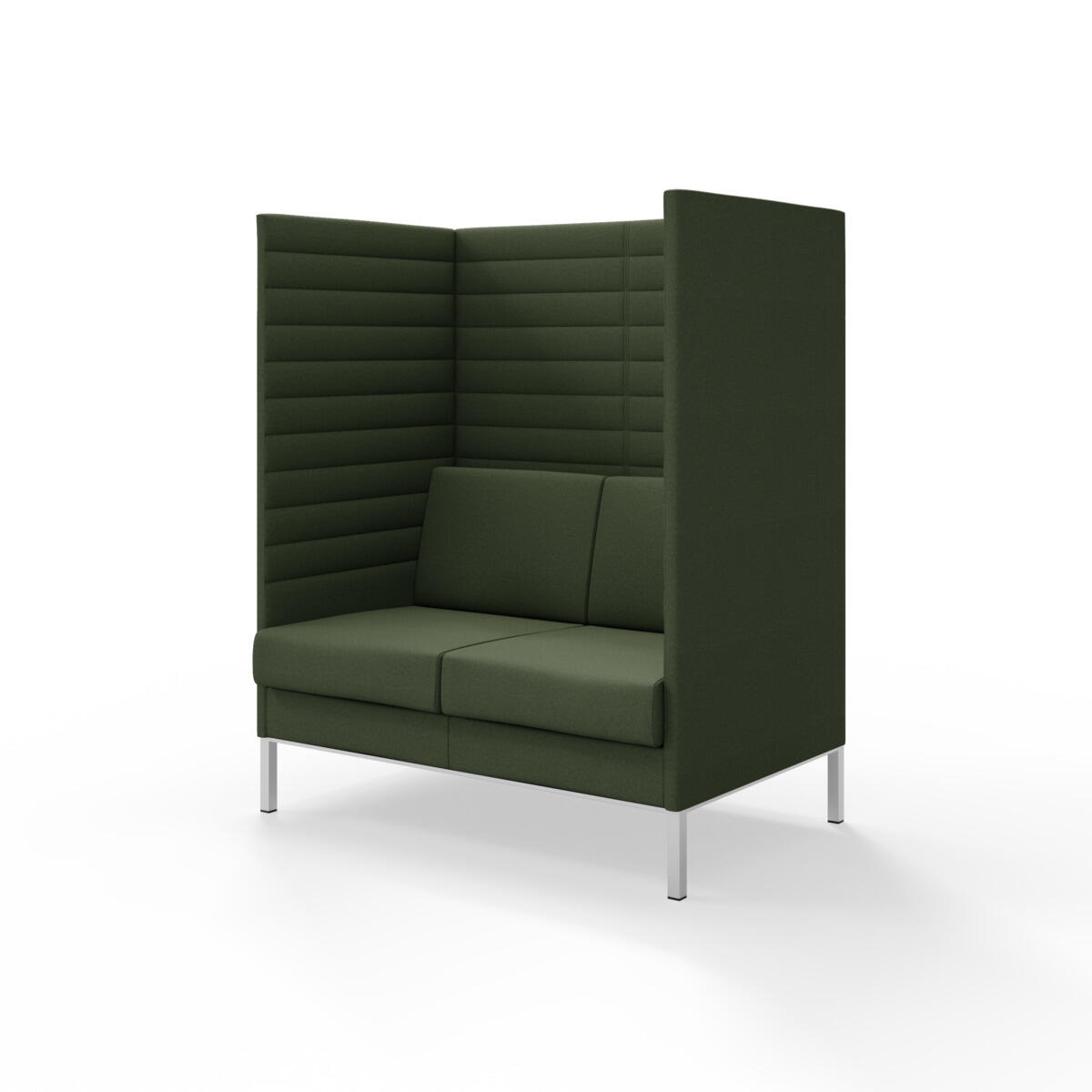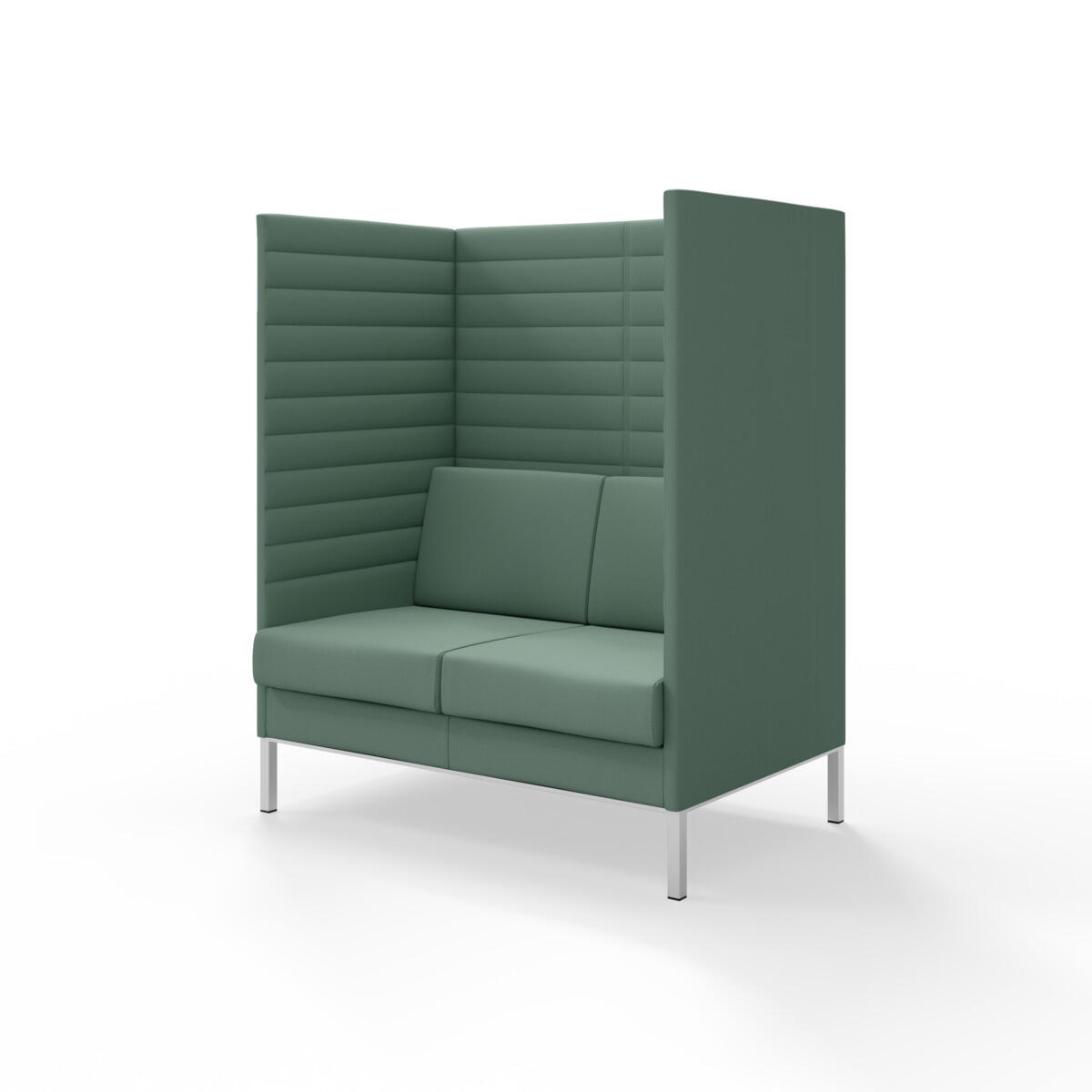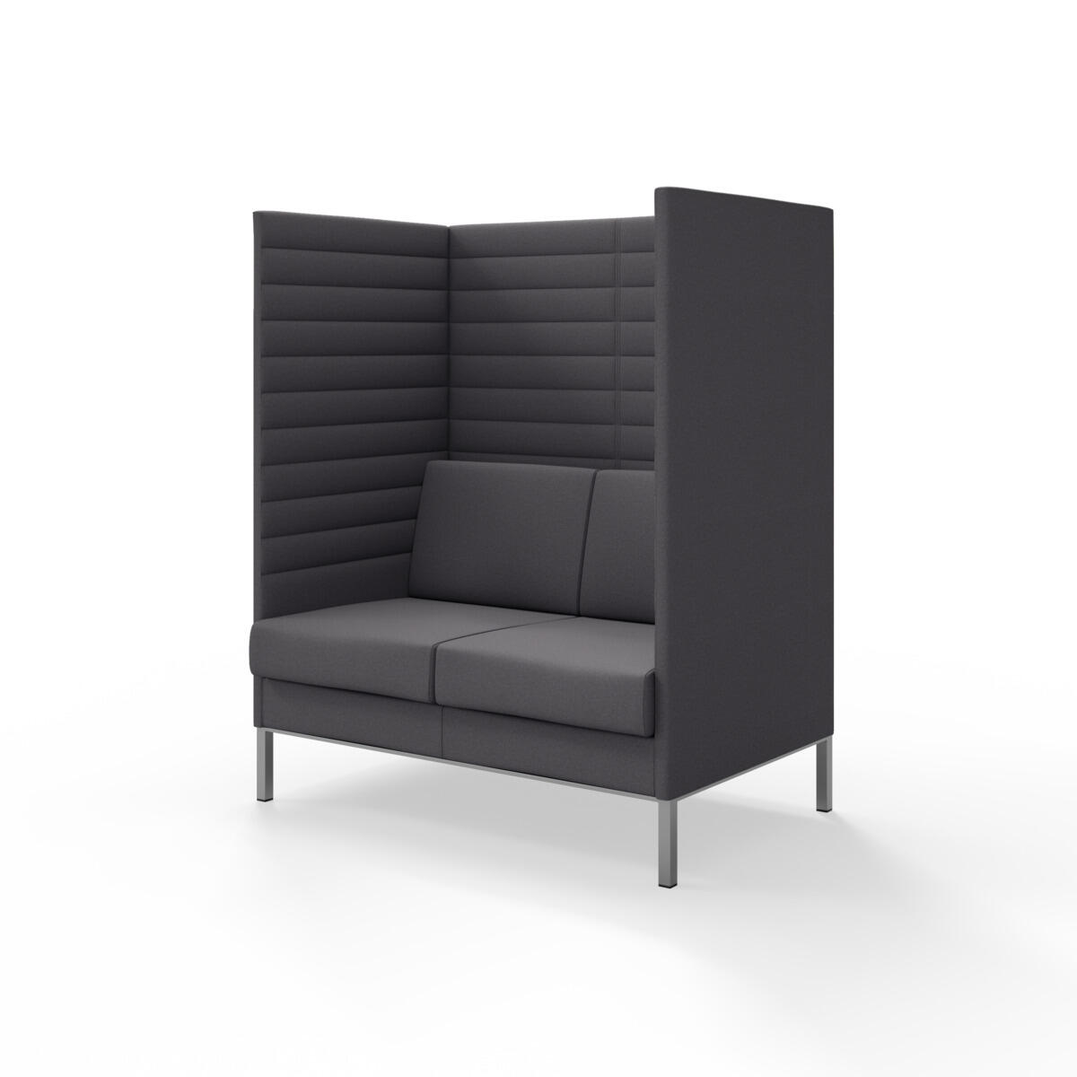 Den høye ryggen og de høye sidene skjermer og demper lyden effektivt. Treramme med nozag-base og polstring av kaldskum. Understell i pulverlakkert metall. Avtakbart trekk på rygg- og sittepute.