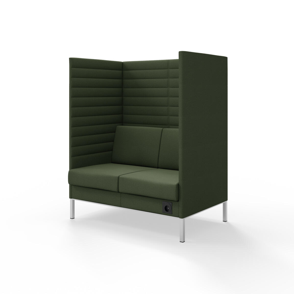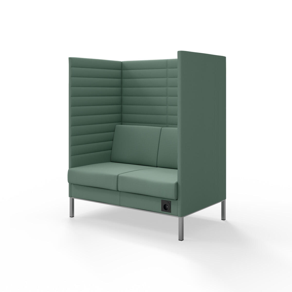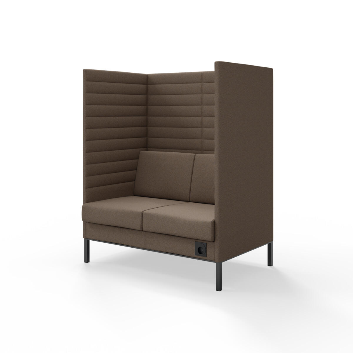 Den høye ryggen og de høye sidene skjermer og demper lyden effektivt. Treramme med nozag-base og polstring av kaldskum. Understell i pulverlakkert metall. Uttak for strøm inkludert. Avtakbart trekk på rygg- og sittepute.