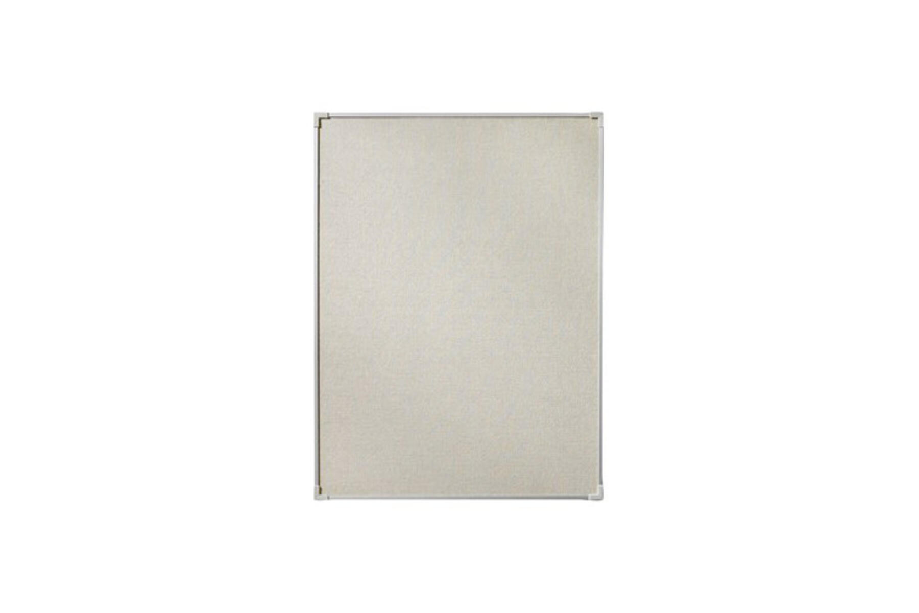 Oppslagstavle trukket med lin. Aluminiumsramme med plasthjørner.