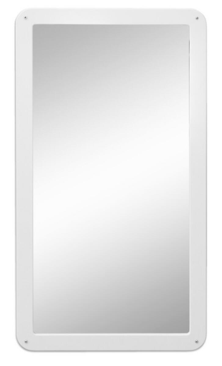 Speil med sikkerhetsglass og ramme i hvitpigmentert bjørk kryssfiner. Kan henges både stående og liggende.