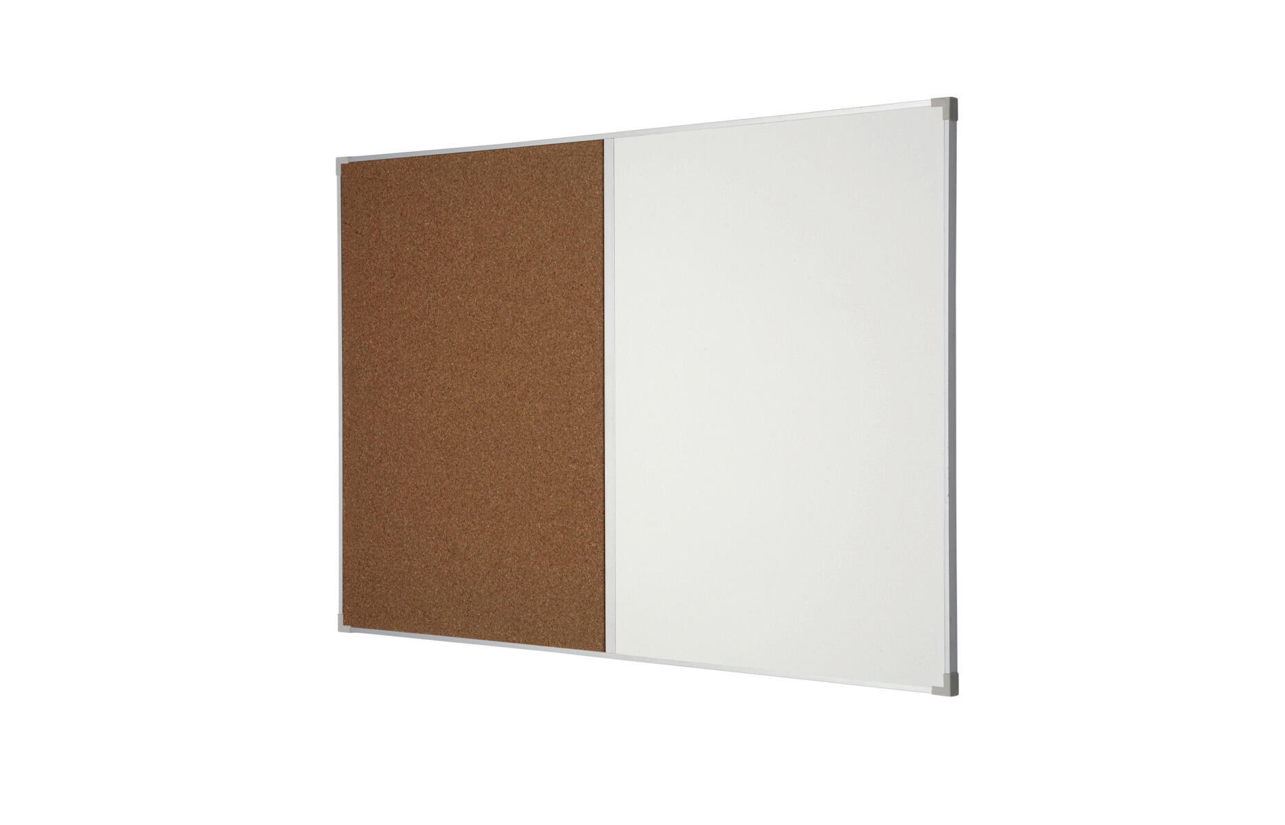 Halve tavlen er whiteboard med magnetfunksjon og den andre halvparten er oppslagstavle med naturkork. Ramme av aluminium. Pennehylle følger med.