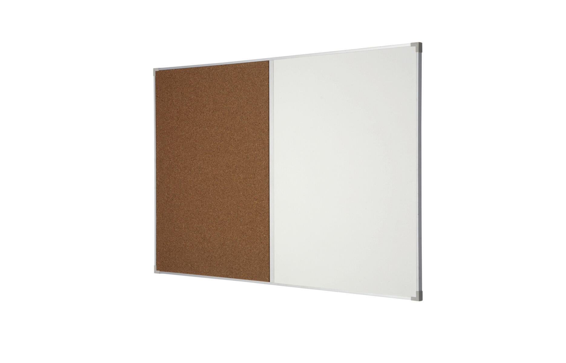 Halve tavlen er whiteboard med magnetfunksjon og den andre halvparten er oppslagstavle med naturkork. Ramme av aluminium. Pennehylle følger med.