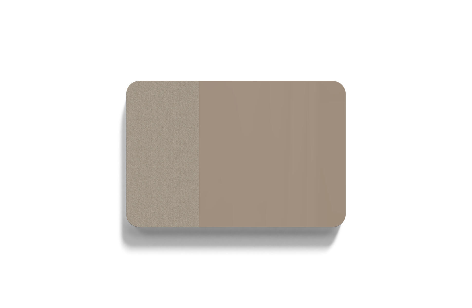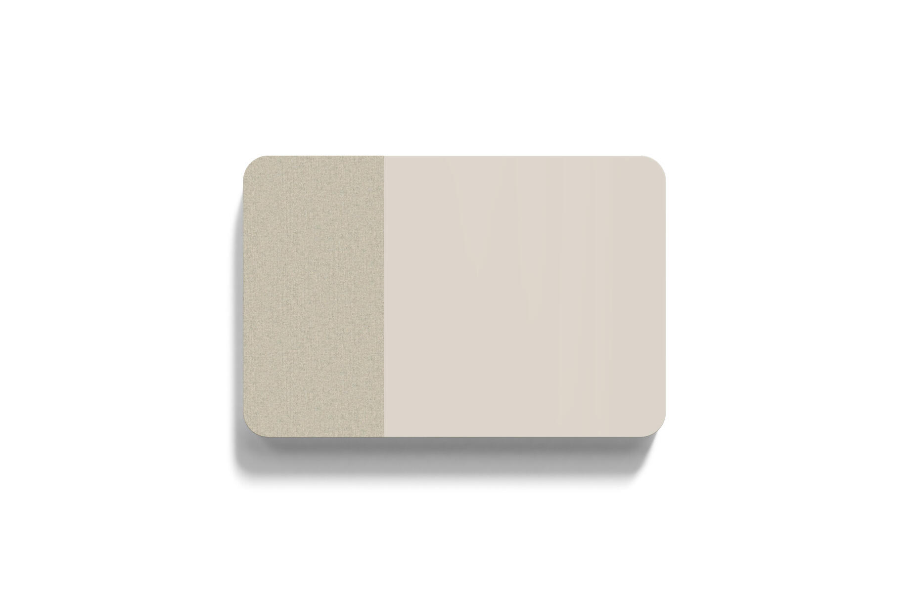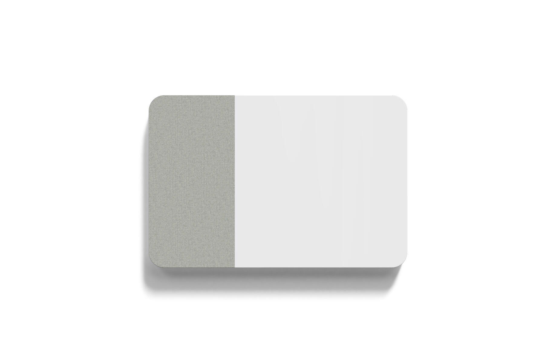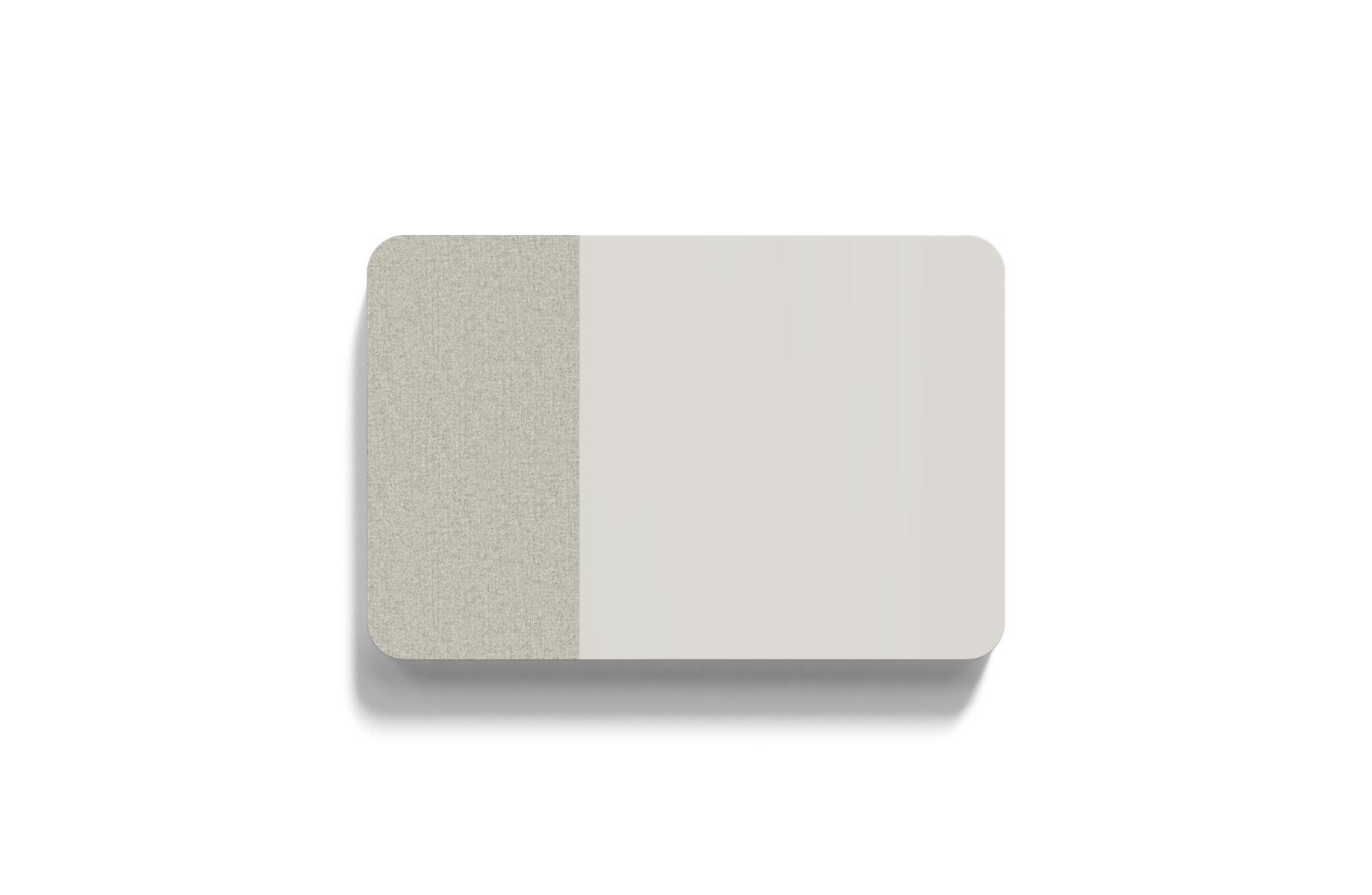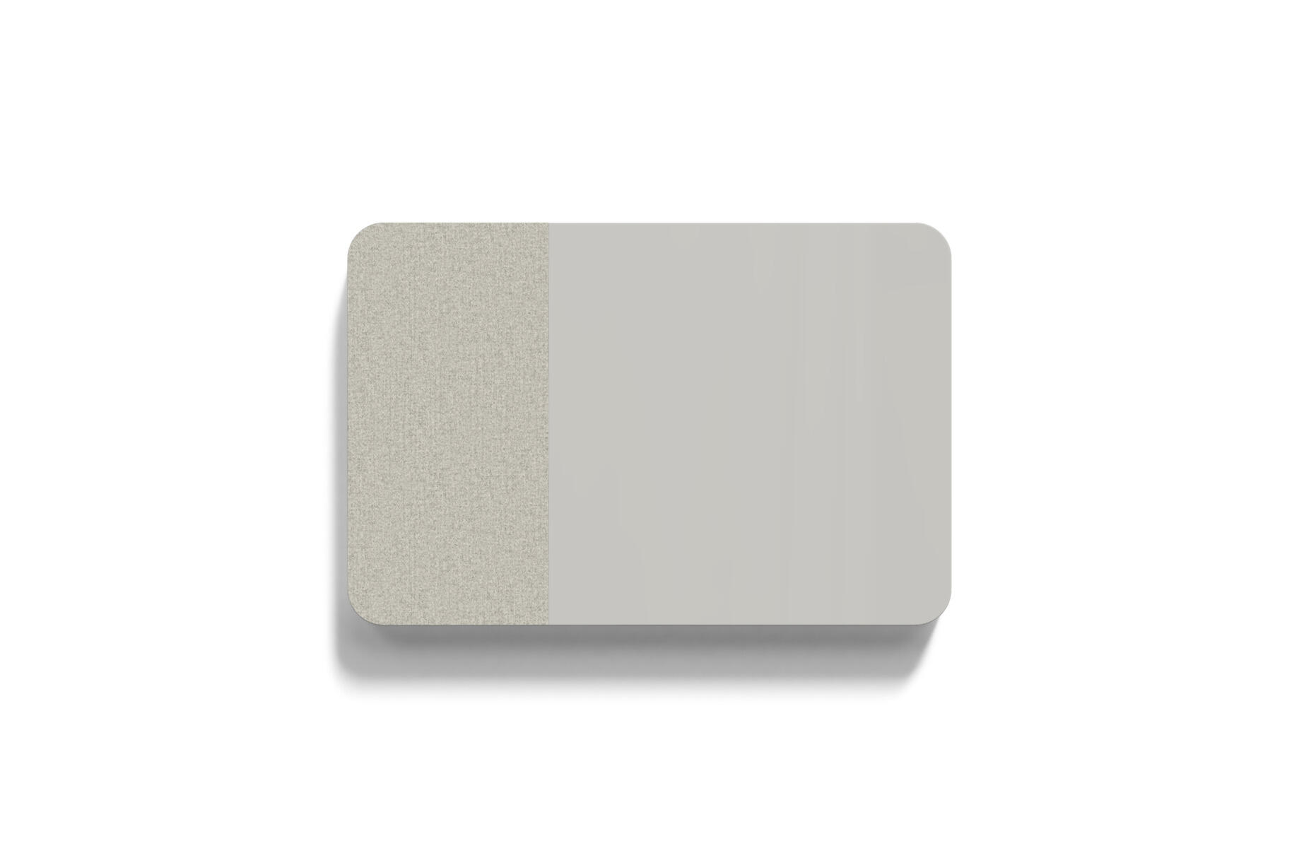 Magnetbærende skrivetavle med mykt avrundede hjørner og tekstilkledd, lydabsorberende og nålbar overflate. Skrivbar flate 100×100 cm, nålbar flate 50×100 cm. Skjulte beslag. Herdet, optisk glass. Krever spesielt tilpassede, sterkere magneter. Velg mellom flere utvalgte fargekombinasjoner.