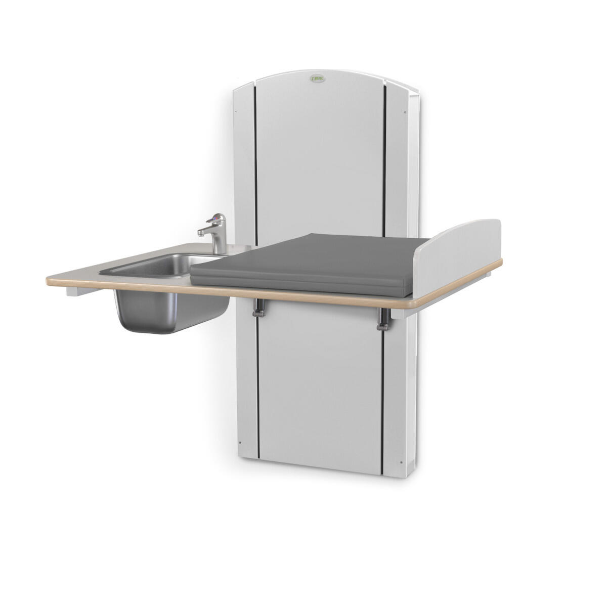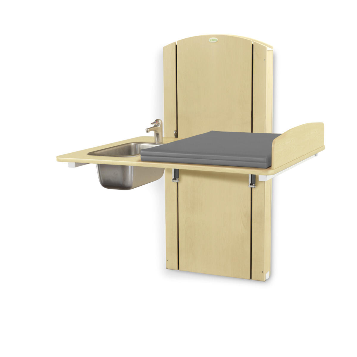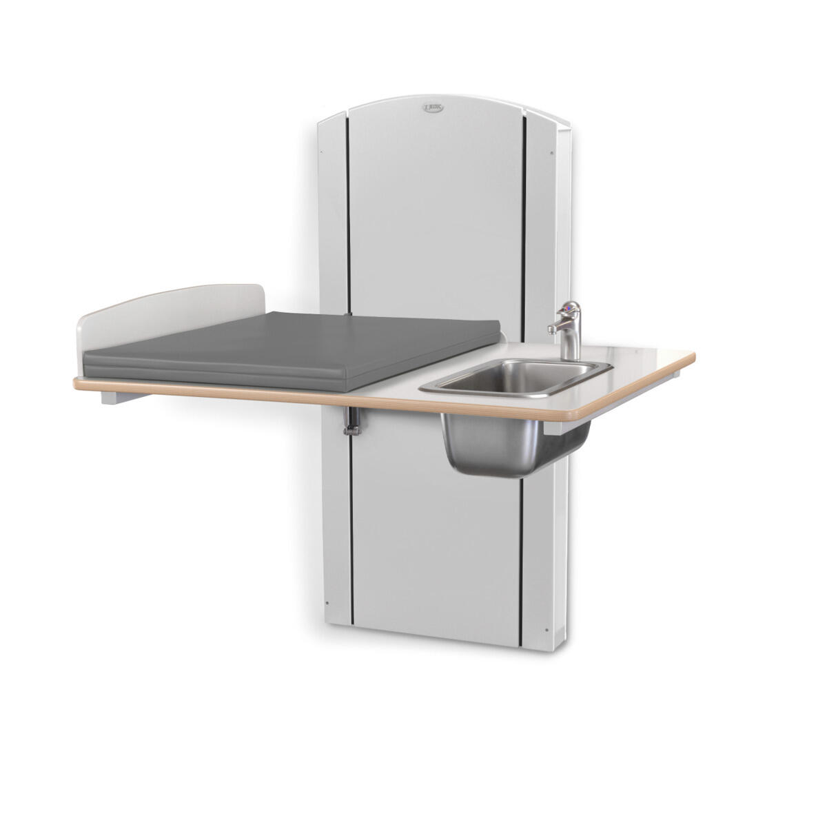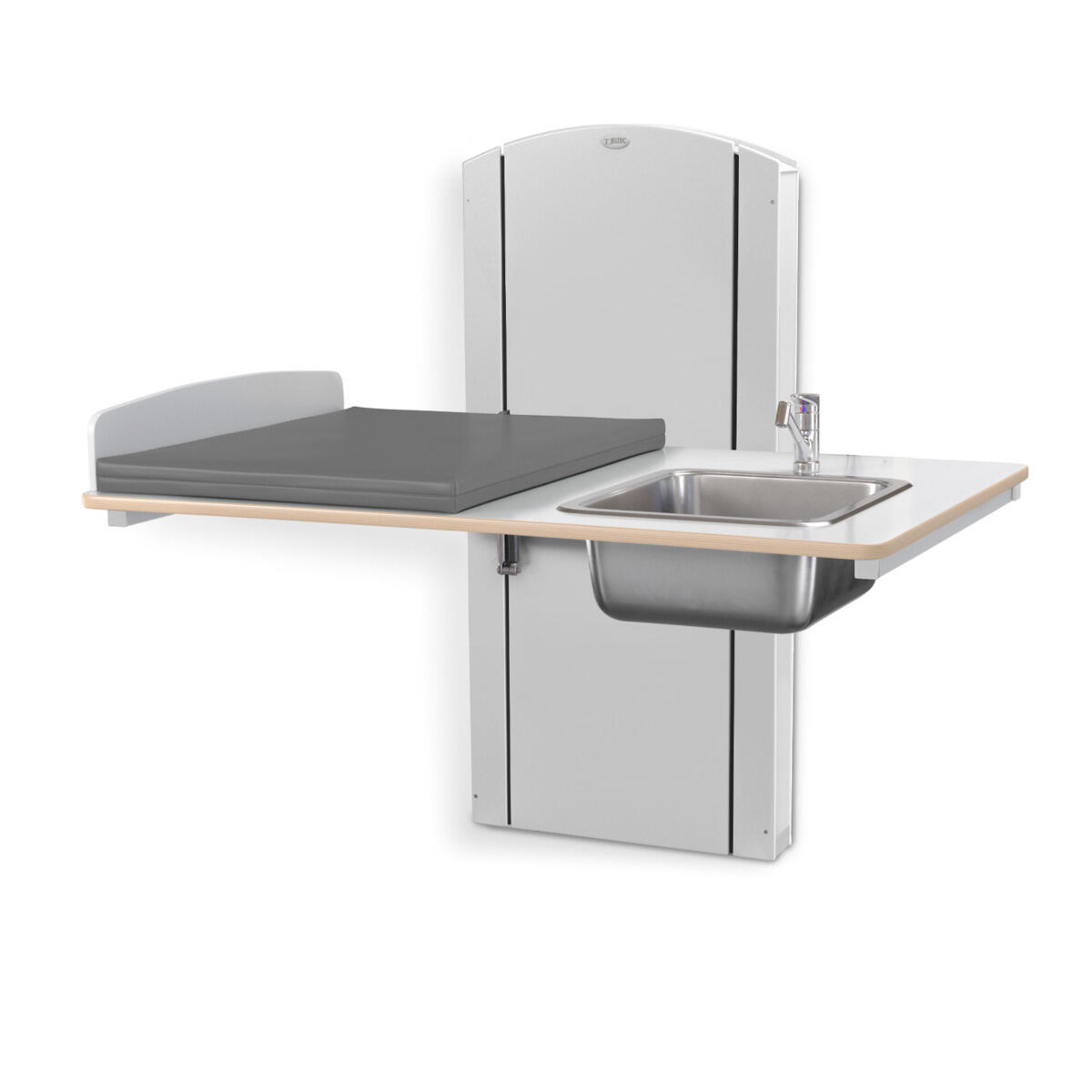 Lyfta vegghengt elektrisk justerbart stellebord med en minimumshøyde på 30 cm slik at barn enkelt kan klatre opp på stellebordet fra gulvnivå. Du stiller enkelt inn riktig arbeidshøyde med håndkontrollen. Forhøyet vegg finnes i bredder mellom 60-140 cm og med vaskedel høyre eller venstre i breddene 100, 120 og 140 cm. Alle bredder har standard plate i laminert plyfa (hvit eller bjørk) med mykt avrundede hjørner og høye kanter. Når stellebordet ikke er i bruk kan platen brettes opp mot veggen for å spare plass (gjelder ikke modeller med vaskedel). For å unngå klemfare mellom stellebordet og omkringliggende flater bør du ha en sikkerhetsavstand på ca 10 cm. Madrassen kan desinfiseres med sprit og tåler maskinvask opp til 60 °C. Ved valg av vaskedel følger det med blandebatteri. Ved bredde 120-140 med vask 34x40x18 cm medfølger blandebatteri med hånddusj. Ved bredde 100 med vask 17x34x14 cm medfølger blandebatteri uten hånddusj.