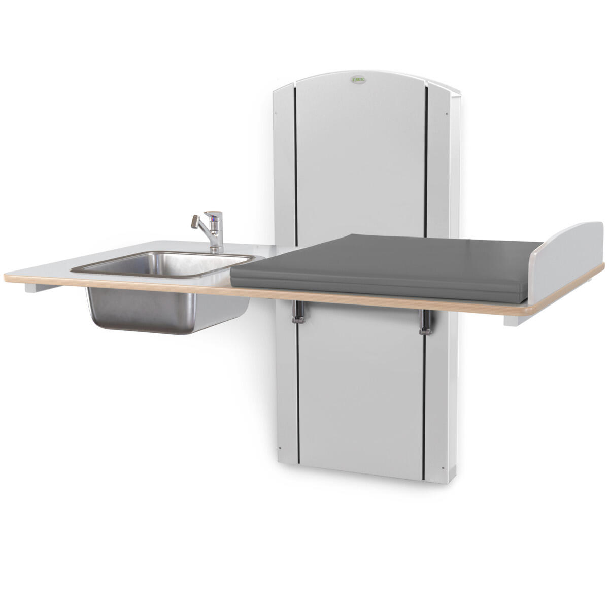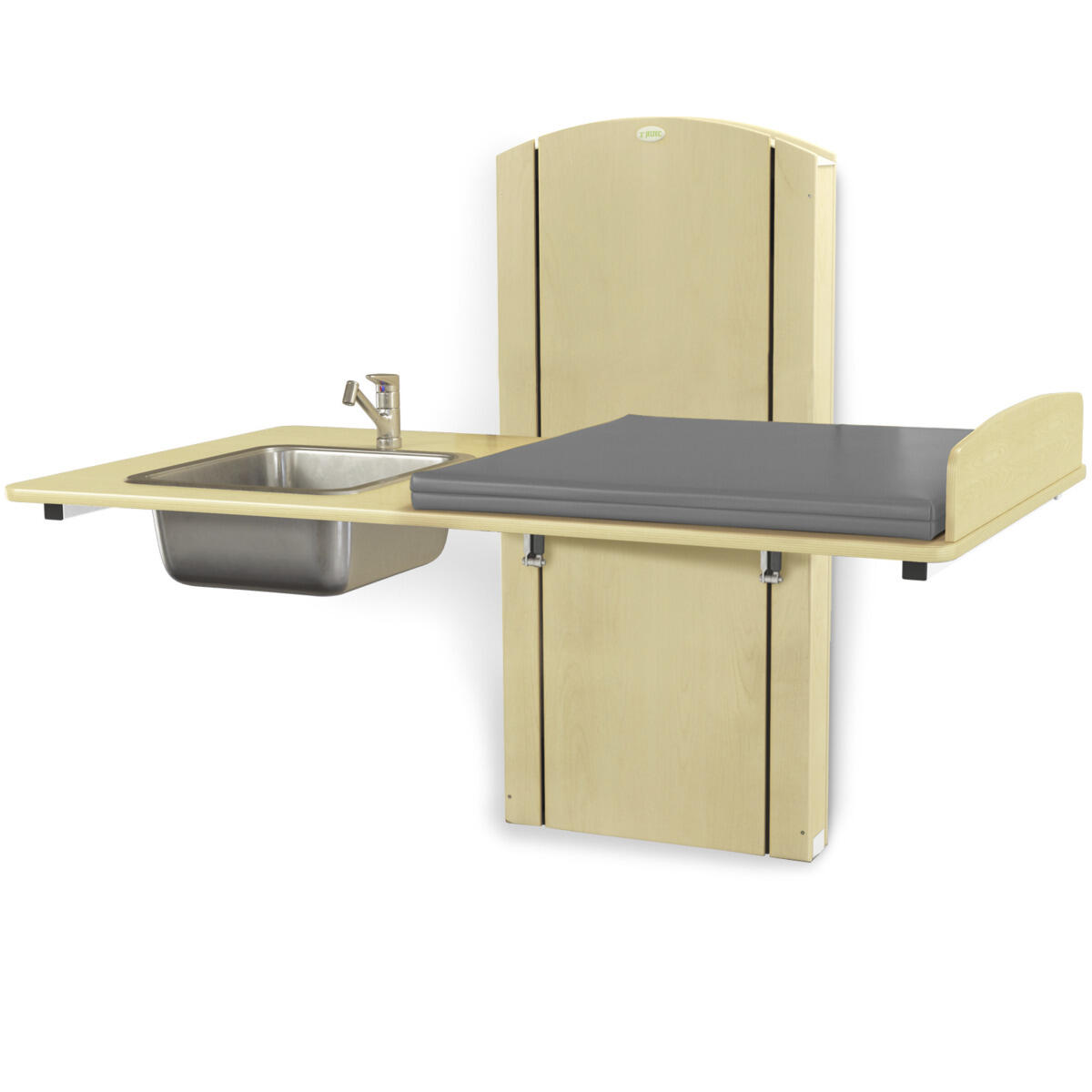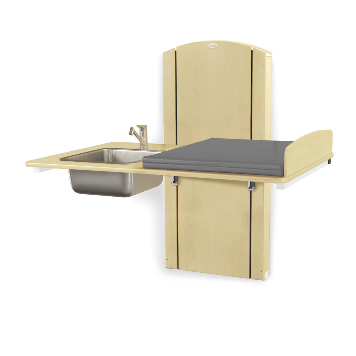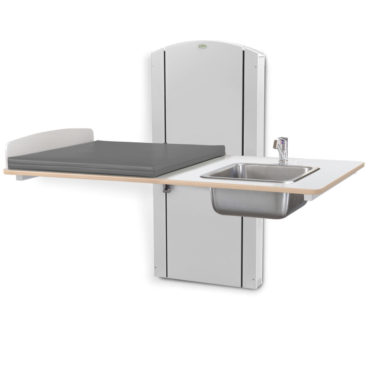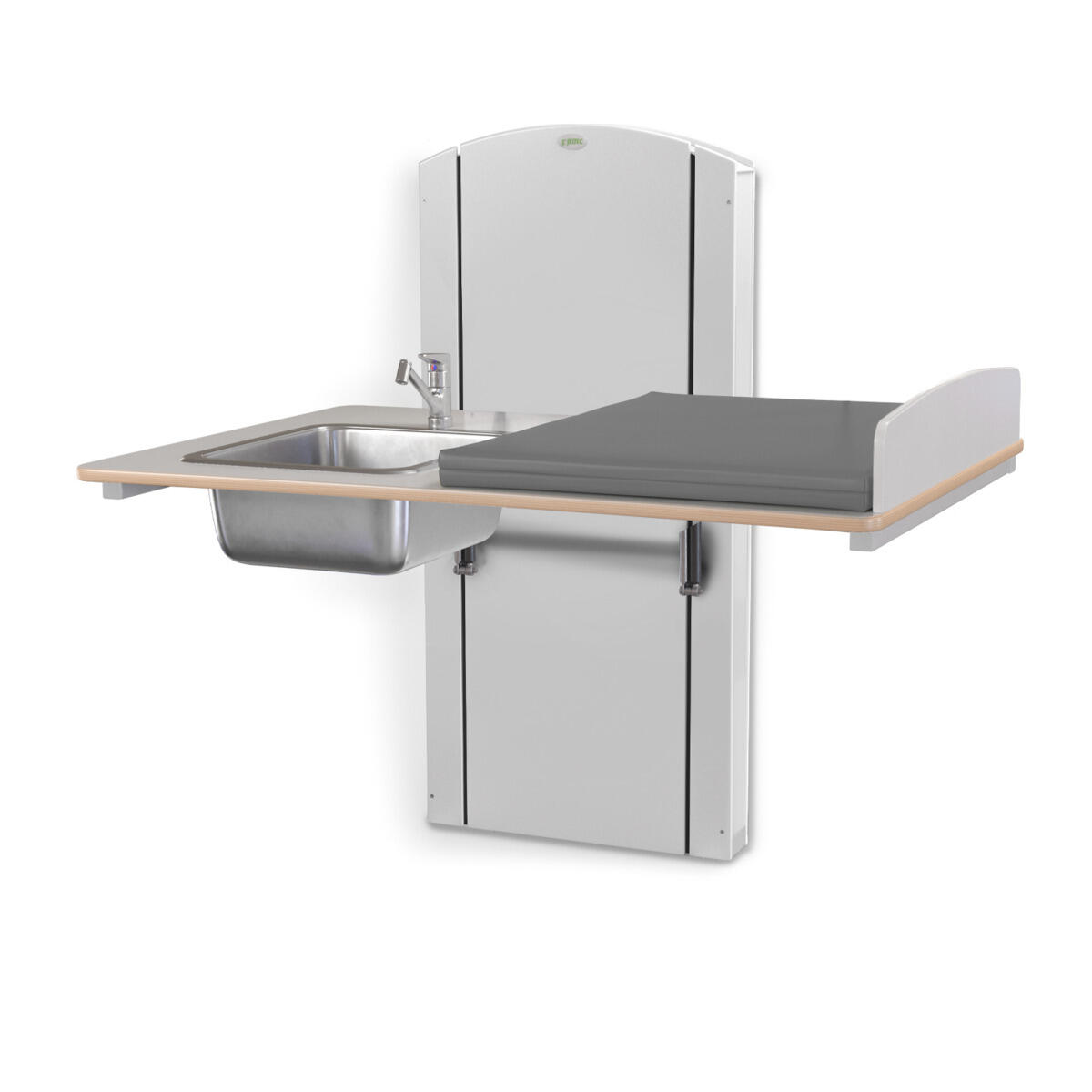 Lyfta vegghengt elektrisk justerbart stellebord med en minimumshøyde på 30 cm slik at barn enkelt kan klatre opp på stellebordet fra gulvnivå. Du stiller enkelt inn riktig arbeidshøyde med håndkontrollen. Forhøyet vegg finnes i bredder mellom 60-140 cm og med vaskedel høyre eller venstre i breddene 100, 120 og 140 cm. Alle bredder har standard plate i laminert plyfa (hvit eller bjørk) med mykt avrundede hjørner og høye kanter. Når stellebordet ikke er i bruk kan platen brettes opp mot veggen for å spare plass (gjelder ikke modeller med vaskedel). For å unngå klemfare mellom stellebordet og omkringliggende flater bør du ha en sikkerhetsavstand på ca 10 cm. Madrassen kan desinfiseres med sprit og tåler maskinvask opp til 60 °C. Ved valg av vaskedel følger det med blandebatteri. Ved bredde 120-140 med vask 34x40x18 cm medfølger blandebatteri med hånddusj. Ved bredde 100 med vask 17x34x14 cm medfølger blandebatteri uten hånddusj.