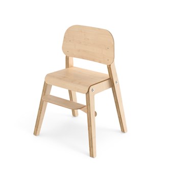 Grow er en nett barnestol med høy designverdi. Stolen har en sirkulær design der alle delene er utskiftbare og kan byttes ut, noe som gir stolen en ekstra lang levetid. Stolens benramme er laget av klarlakkert bjørkekryssfiner. Setet og ryggen er laget av kryssfiner med en overflate av slitesterkt høytrykkslaminat. Ryggstøtten med armlener er mykt buet for å gi barnet ekstra komfort og støtte, og det lett tilbakelente setet med sin avrundede forkant gir en myk følelse og hindrer barnet i å skli ned. Setet har ingen skruehull i overflatelaget, noe som gjør det enkelt å tørke av og holde rent. Setedybden og høyden på stolen er tilpasset barn mellom 80-120 cm. Fotstøtten kan justeres i 3 høyder 15-25 cm med 5 cm intervaller. Stolen kan stables i opptil tre i høyden. Dette produktet oppfyller de høye kravene i EN 17191-standarden, noe som betyr at barn får det beste innen sikkerhet og komfort.