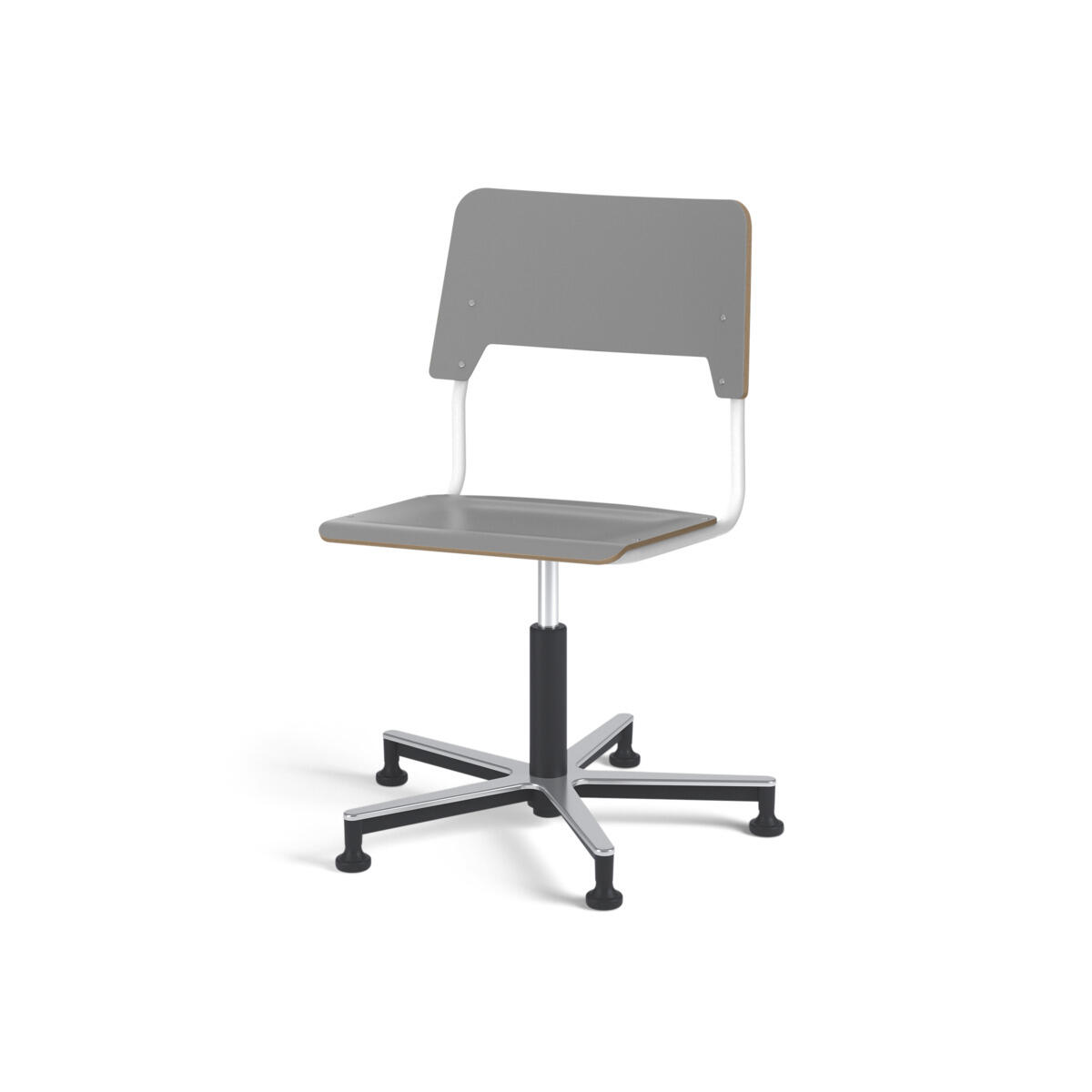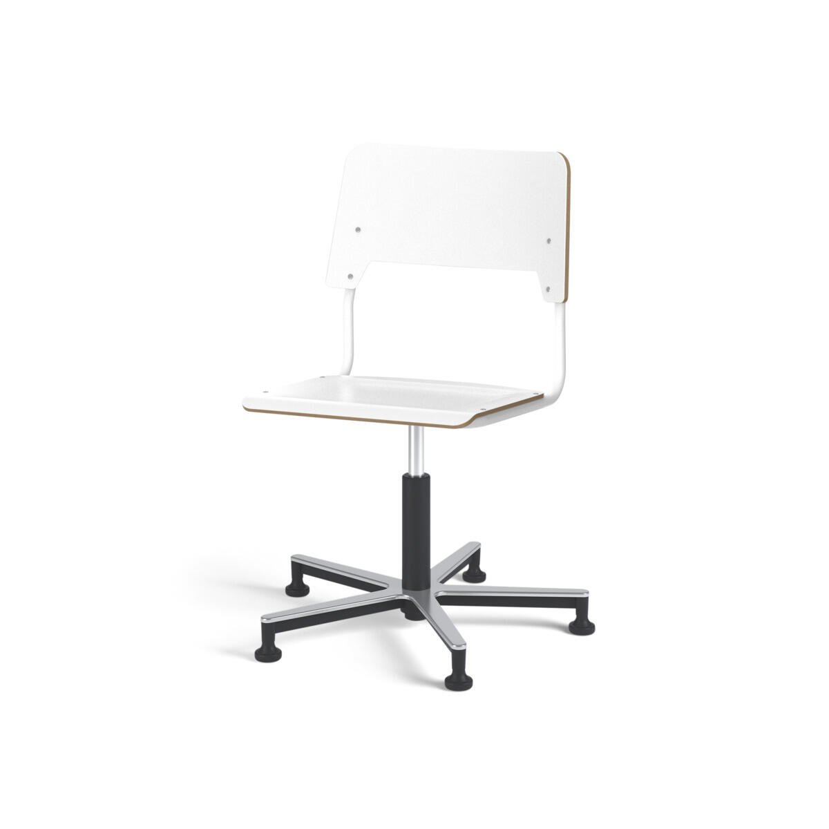 Sete og rygg er laget av kryssfiner med en overflate av høytrykkslaminat. Setet er skålformet, noe som gjør den behagelig å sitte på. Rammen for rygg og sete er lakkert i hvit, RAL9003. Utstyrt med gassdemping for regulering av sittehøyde ved hjelp av en spak. Aluminiumskryss med glideføtter. En avstand mellom rygg og stativ gjør det mulig å henge stolen på bordkanten via stolryggen. For å forhindre skader på bordet ved oppheng er glidebeskyttelse montert på ryggen. Avstanden kan brukes som veskekrok.