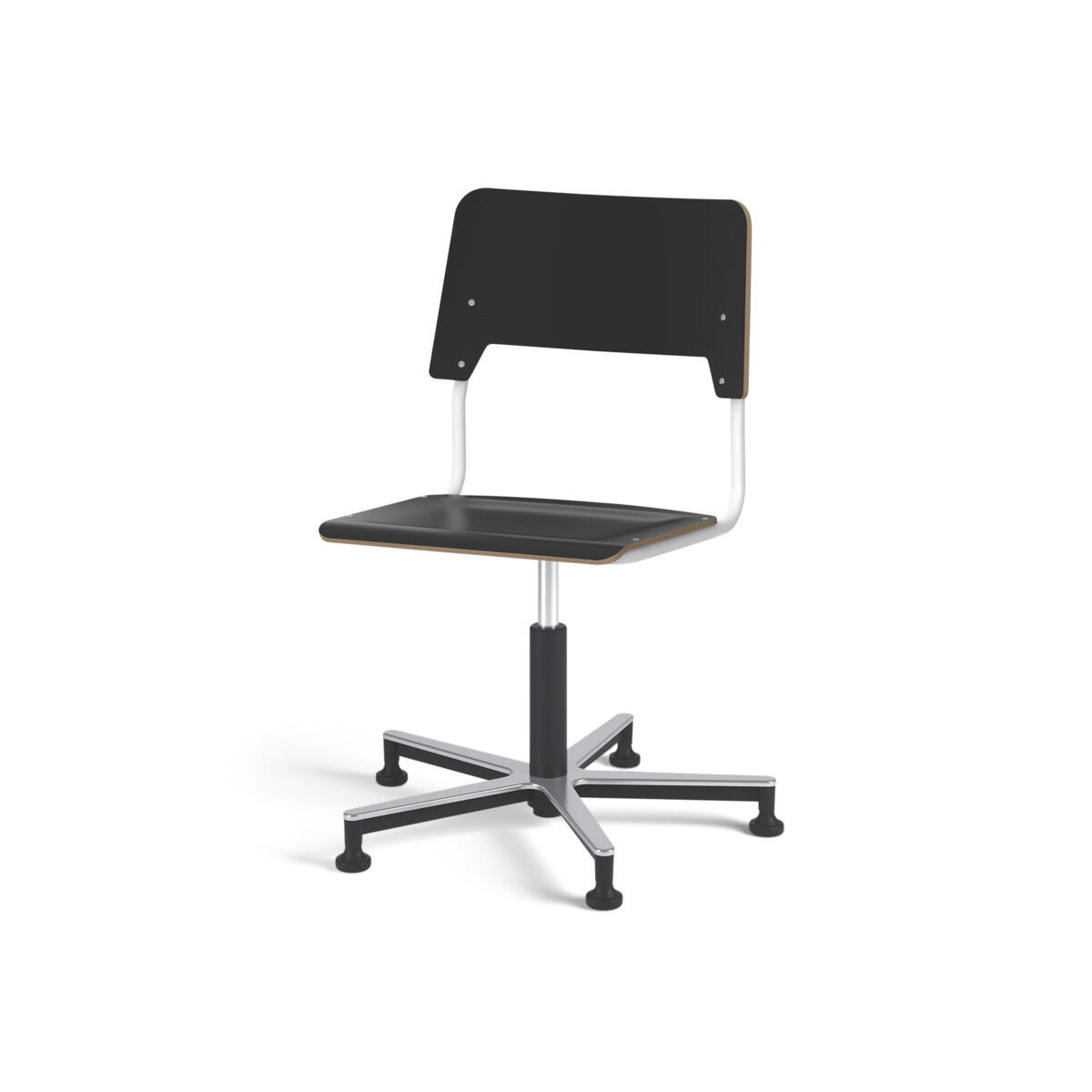 Sete og rygg er laget av kryssfiner med en overflate av høytrykkslaminat. Setet er skålformet, noe som gjør den behagelig å sitte på. Rammen for rygg og sete er lakkert i svart, RAL 9005. Utstyrt med gassdemping for regulering av sittehøyde ved hjelp av en spak. Aluminiumskryss med glideføtter. En avstand mellom rygg og stativ gjør det mulig å henge stolen på bordkanten via stolryggen. For å forhindre skader på bordet ved oppheng er glidebeskyttelse montert på ryggen. Avstanden kan brukes som veskekrok.