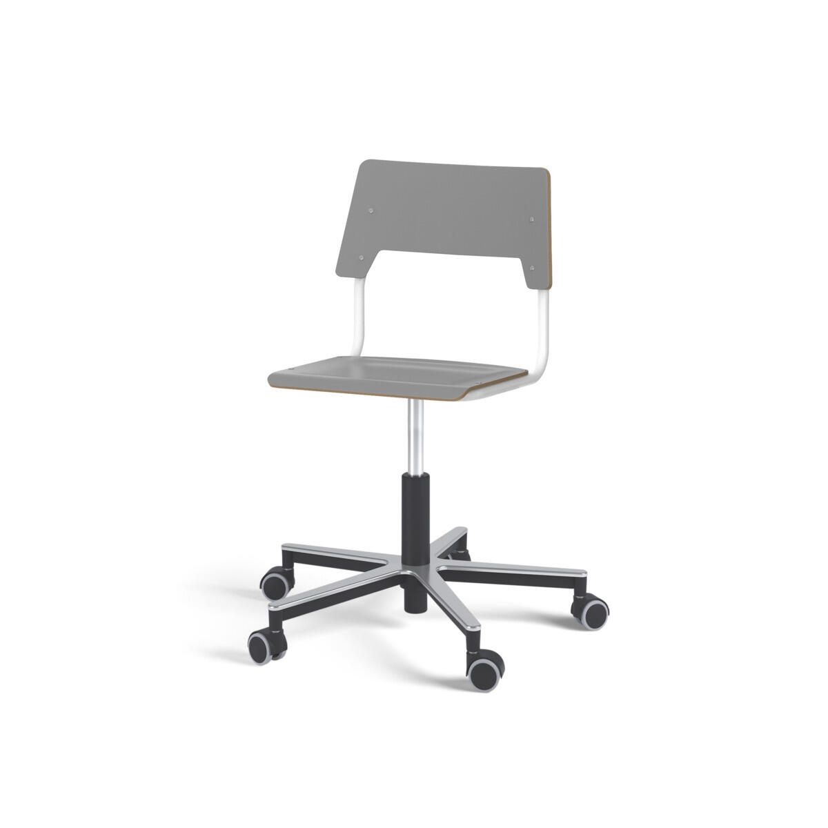 Sete og rygg er laget av kryssfiner med en overflate av høytrykkslaminat. Setet er skålformet, noe som gjør den behagelig å sitte på. Rammen for rygg og sete er lakkert i sølv, RAL 9006. Utstyrt med gassdemping for regulering av sittehøyde ved hjelp av en spak. Aluminiumskryss med hjul. En avstand mellom rygg og stativ gjør det mulig å henge stolen på bordkanten via stolryggen. For å forhindre skader på bordet ved oppheng er glidebeskyttelse montert på ryggen. Avstanden kan brukes som veskekrok.