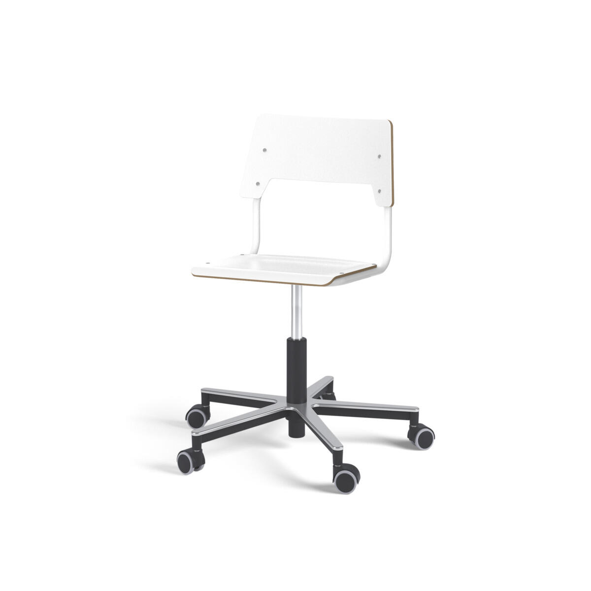 Sete og rygg er laget av kryssfiner med en overflate av høytrykkslaminat. Setet er skålformet, noe som gjør den behagelig å sitte på. Rammen for rygg og sete er lakkert i hvit, RAL9003. Utstyrt med gassdemping for regulering av sittehøyde ved hjelp av en spak. Aluminiumskryss med hjul. En avstand mellom rygg og stativ gjør det mulig å henge stolen på bordkanten via stolryggen. For å forhindre skader på bordet ved oppheng er glidebeskyttelse montert på ryggen. Avstanden kan brukes som veskekrok.
