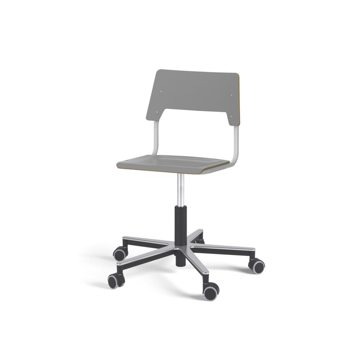 Sete og rygg er laget av kryssfiner med en overflate av høytrykkslaminat. Setet er skålformet, noe som gjør den behagelig å sitte på. Rammen for rygg og sete er lakkert i sølv, RAL 9006. Utstyrt med gassdemping for regulering av sittehøyde ved hjelp av en spak. Aluminiumskryss med hjul. En avstand mellom rygg og stativ gjør det mulig å henge stolen på bordkanten via stolryggen. For å forhindre skader på bordet ved oppheng er glidebeskyttelse montert på ryggen. Avstanden kan brukes som veskekrok.