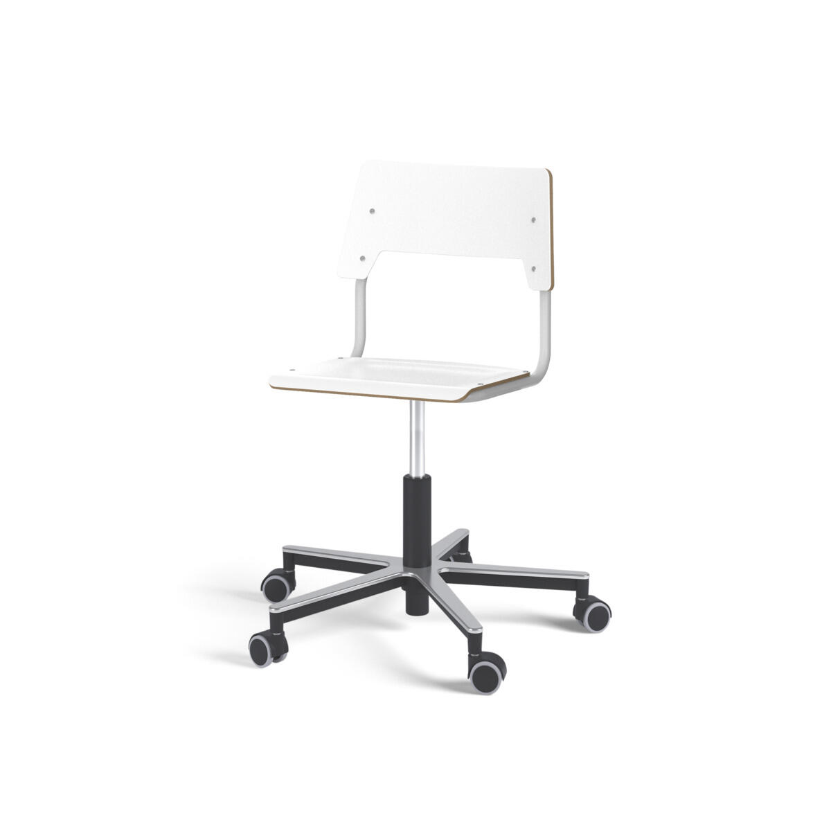Sete og rygg er laget av kryssfiner med en overflate av høytrykkslaminat. Setet er skålformet, noe som gjør den behagelig å sitte på. Rammen for rygg og sete er lakkert i hvit, RAL9003. Utstyrt med gassdemping for regulering av sittehøyde ved hjelp av en spak. Aluminiumskryss med hjul. En avstand mellom rygg og stativ gjør det mulig å henge stolen på bordkanten via stolryggen. For å forhindre skader på bordet ved oppheng er glidebeskyttelse montert på ryggen. Avstanden kan brukes som veskekrok.