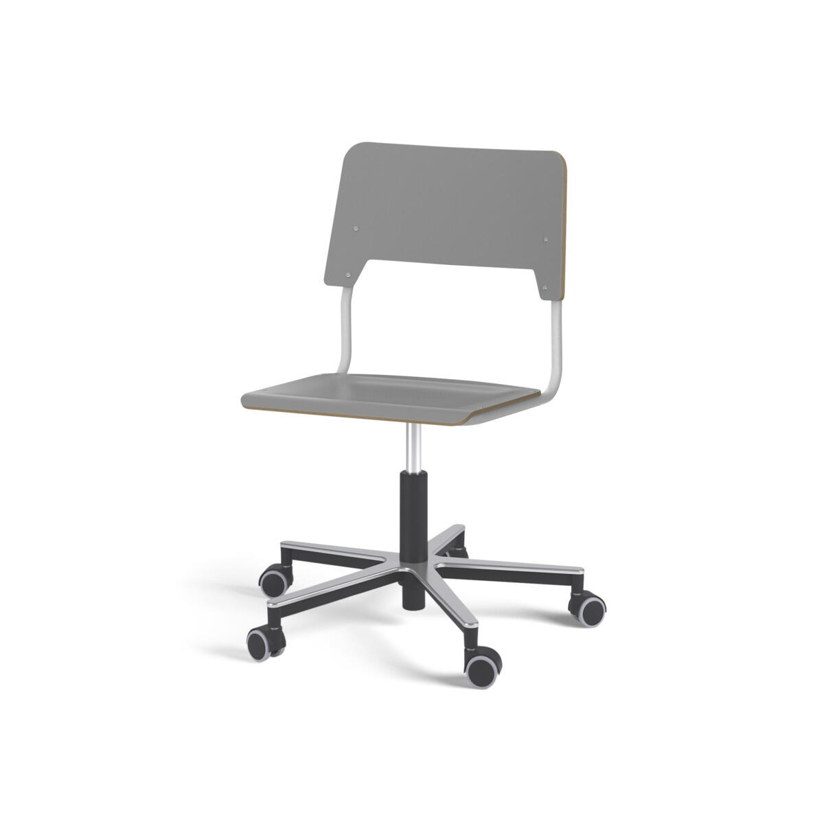 Sete og rygg er laget av kryssfiner med en overflate av høytrykkslaminat. Setet er skålformet, noe som gjør den behagelig å sitte på. Rammen for rygg og sete er lakkert i sølv, RAL 9006. Utstyrt med gassdemping for regulering av sittehøyde ved hjelp av en spak. Aluminiumskryss med hjul. En avstand mellom rygg og stativ gjør det mulig å henge stolen på bordkanten via stolryggen. For å forhindre skader på bordet ved oppheng er glidebeskyttelse montert på ryggen. Avstanden kan brukes som veskekrok.
