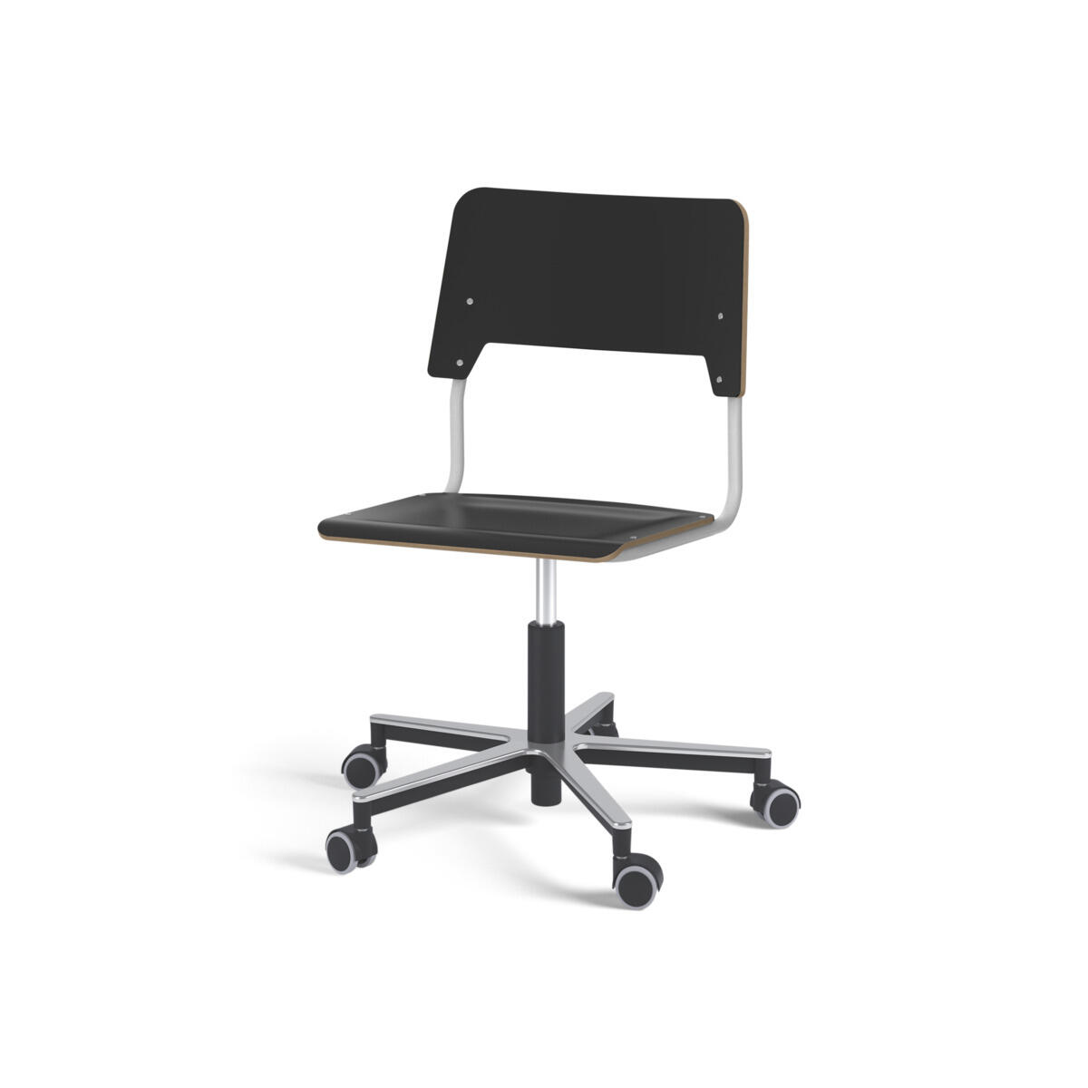 Sete og rygg er laget av kryssfiner med en overflate av høytrykkslaminat. Setet er skålformet, noe som gjør den behagelig å sitte på. Rammen for rygg og sete er lakkert i svart, RAL 9005. Utstyrt med gassdemping for regulering av sittehøyde ved hjelp av en spak. Aluminiumskryss med hjul. En avstand mellom rygg og stativ gjør det mulig å henge stolen på bordkanten via stolryggen. For å forhindre skader på bordet ved oppheng er glidebeskyttelse montert på ryggen. Avstanden kan brukes som veskekrok.