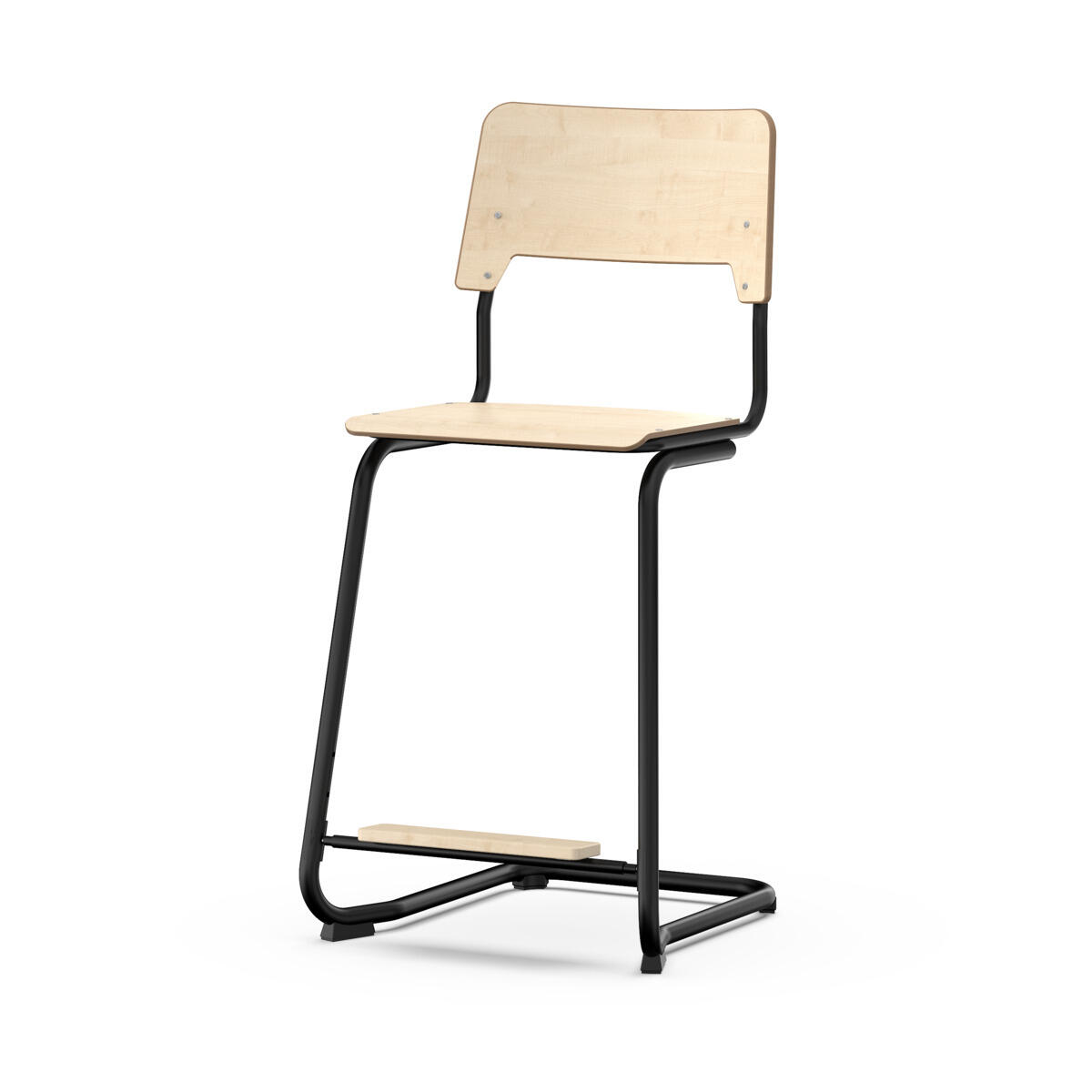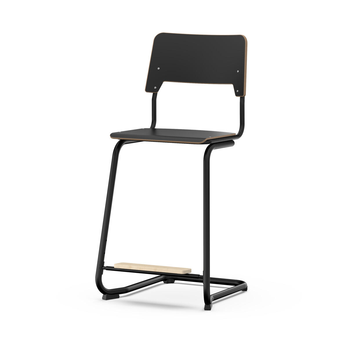 Elevstol med sete og rygg av kryssfiner med overflate av høytrykkslaminat. Setet er buet, noe som gjør det behagelig å sitte på. Stativet er lakkert i svart, RAL 9005. Føtter med filt. Stolen oppfyller kravene i henhold til EN 1729-1 & 2. En avstand mellom rygg og stativ gjør at stolen kan henges opp i ryggen. For å hindre skade på bordet ved oppheng er det montert sklibeskyttelse på ryggen. Avstanden gjør det også mulig å bruke stativet som en praktisk veskekrok. Regulerbar fotstøtte i tre faste høyder (26, 31 og 36 cm fra sete).
