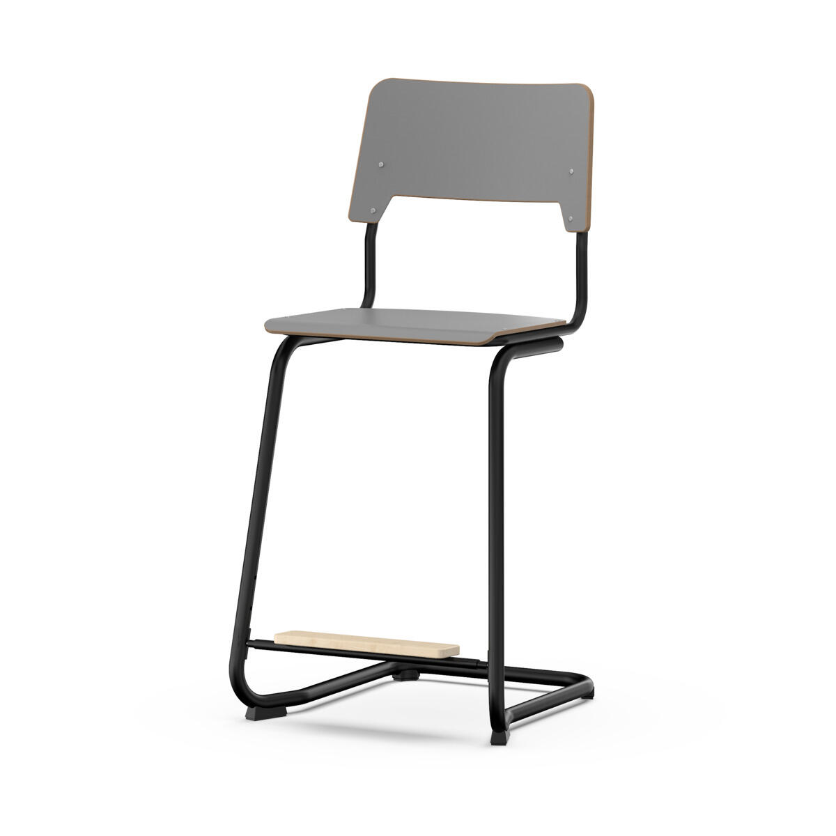 Elevstol med sete og rygg av kryssfiner med overflate av høytrykkslaminatSetet er buet, noe som gjør det behagelig å sitte på. Stativet er lakkert i sølv, RAL 9006. Føtter med filt. Stolen oppfyller kravene i henhold til EN 1729-1 & 2. En avstand mellom rygg og stativ gjør at stolen kan henges opp i ryggen. For å hindre skade på bordet ved oppheng er det montert sklibeskyttelse på ryggen. Avstanden gjør det også mulig å bruke stativet som en praktisk veskekrok. Regulerbar fotstøtte i tre faste høyder (26, 31 og 36 cm fra sete).