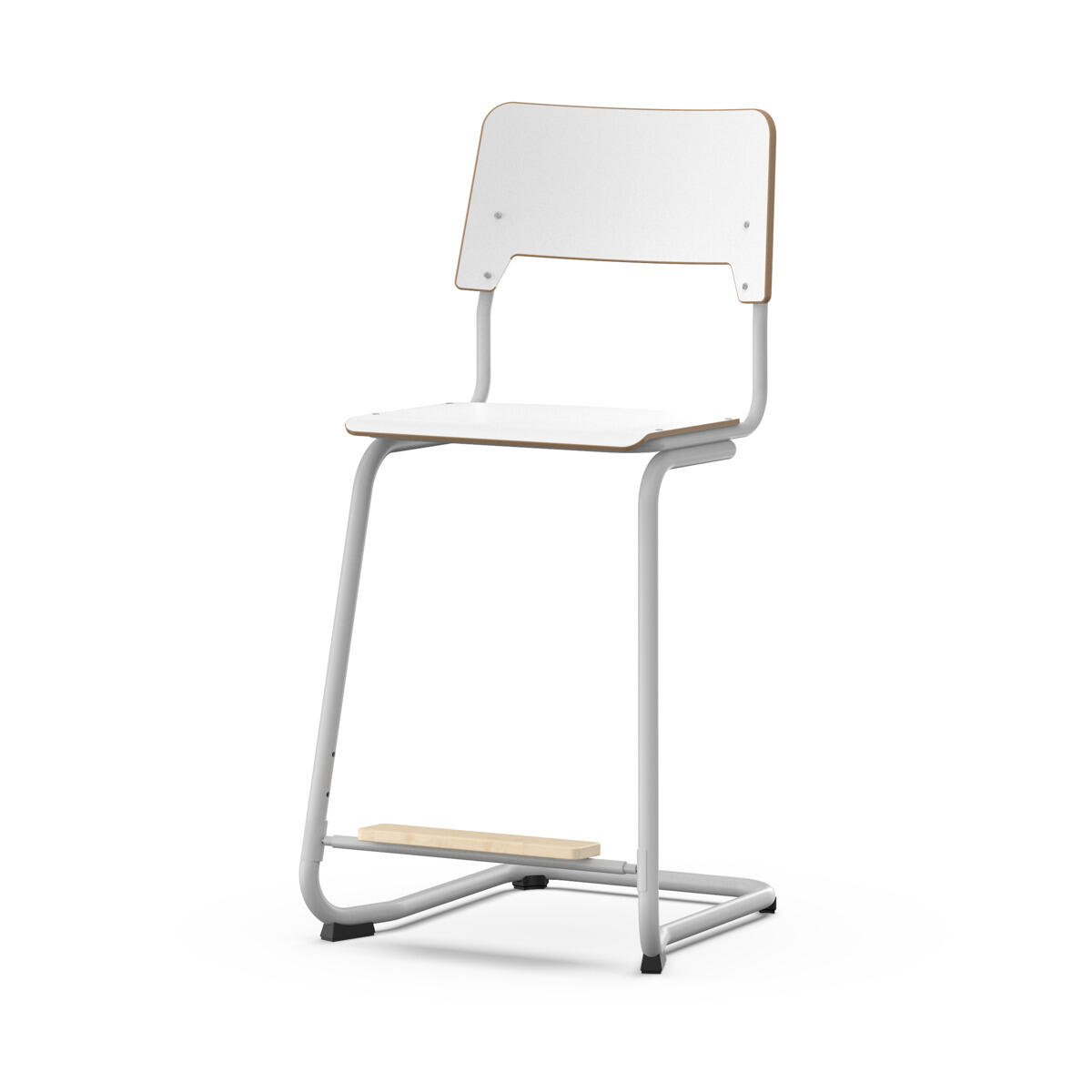Elevstol med sete og rygg av kryssfiner med overflate av høytrykkslaminatSetet er buet, noe som gjør det behagelig å sitte på. Stativet er lakkert i sølv, RAL 9006. Føtter med filt. Stolen oppfyller kravene i henhold til EN 1729-1 & 2. En avstand mellom rygg og stativ gjør at stolen kan henges opp i ryggen. For å hindre skade på bordet ved oppheng er det montert sklibeskyttelse på ryggen. Avstanden gjør det også mulig å bruke stativet som en praktisk veskekrok. Regulerbar fotstøtte i tre faste høyder (26, 31 og 36 cm fra sete).