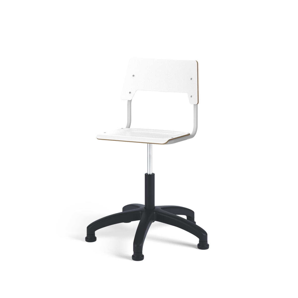 Sete og rygg er laget av kryssfiner med en overflate av høytrykkslaminat. Setet er skålformet, noe som gjør den behagelig å sitte på. Rammen for rygg og sete er lakkert i hvit, RAL9003. Utstyrt med gassdemping for regulering av sittehøyde ved hjelp av en spak. Svart nylonkryss med glideføtter. En avstand mellom rygg og stativ gjør det mulig å henge stolen på bordkanten via stolryggen. For å forhindre skader på bordet ved oppheng er glidebeskyttelse montert på ryggen. Avstanden kan brukes som veskekrok.