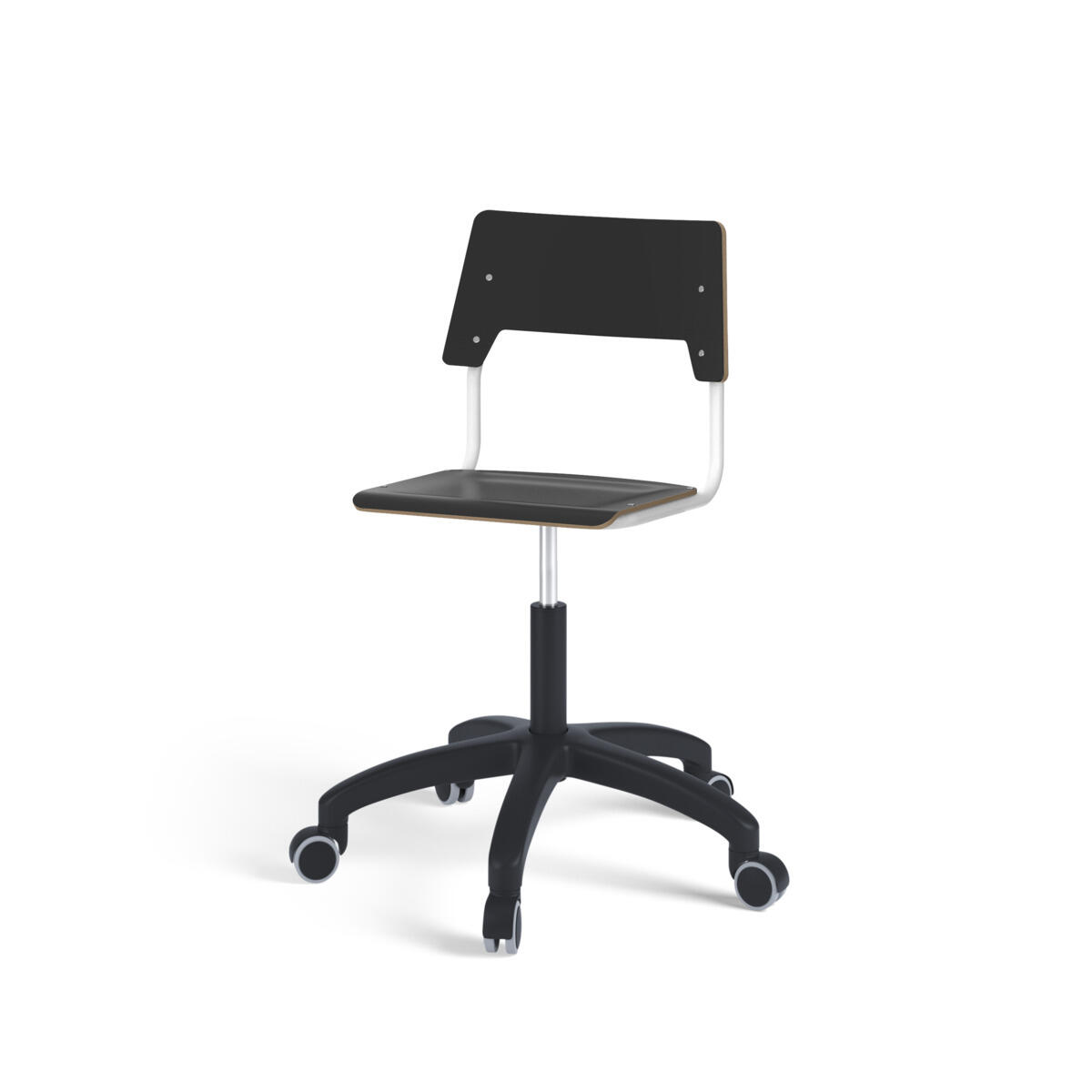 Sete og rygg er laget av kryssfiner med en overflate av høytrykkslaminat. Setet er skålformet, noe som gjør den behagelig å sitte på. Rammen for rygg og sete er lakkert i svart, RAL 9005. Utstyrt med gassdemping for regulering av sittehøyde ved hjelp av en spak. Svart nylonkryss med hjul. En avstand mellom rygg og stativ gjør det mulig å henge stolen på bordkanten via stolryggen. For å forhindre skader på bordet ved oppheng er glidebeskyttelse montert på ryggen. Avstanden kan brukes som veskekrok.