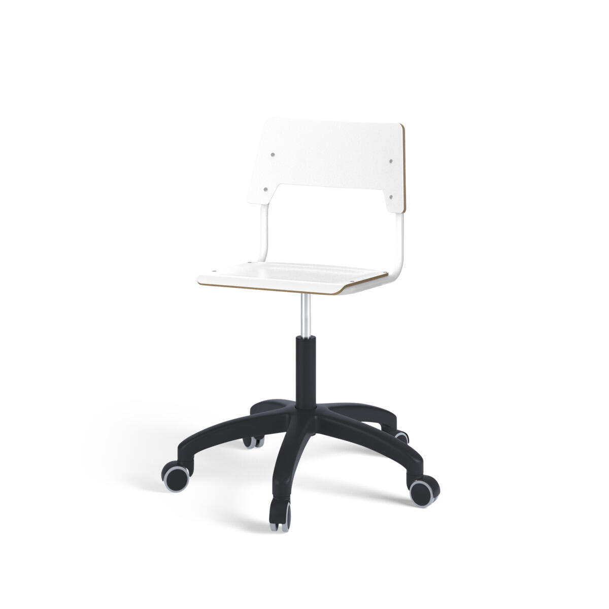 Sete og rygg er laget av kryssfiner med en overflate av høytrykkslaminat. Setet er skålformet, noe som gjør den behagelig å sitte på. Rammen for rygg og sete er lakkert i hvit, RAL9003. Utstyrt med gassdemping for regulering av sittehøyde ved hjelp av en spak. Svart nylonkryss med hjul. En avstand mellom rygg og stativ gjør det mulig å henge stolen på bordkanten via stolryggen. For å forhindre skader på bordet ved oppheng er glidebeskyttelse montert på ryggen. Avstanden kan brukes som veskekrok.