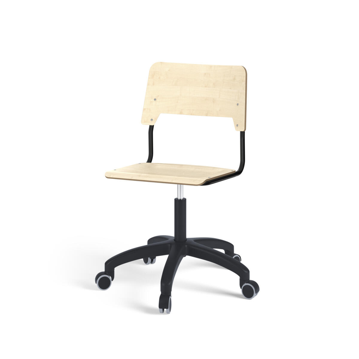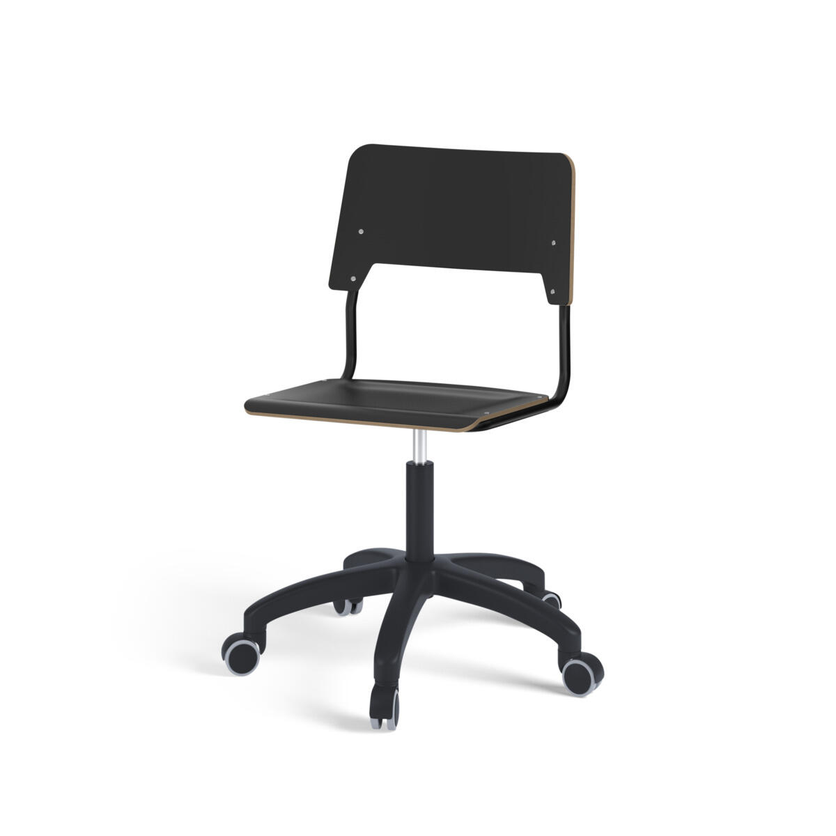 Sete og rygg er laget av kryssfiner med en overflate av høytrykkslaminat. Setet er skålformet, noe som gjør den behagelig å sitte på. Rammen for rygg og sete er lakkert i svart, RAL 9005. Utstyrt med gassdemping for regulering av sittehøyde ved hjelp av en spak. Svart nylonkryss med hjul. En avstand mellom rygg og stativ gjør det mulig å henge stolen på bordkanten via stolryggen. For å forhindre skader på bordet ved oppheng er glidebeskyttelse montert på ryggen. Avstanden kan brukes som veskekrok.