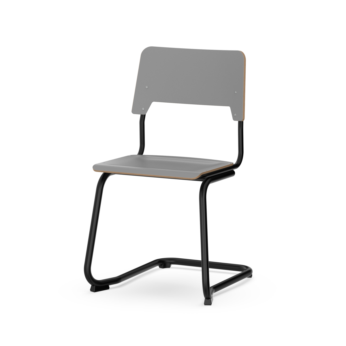 Elevstol med sete og rygg av kryssfiner med overflate av høytrykkslaminat. Setet er buet, noe som gjør det behagelig å sitte på. Stativet er lakkert i svart, RAL 9005. Føtter med filt. Stolen oppfyller kravene i henhold til EN 1729-1 & 2. En avstand mellom rygg og stativ gjør at stolen kan henges opp i ryggen. For å hindre skade på bordet ved oppheng er det montert sklibeskyttelse på ryggen. Avstanden gjør det også mulig å bruke stativet som en praktisk veskekrok