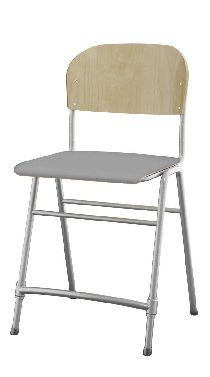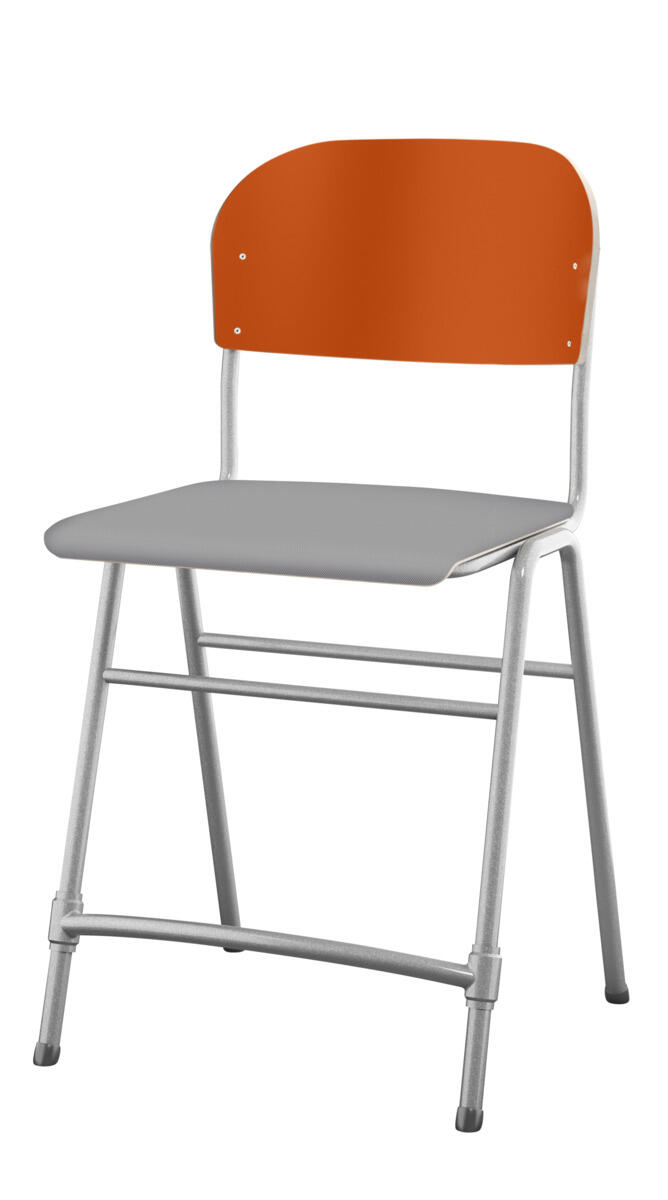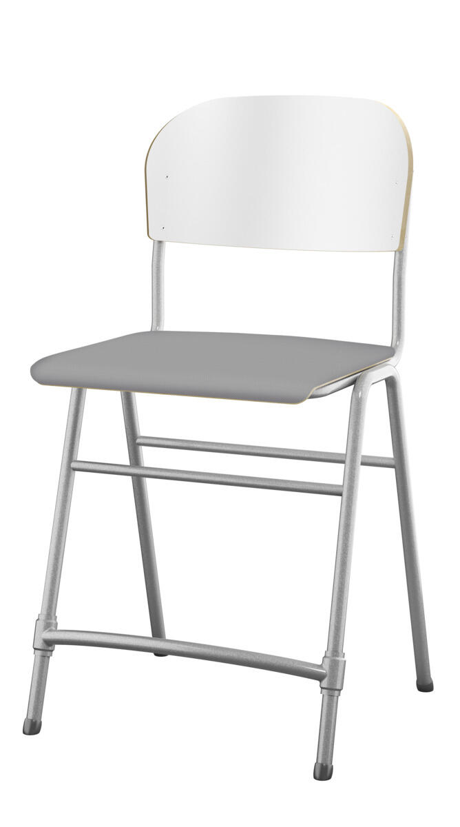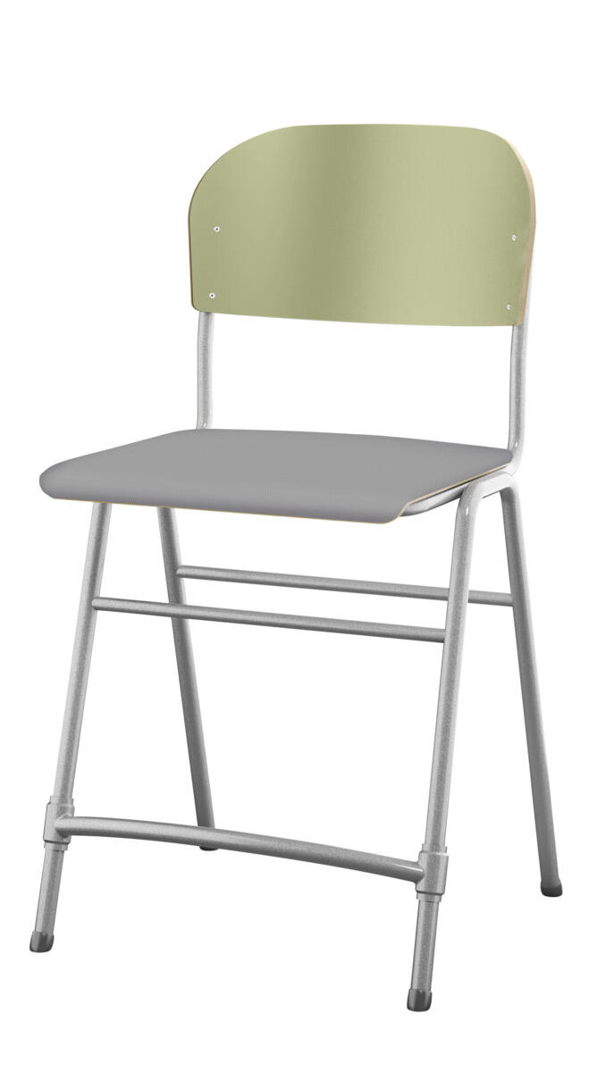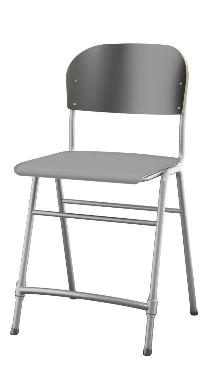 Sete og rygg i høytrykkslaminat. Epoxylakkert understell i sølv RAL 9006. Regulerbart fotbrett. Sittehøyde 65 cm, setemål: 36x35 cm. Vekt 5,3 kg. Kan stables. Støydempende føtter.