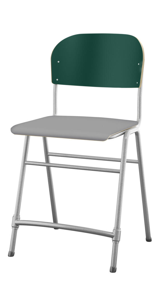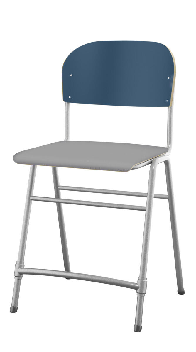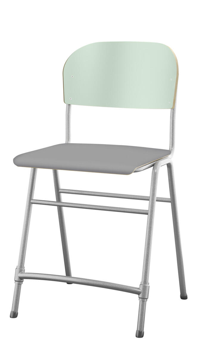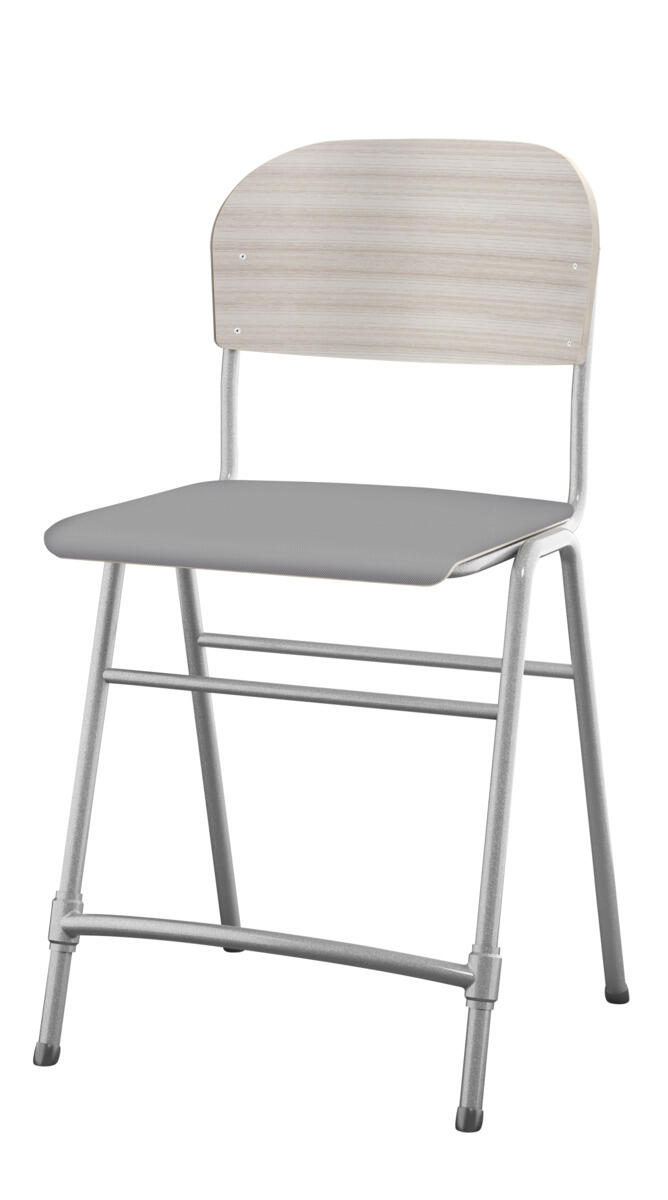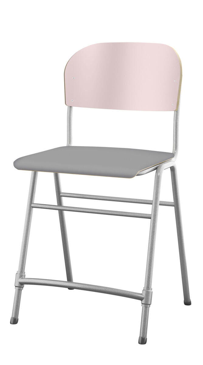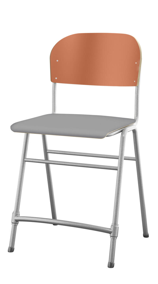 Sete og rygg i høytrykkslaminat. Epoxylakkert understell i sølv RAL 9006. Regulerbart fotbrett. Sittehøyde 65 cm, setemål: 36x35 cm. Vekt 5,3 kg. Kan stables. Støydempende føtter.