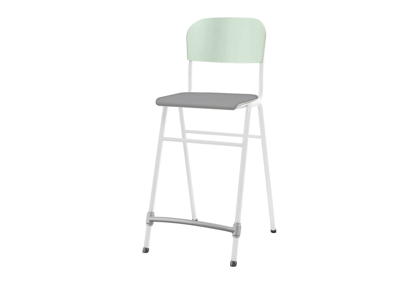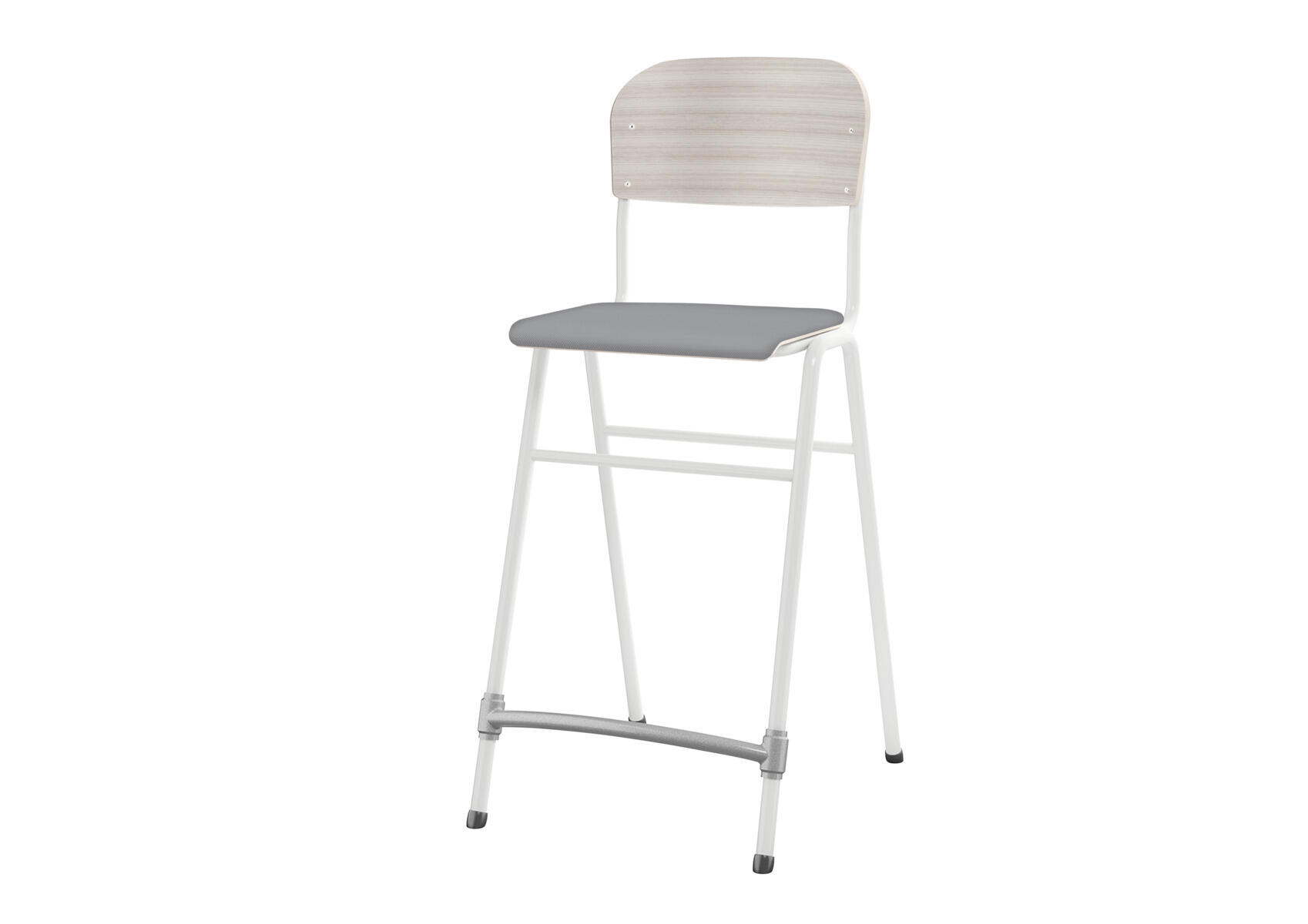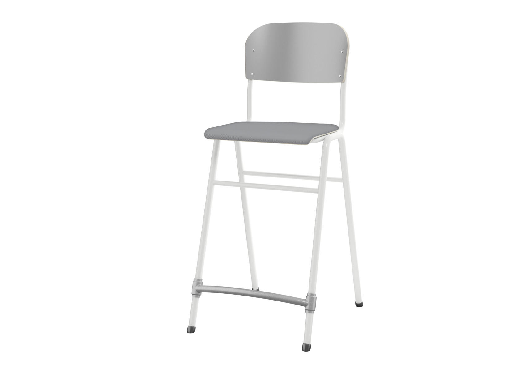 Sete og rygg i høytrykkslaminat. Epoxylakkert understell i sølv RAL 9006. Regulerbart fotbrett. Sittehøyde 65 cm, setemål: 36x35 cm. Vekt 5,3 kg. Kan stables. Støydempende føtter.
