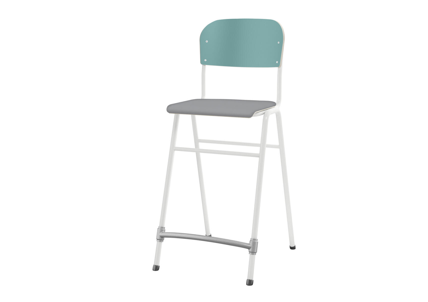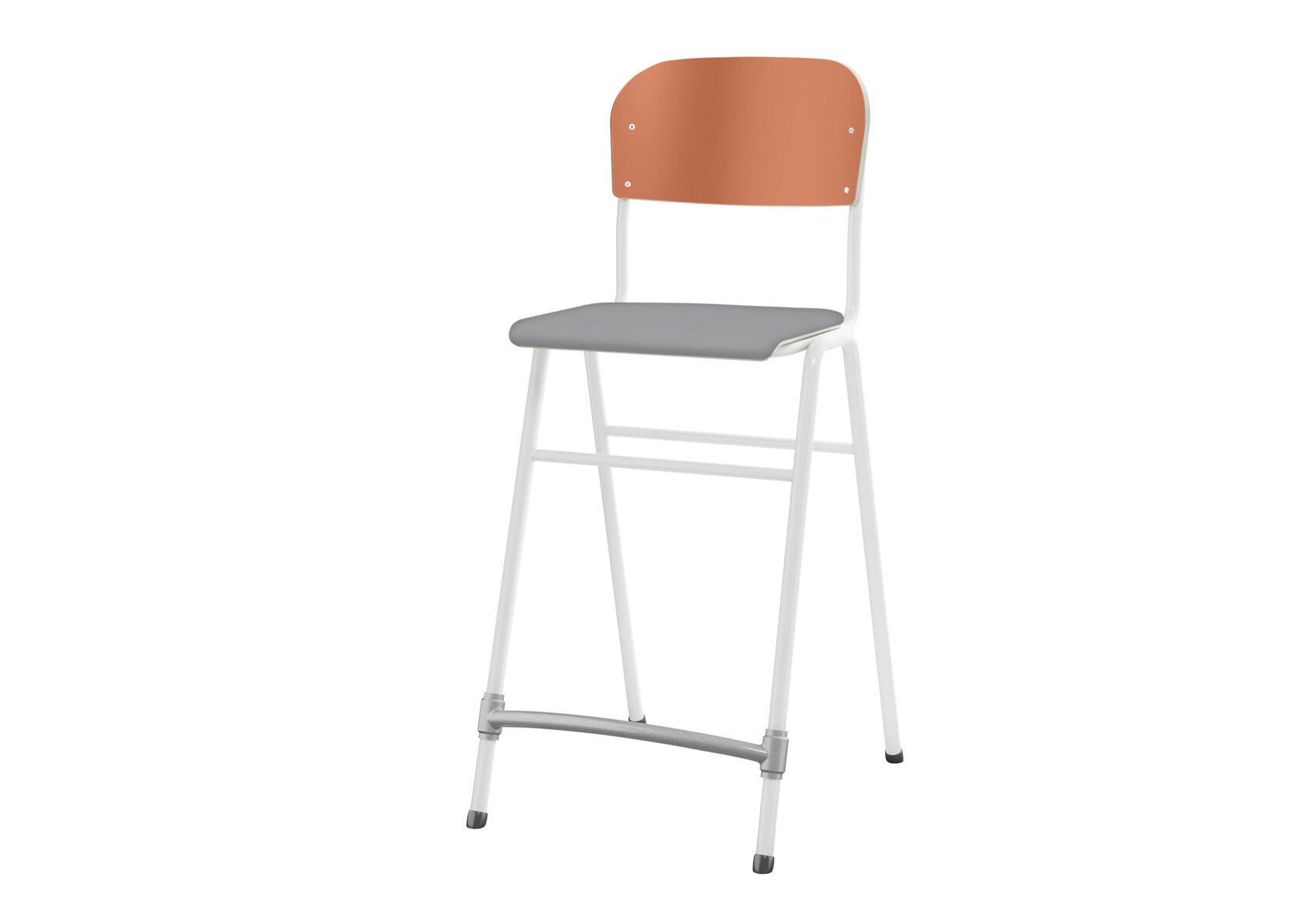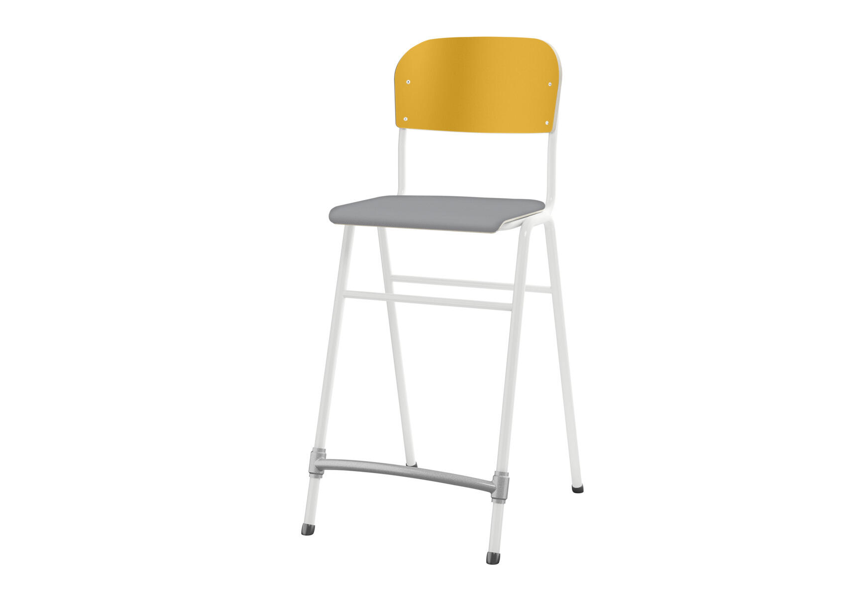 Sete og rygg i høytrykkslaminat. Epoxylakkert understell i sølv RAL 9006. Regulerbart fotbrett. Sittehøyde 65 cm, setemål: 36x35 cm. Vekt 5,3 kg. Kan stables. Støydempende føtter.