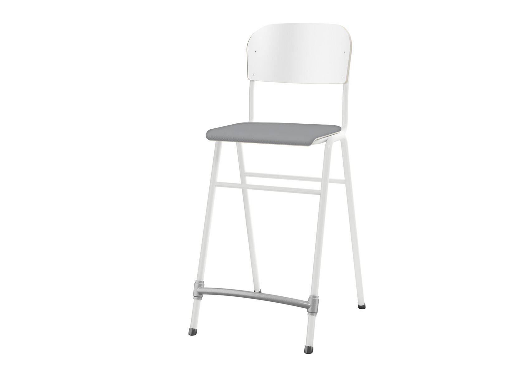 Kan stables, maks 4 stoler i høyden. Støydempende føtter. Regulerbart fotbrett. Sete og rygg i høytrykkslaminat. Epoxylakkert understell hvit RAL 9003. Sittehøyde 65 cm. Setemål: 36x35 cm. Vekt 5,3 kg.
