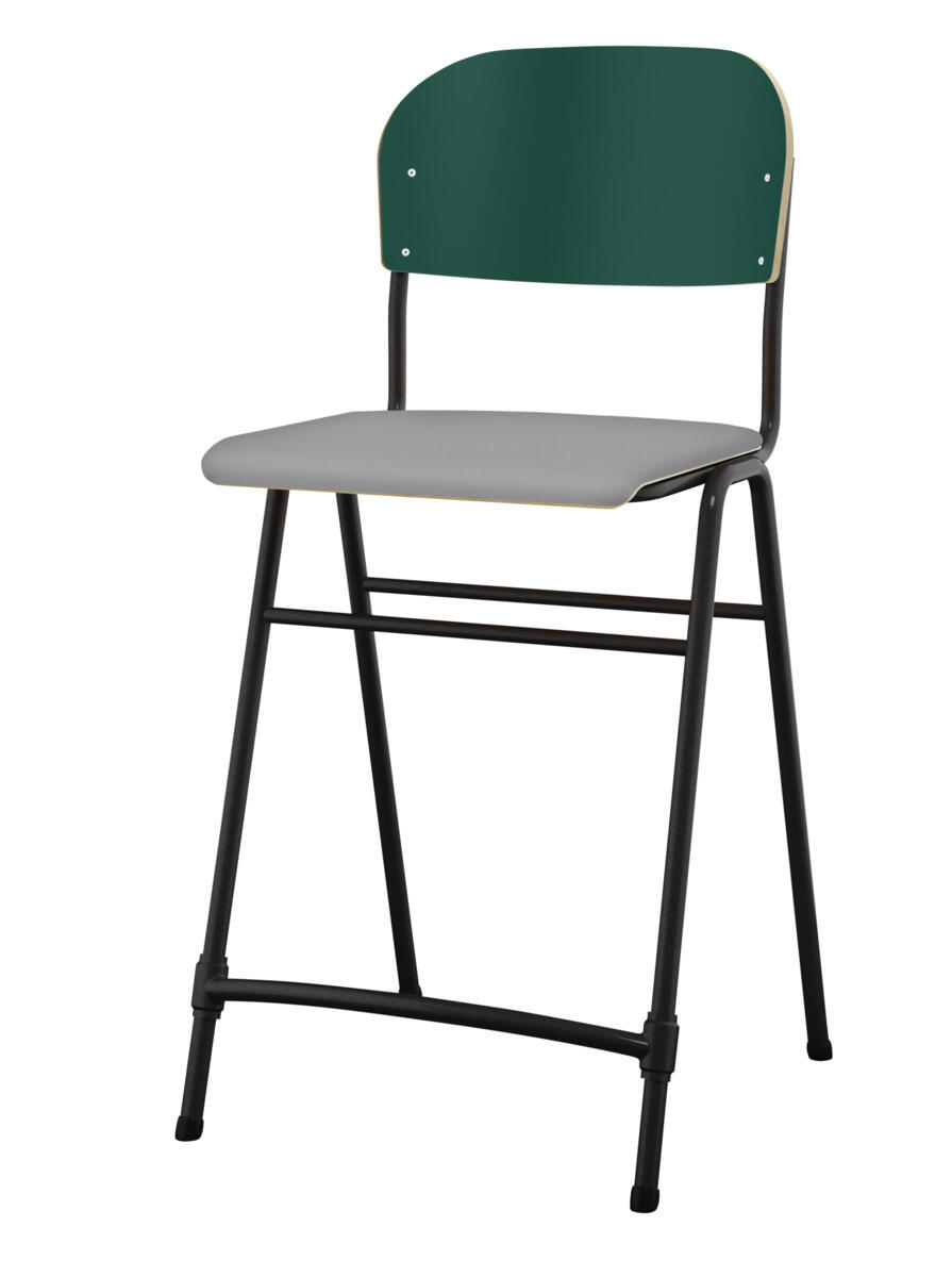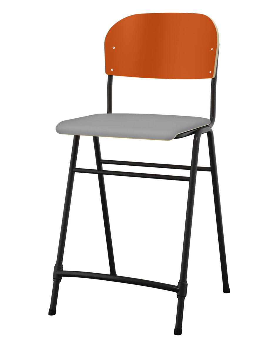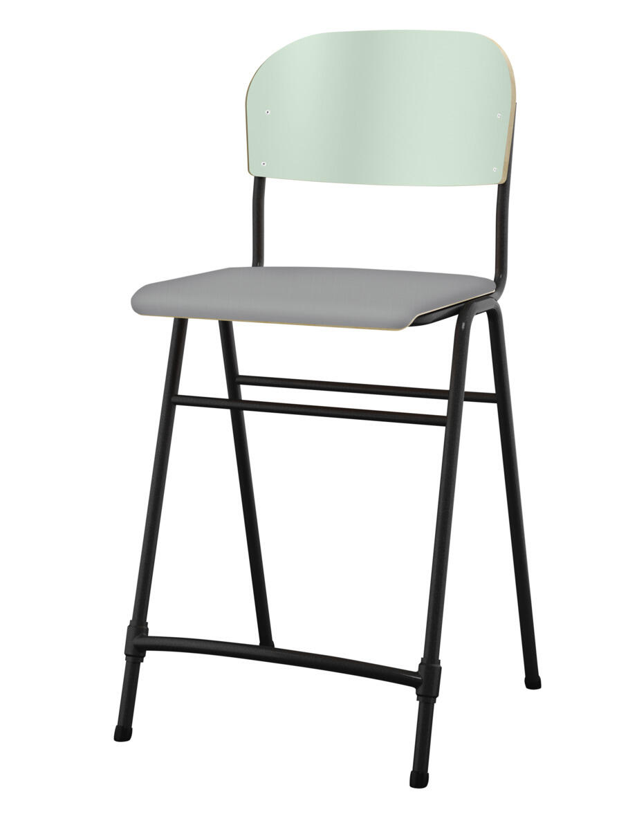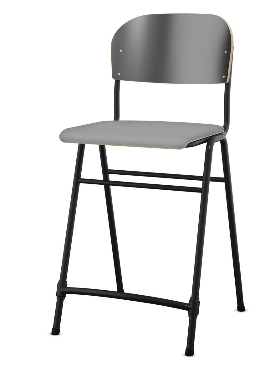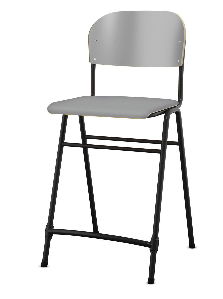 Sete og rygg belagt med høytrykkslaminat. Epoxylakkert understell i sølv RAL 9006. Stillbar i høydene 38, 43, 46 og 51 cm. Setebredde 42 cm, sittedybde 39 cm. Vekt 5 kg. Justerbare føtter.