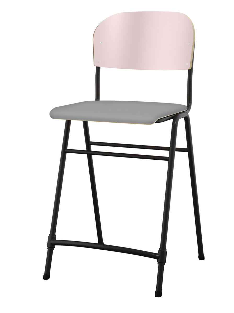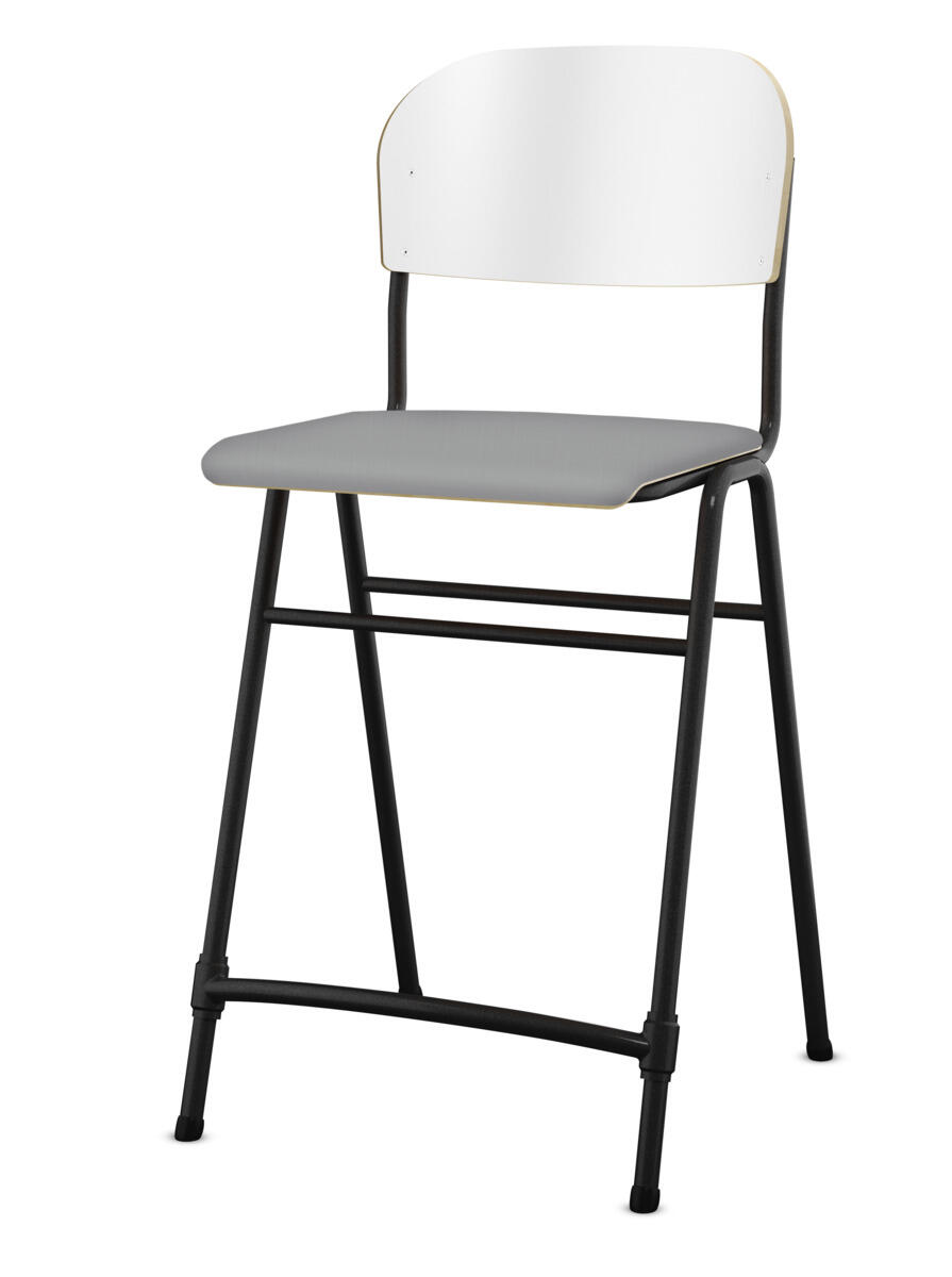 Støydempende føtter. Kan henges på bord. Kan stables (maks 4 stoler i høyden) Regulerbart fotbrett i 3 høyder. Sete og rygg i høytrykkslaminat. Hvitlakkert understell RAL 9016. Sittehøyde 63 cm. Setemål: 36x35 cm. Totaldybde på understell 54 cm. Vekt 6,8 kg.