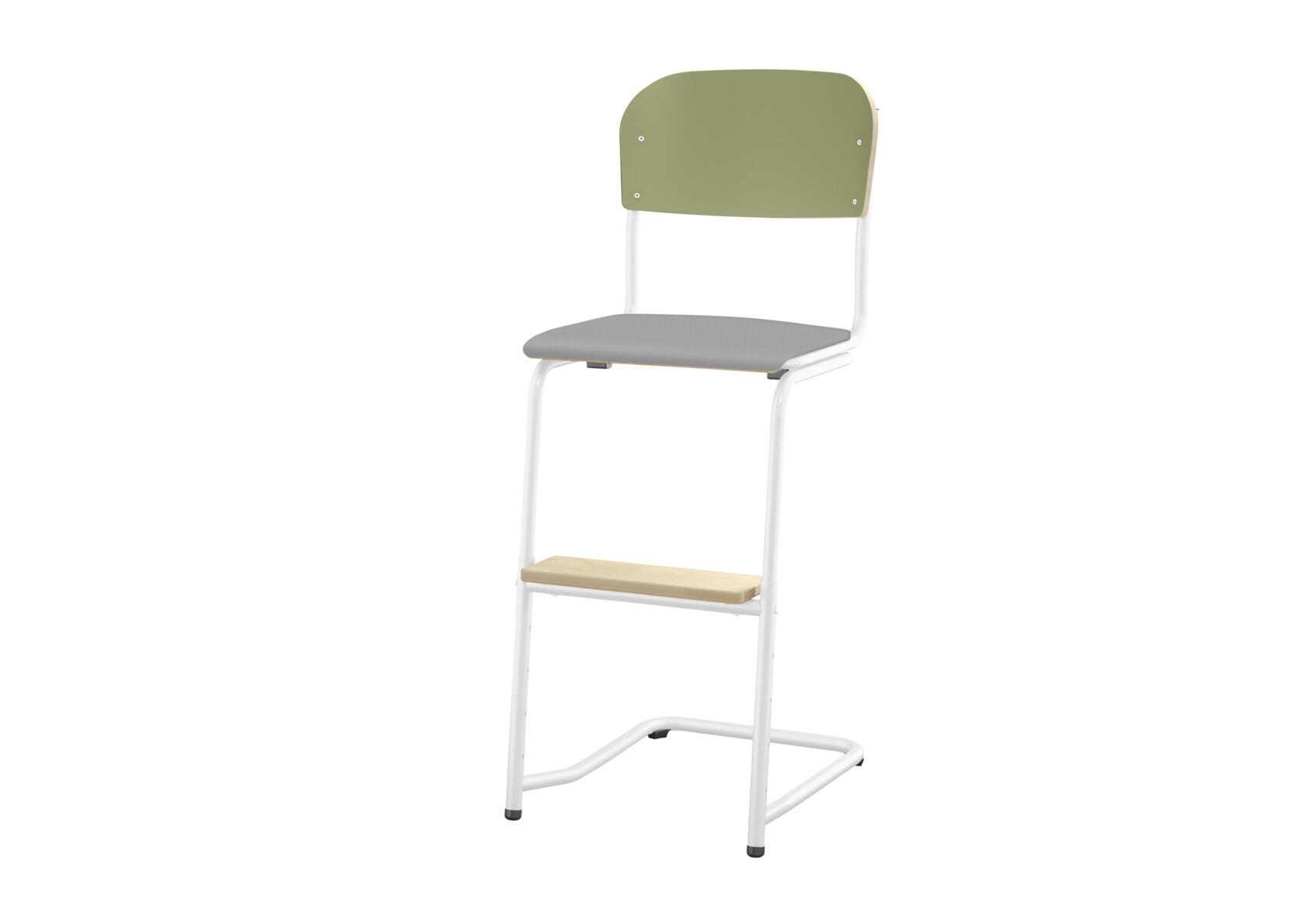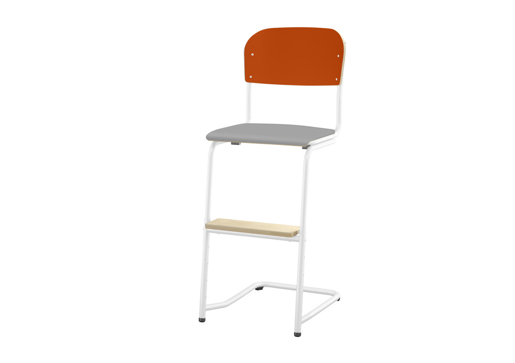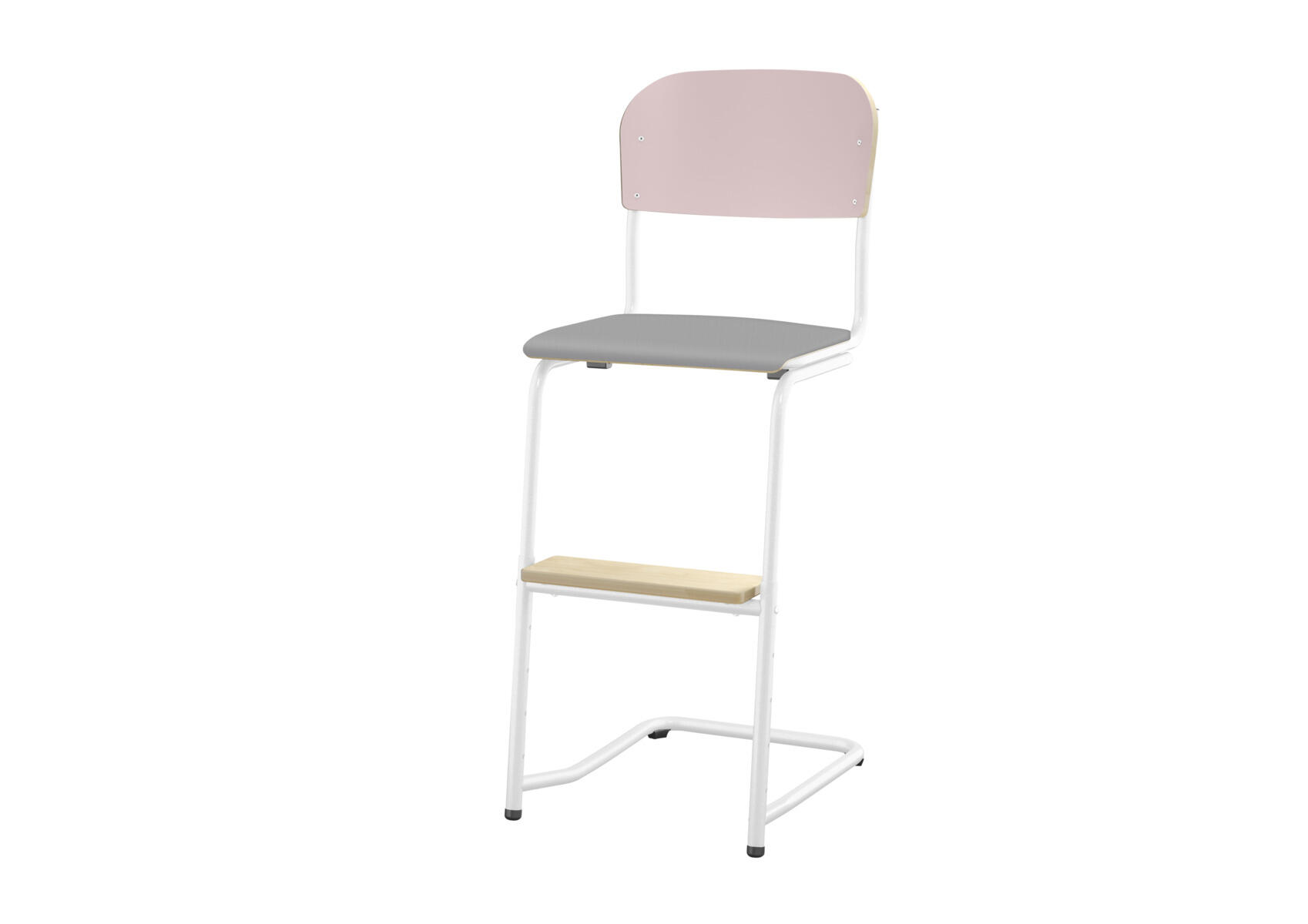 En god stol som kan stables 4 stoler i høyden og er enkel å henge opp på bodet. Stillbar i 4 høyder 45, 51, 57 og 63 cm. Sete og rygg i høytrykkslaminat. Med fotstøtte. OBS! Øvre del av stolen skal alltid ha 2 hull i nedre rørdel. Stort sete. Maks sittehøyde er 63cm.