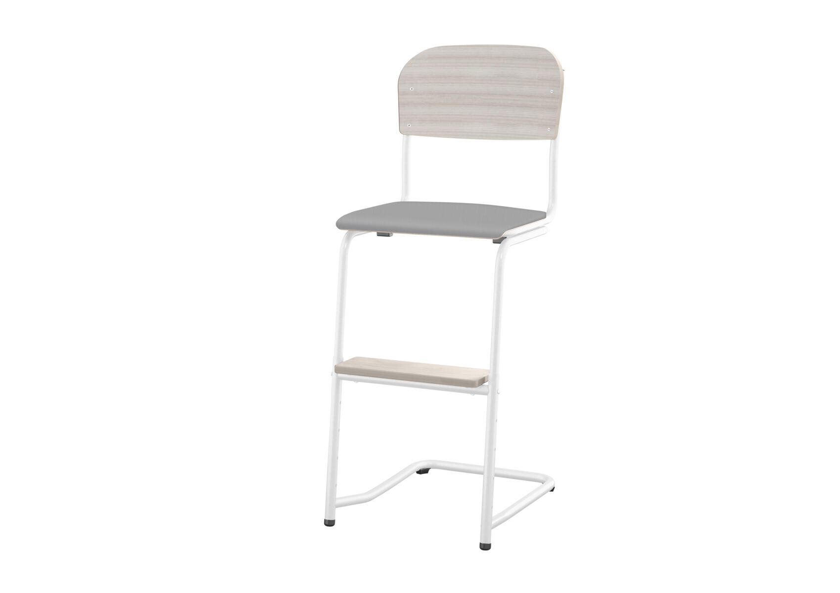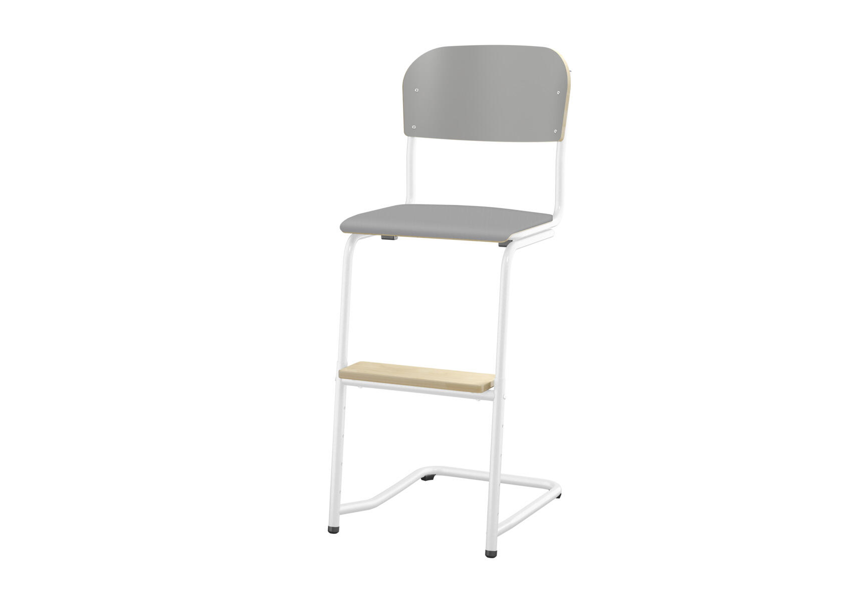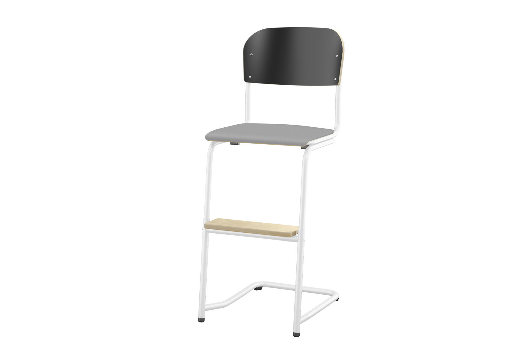 En god stol som kan stables 4 stoler i høyden og er enkel å henge opp på bodet. Stillbar i 4 høyder 45, 51, 57 og 63 cm. Sete og rygg i høytrykkslaminat. Med fotstøtte. OBS! Øvre del av stolen skal alltid ha 2 hull i nedre rørdel. Maks sittehøyde er 63cm.
