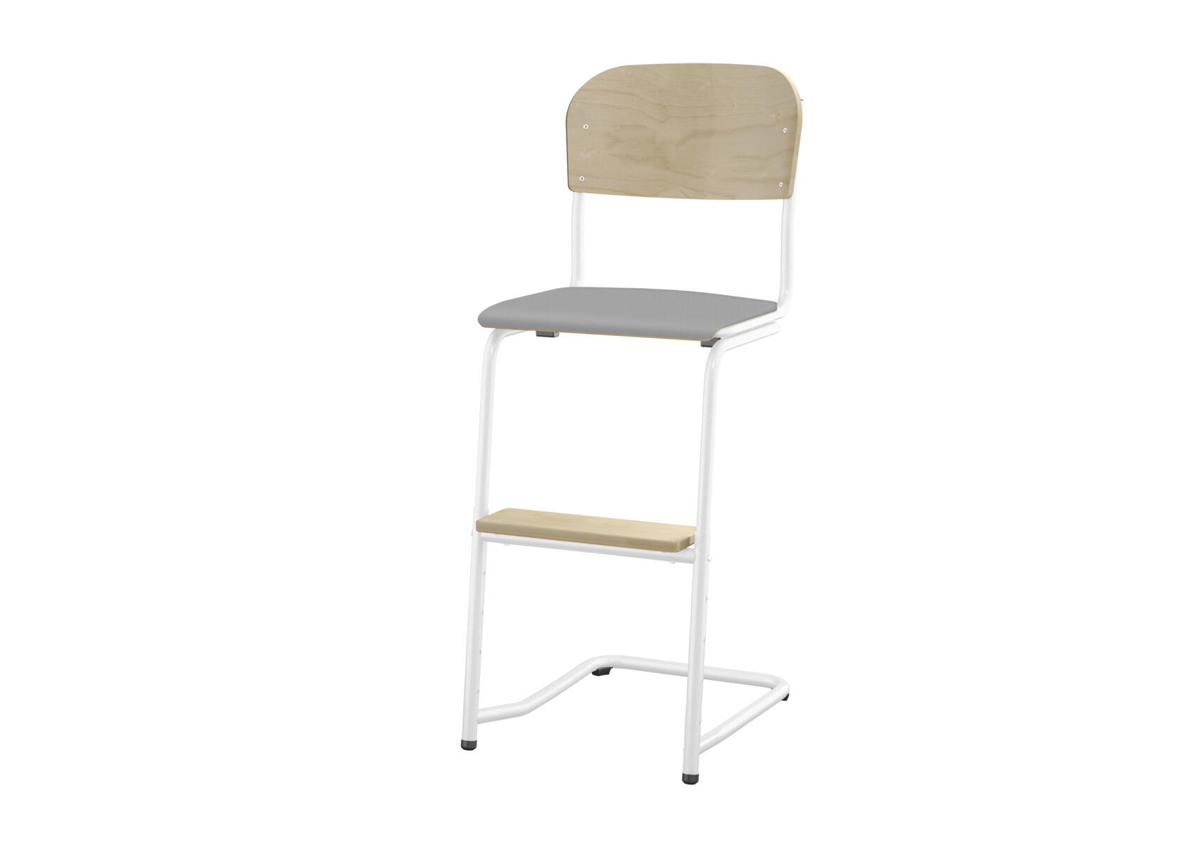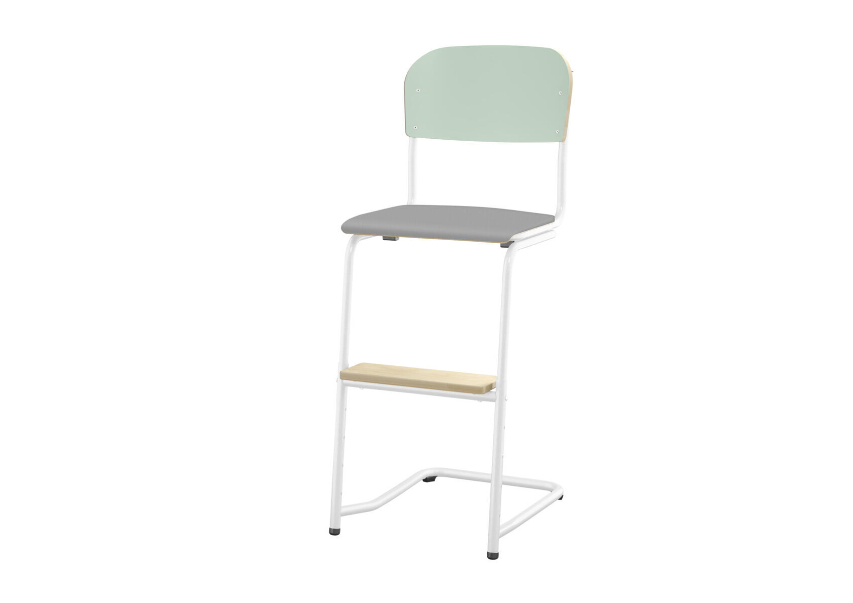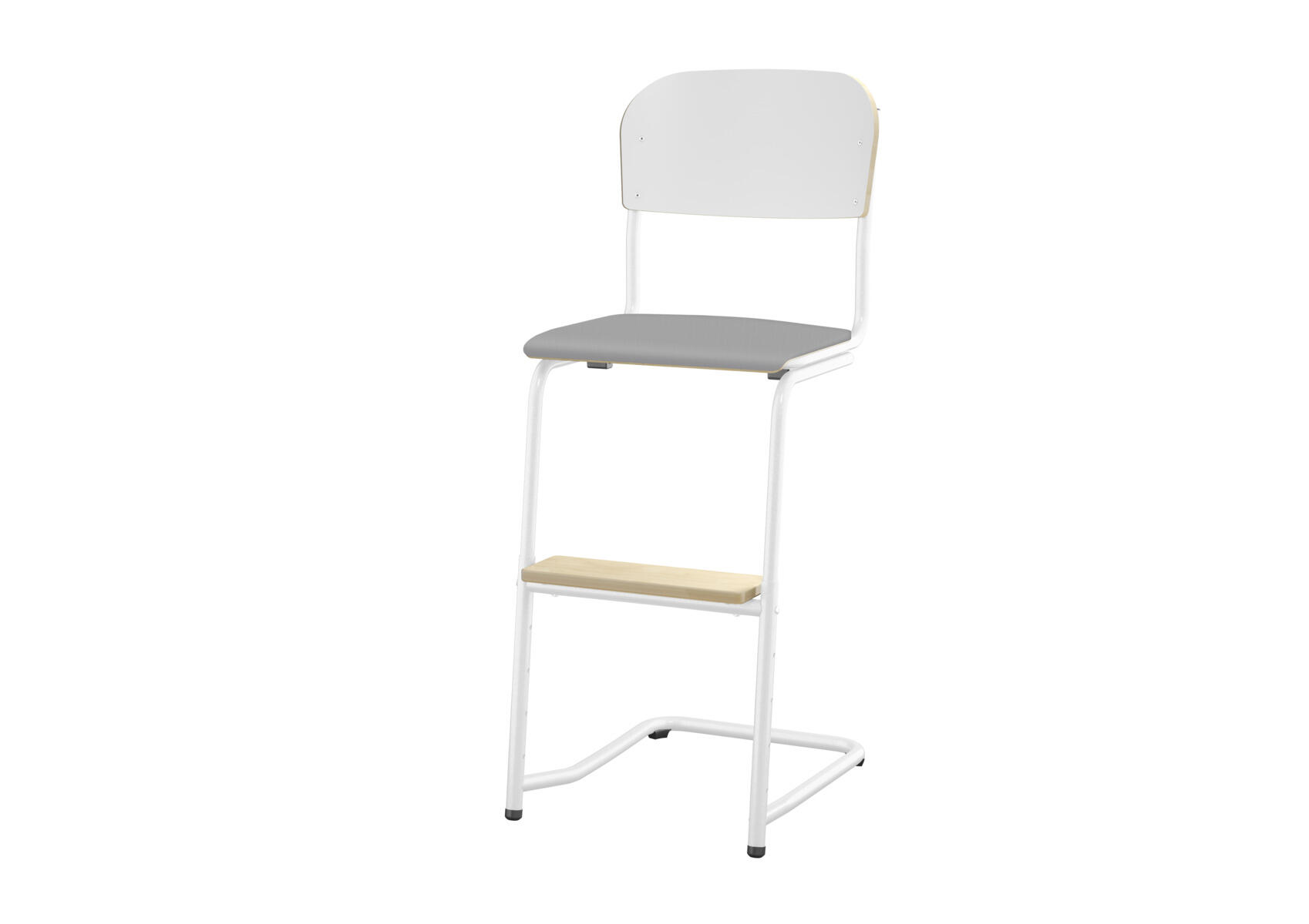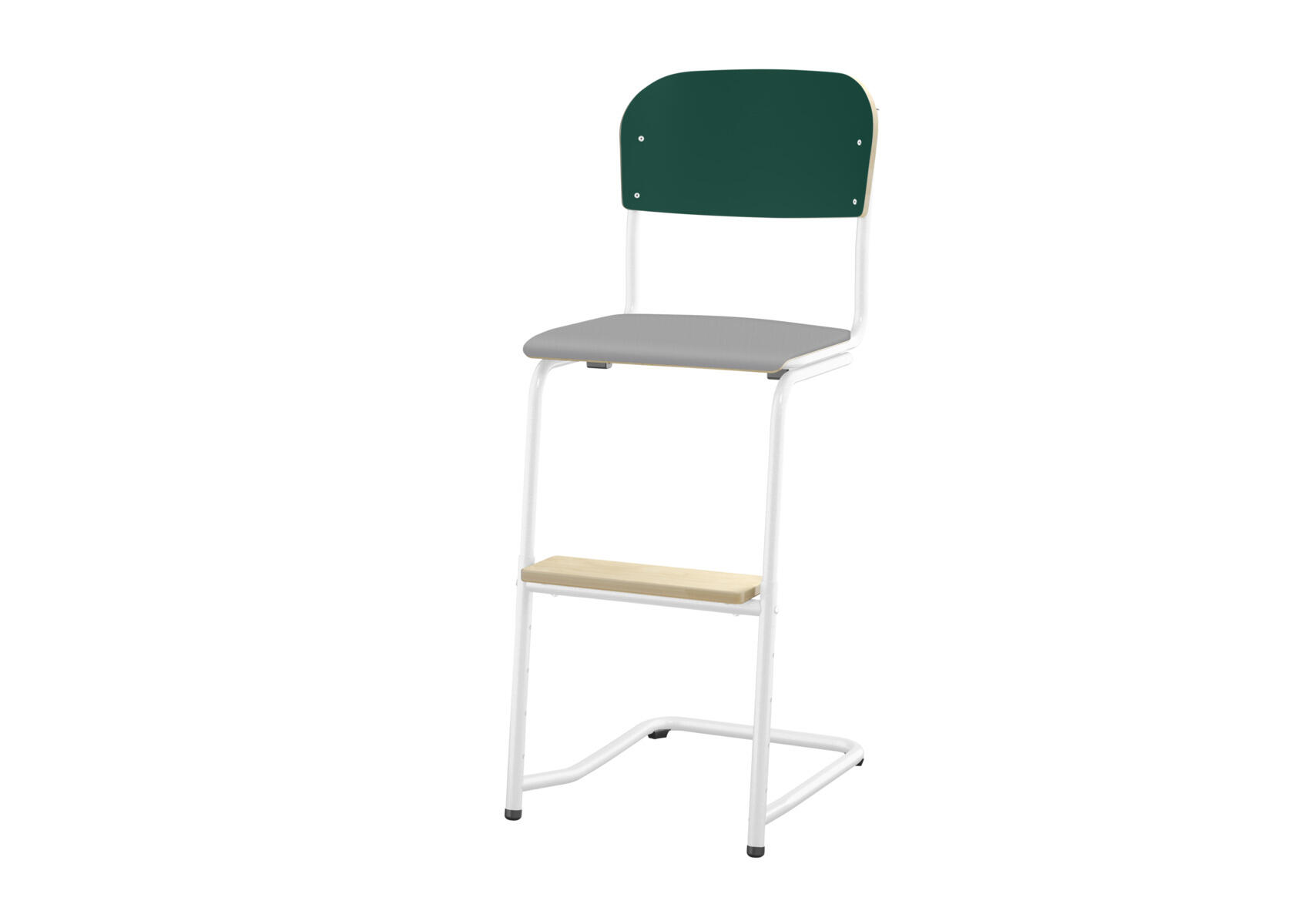 En god stol som kan stables 4 stoler i høyden og er enkel å henge opp på bodet. Stillbar i 4 høyder 45, 51, 57 og 63 cm. Sete og rygg i høytrykkslaminat. Med fotstøtte. OBS! Øvre del av stolen skal alltid ha 2 hull i nedre rørdel. Maks sittehøyde er 63cm.