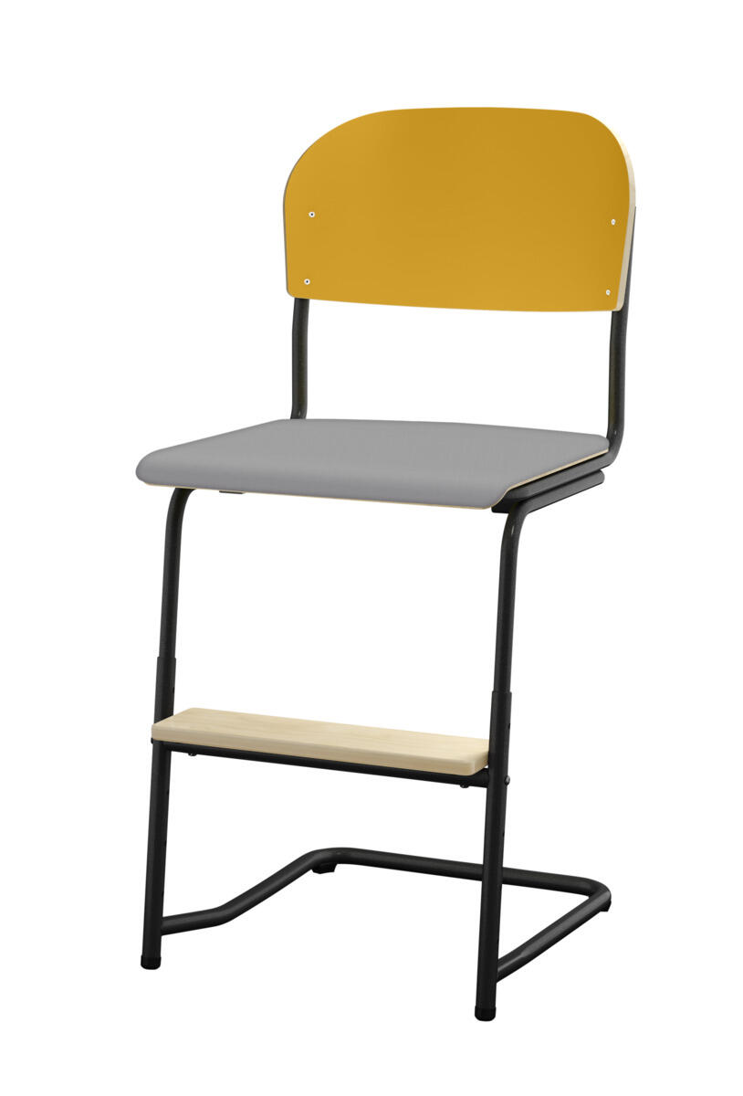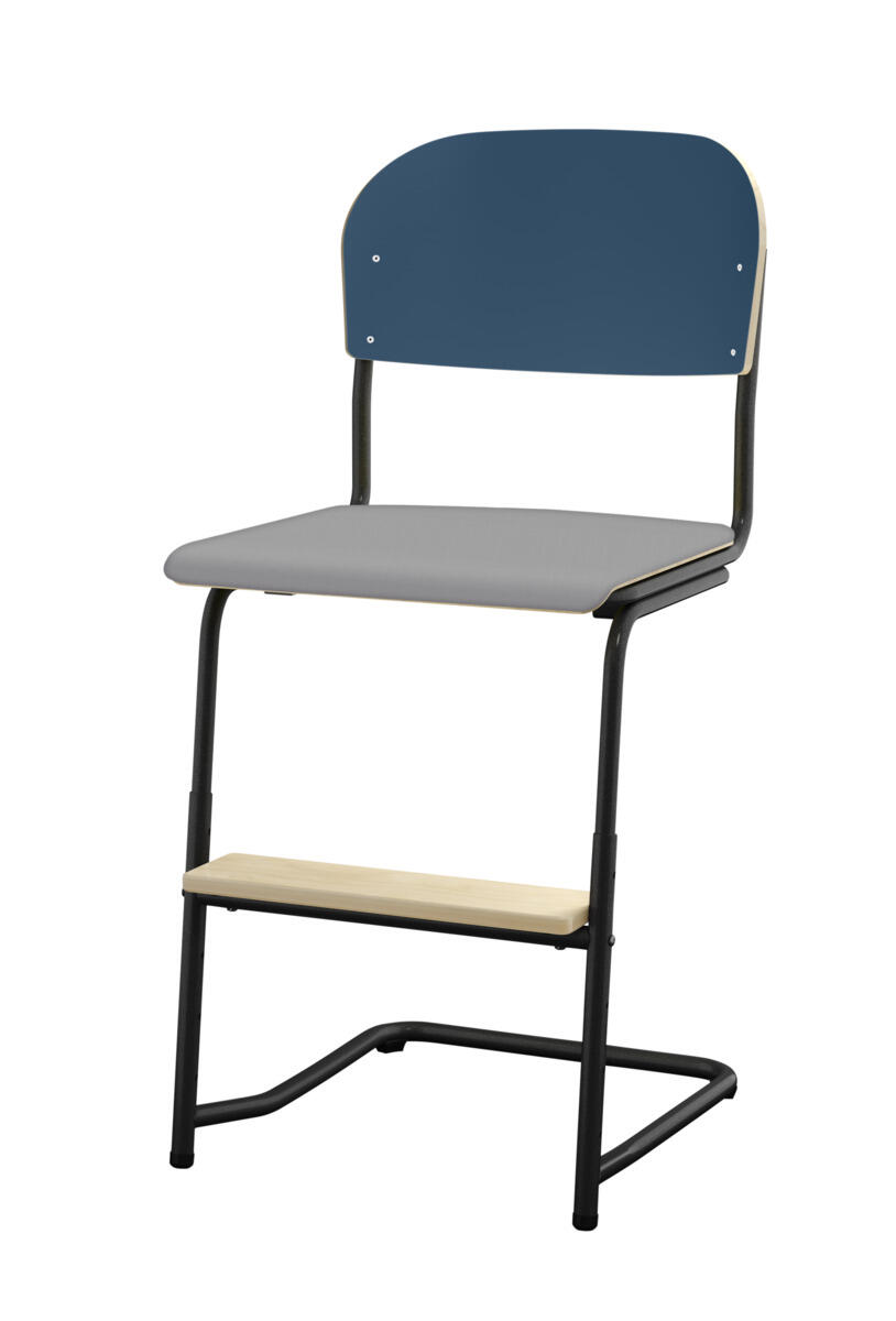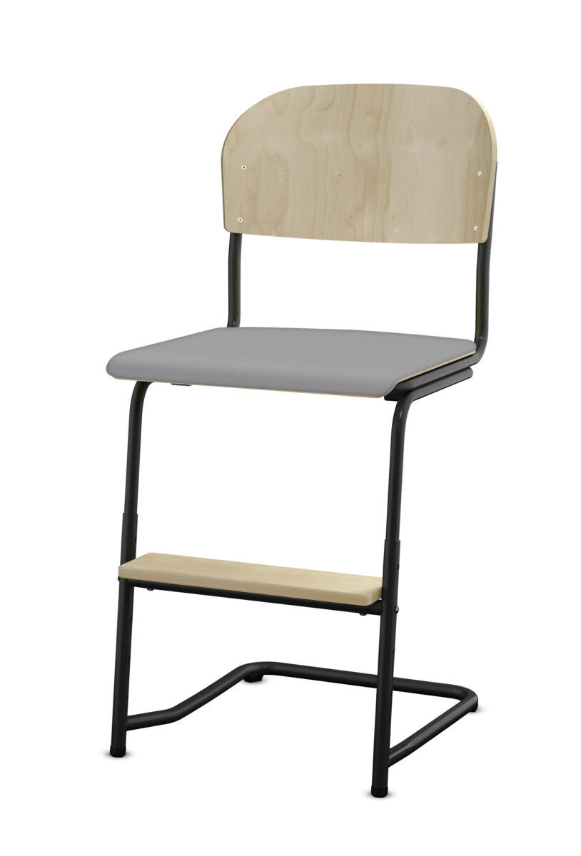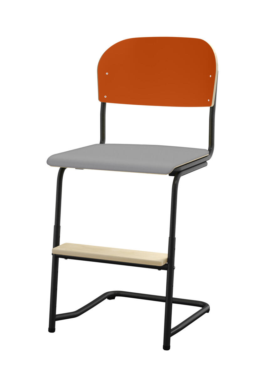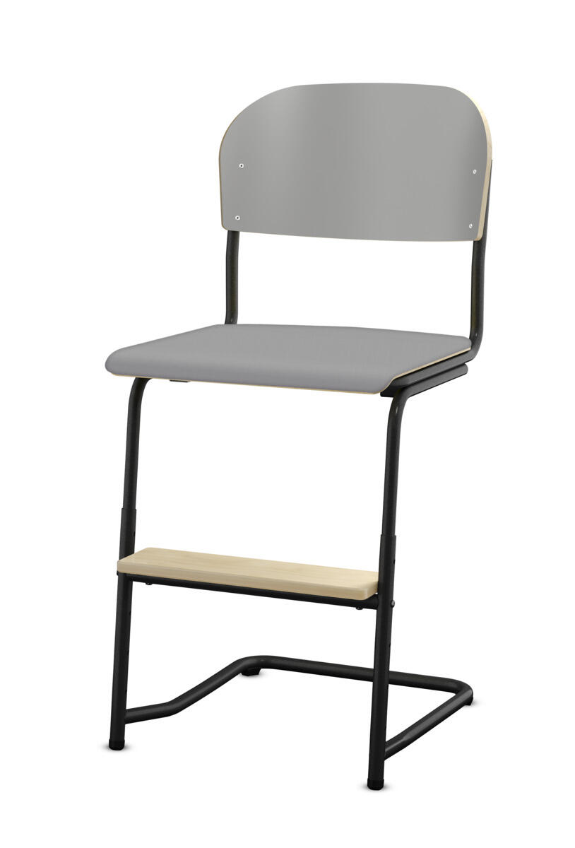 En god stol som kan stables 4 stoler i høyden og er enkel å henge opp på bodet. Stillbar i 4 høyder 45, 51, 57 og 63 cm. Sete og rygg i høytrykkslaminat. Med fotstøtte. OBS! Øvre del av stolen skal alltid ha 2 hull i nedre rørdel. Stort sete. Maks sittehøyde er 63cm.