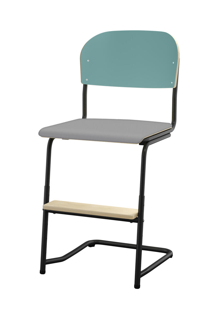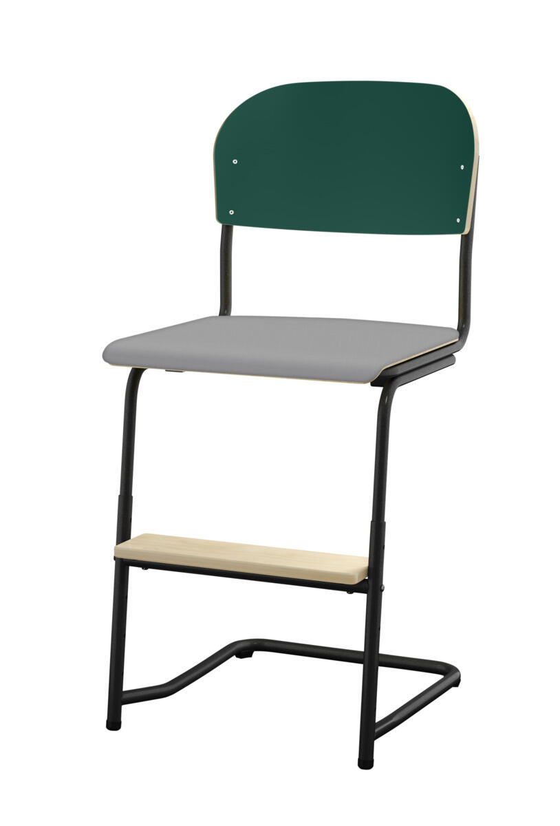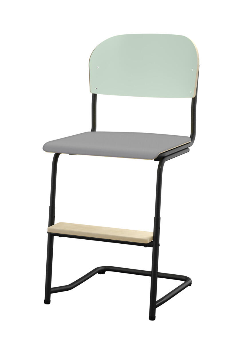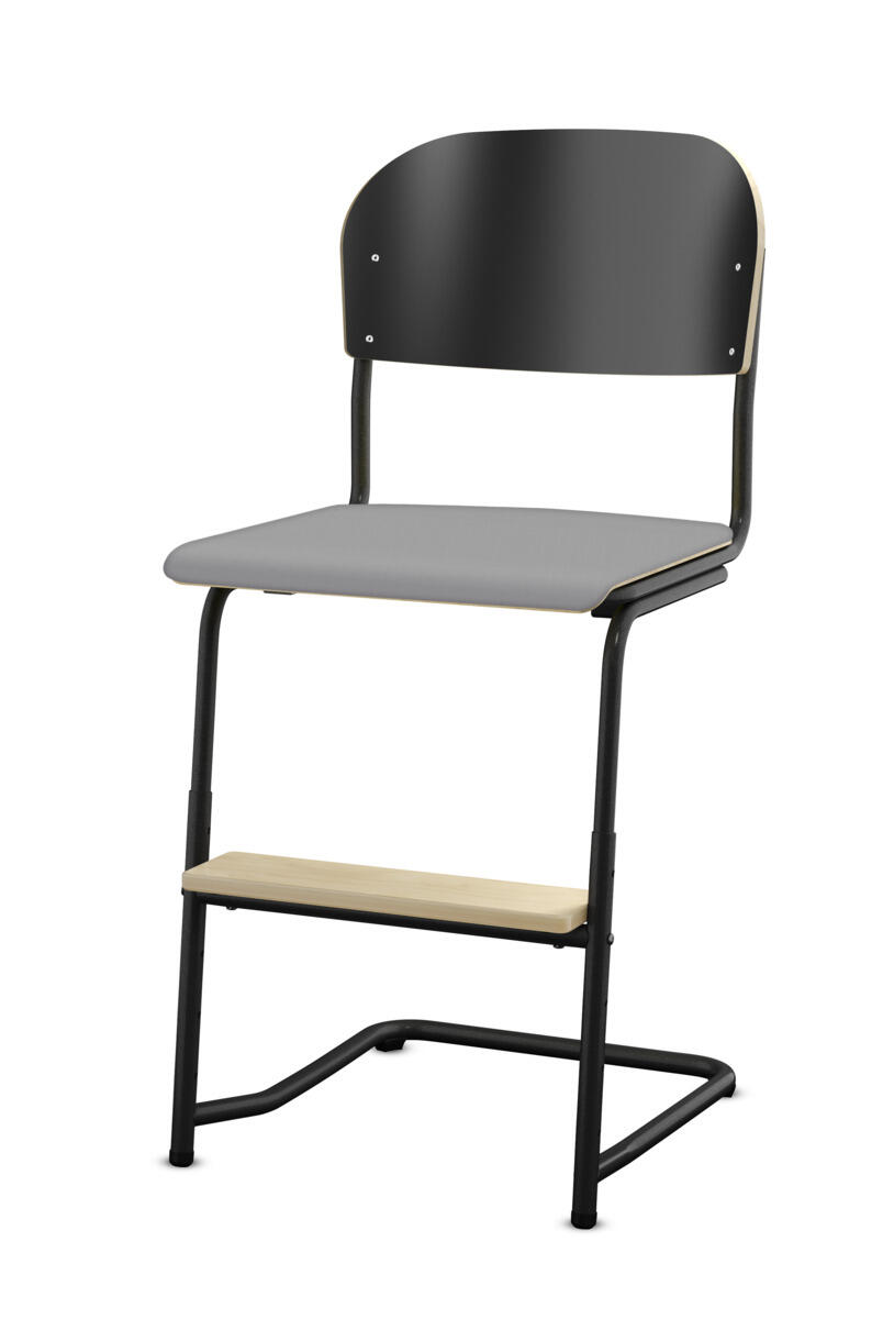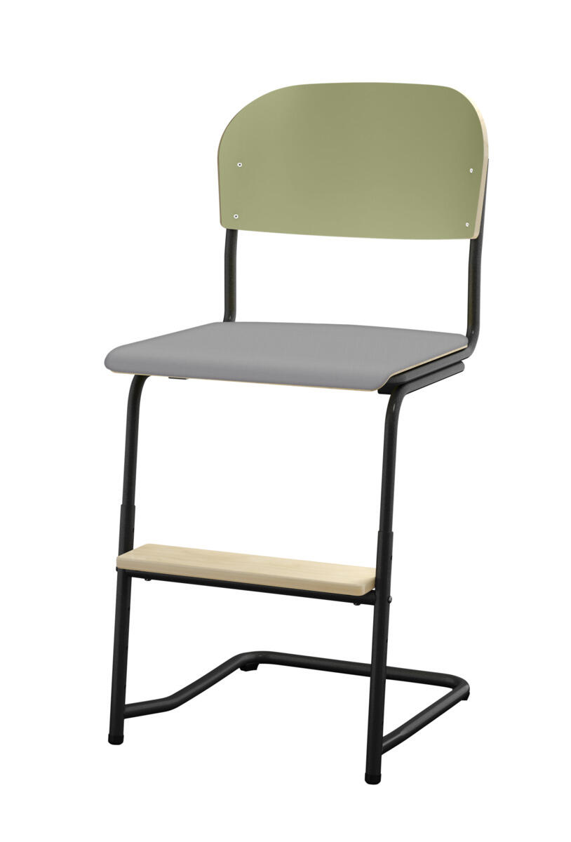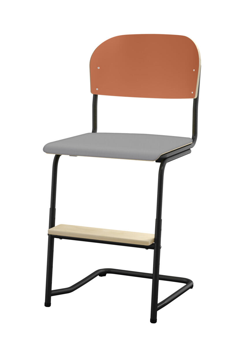En god stol som kan stables 4 stoler i høyden og er enkel å henge opp på bodet. Stillbar i 4 høyder 45, 51, 57 og 63 cm. Sete og rygg i høytrykkslaminat. Med fotstøtte. OBS! Øvre del av stolen skal alltid ha 2 hull i nedre rørdel. Stort sete. Maks sittehøyde er 63cm.