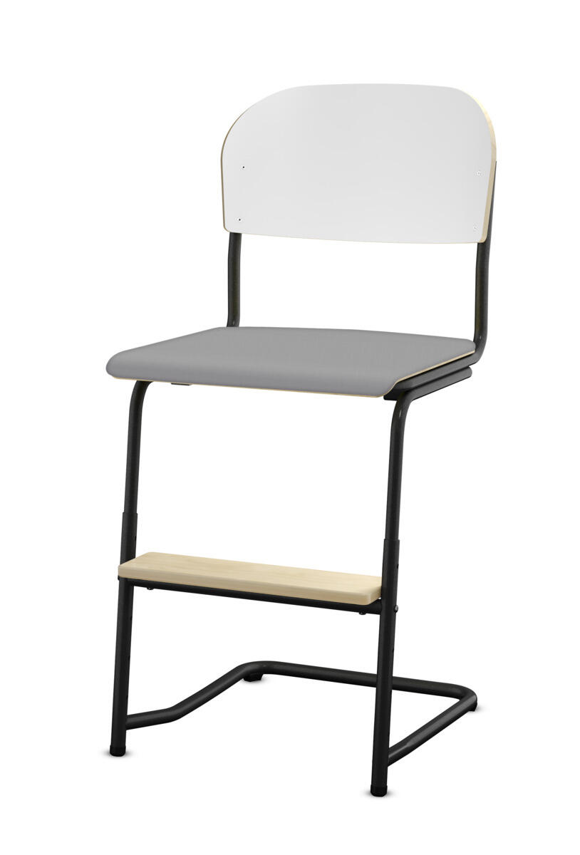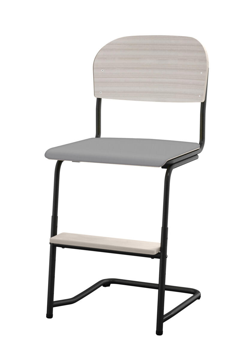 En god stol som kan stables 4 stoler i høyden og er enkel å henge opp på bodet. Stillbar i 4 høyder 45, 51, 57 og 63 cm. Sete og rygg i høytrykkslaminat. Med fotstøtte. OBS! Øvre del av stolen skal alltid ha 2 hull i nedre rørdel. Maks sittehøyde er 63cm.
