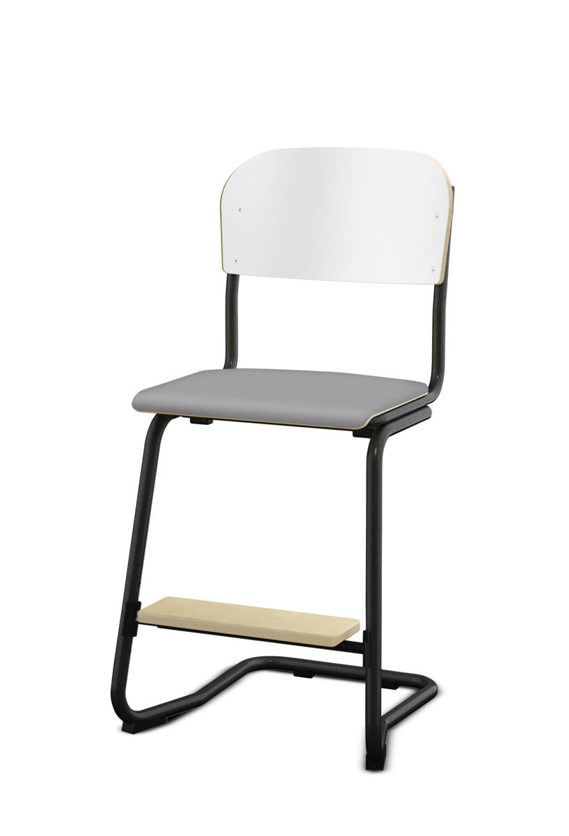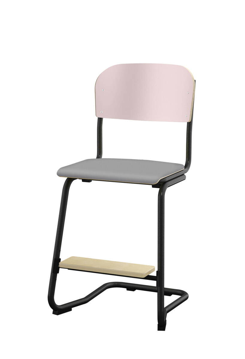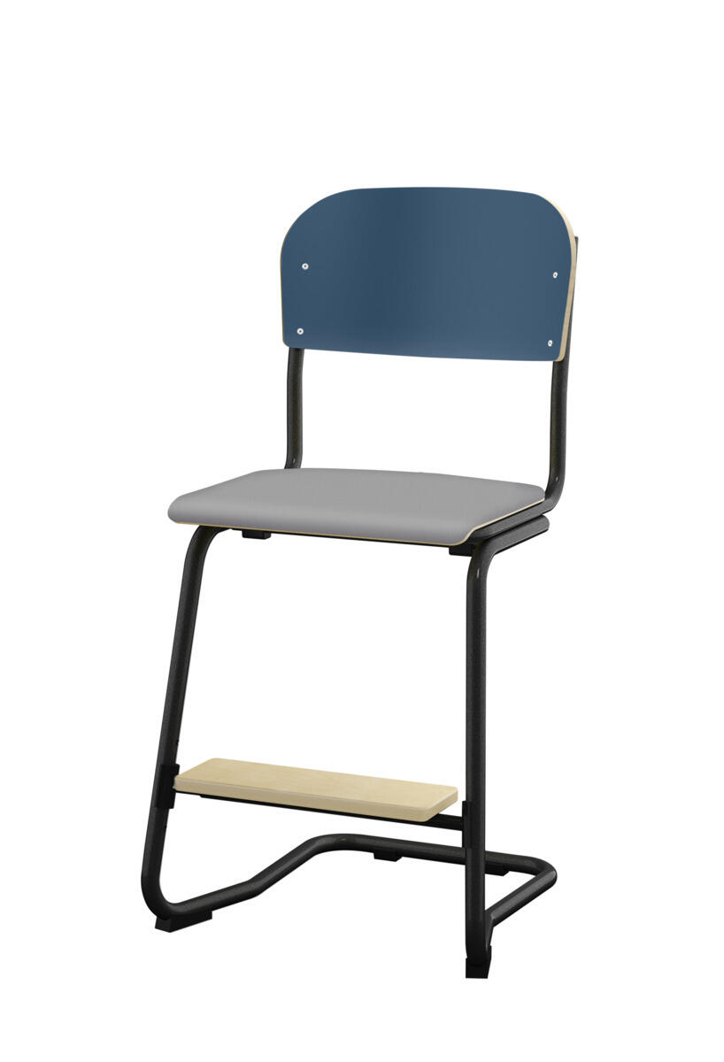 En god stol som kan stables 4 stoler i høyden og er enkel å henge opp på bodet. Stillbar i 4 høyder 45, 51, 57 og 63 cm. Sete og rygg i høytrykkslaminat. Med fotstøtte. OBS! Øvre del av stolen skal alltid ha 2 hull i nedre rørdel. Stort sete. Maks sittehøyde er 63cm.
