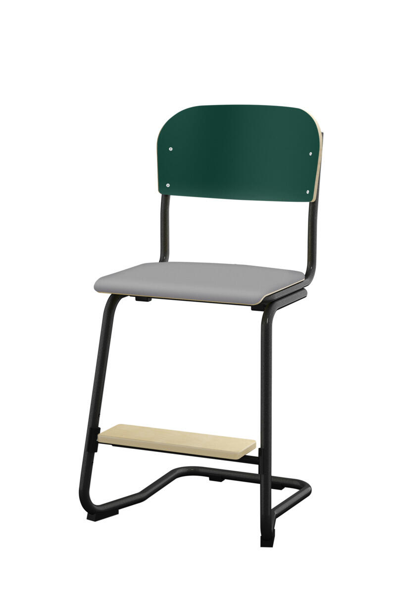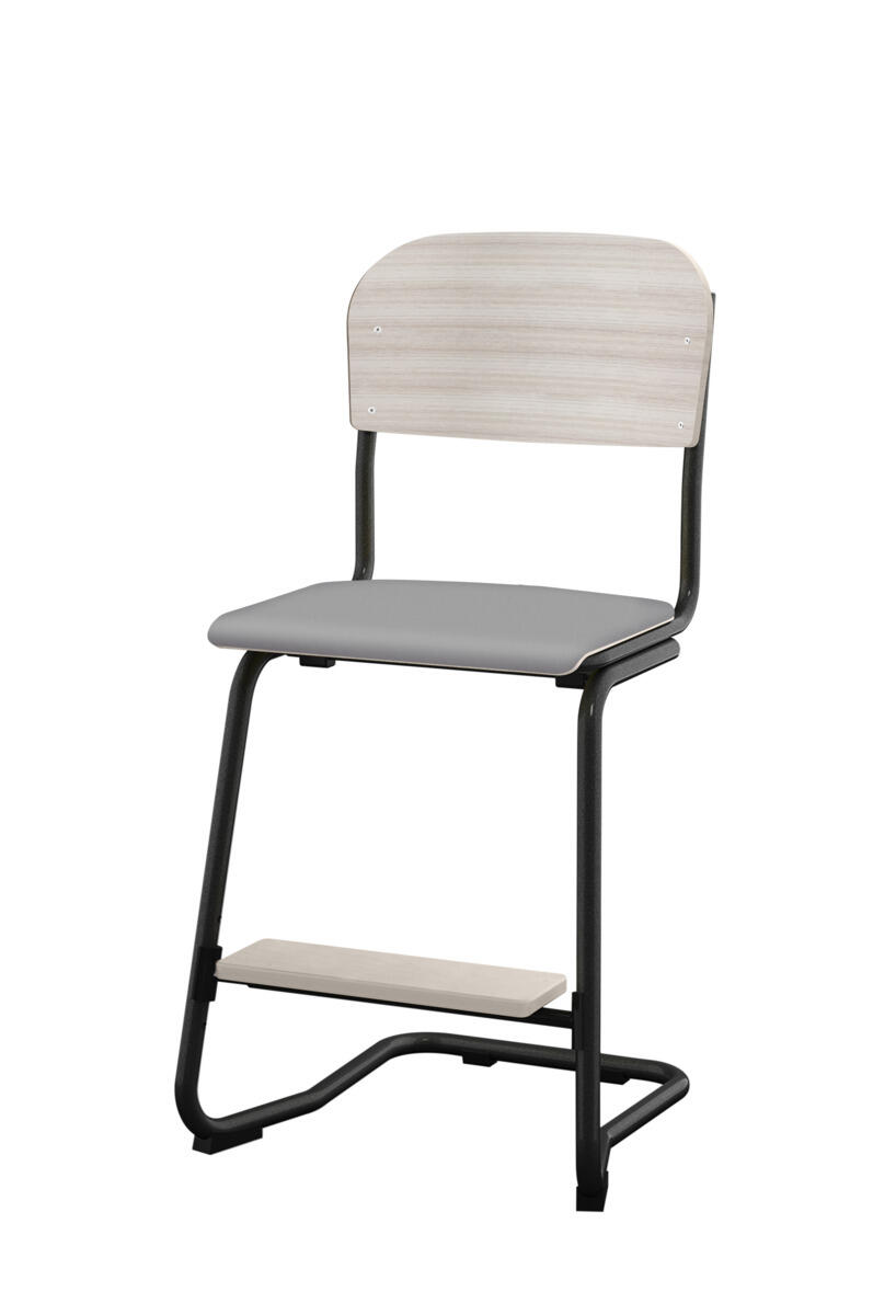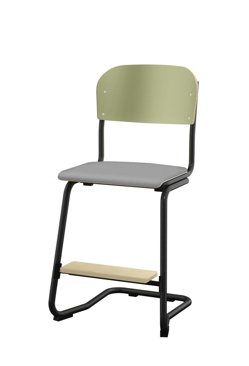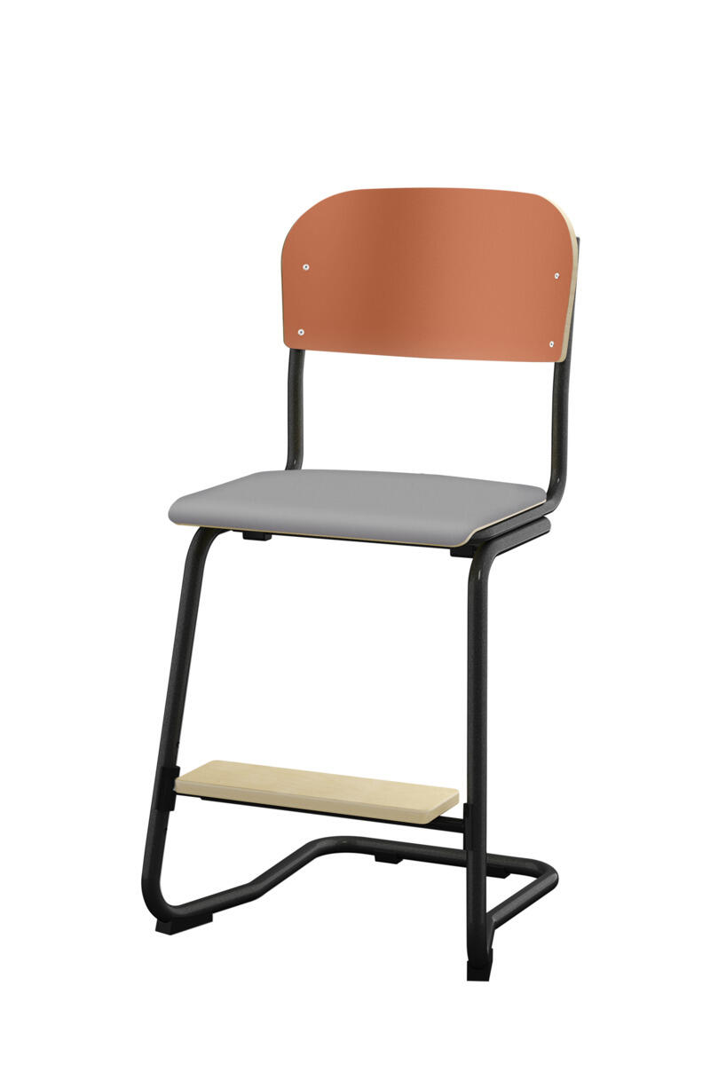 En god stol som kan stables 4 stoler i høyden og er enkel å henge opp på bodet. Stillbar i 4 høyder 45, 51, 57 og 63 cm. Sete og rygg i høytrykkslaminat. Med fotstøtte. OBS! Øvre del av stolen skal alltid ha 2 hull i nedre rørdel. Stort sete. Maks sittehøyde er 63cm.