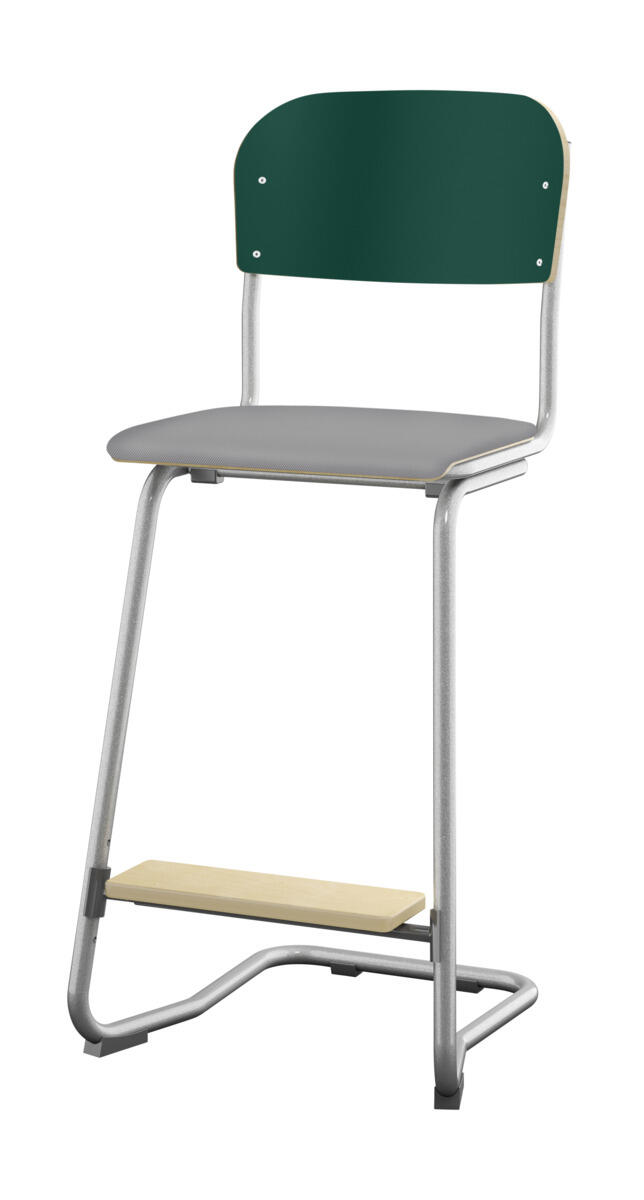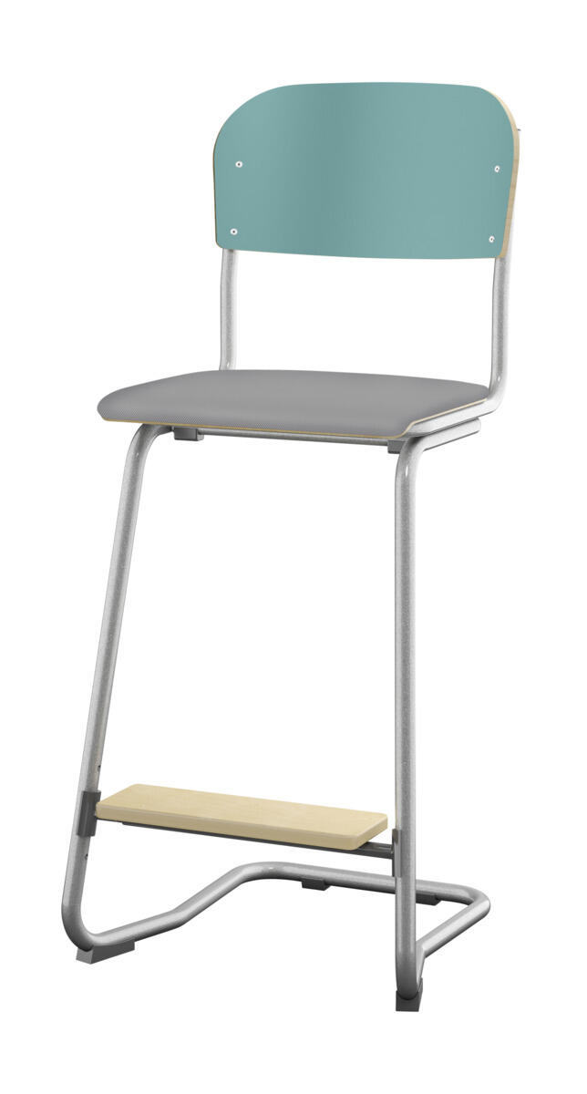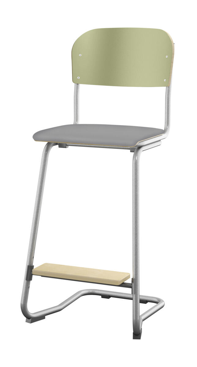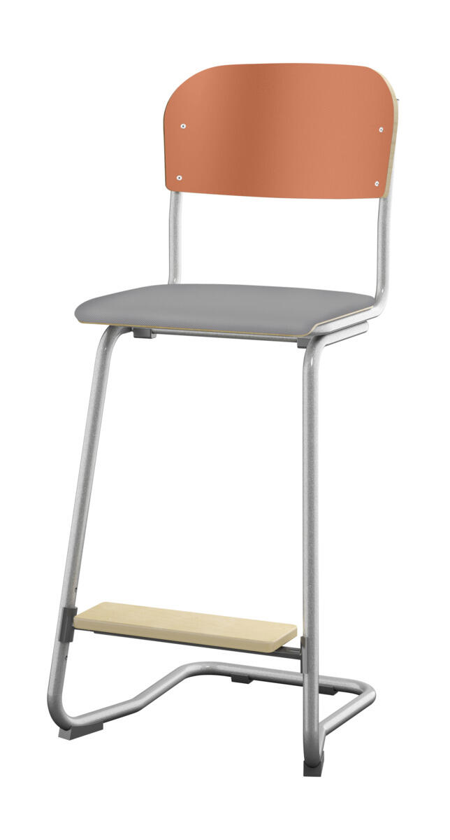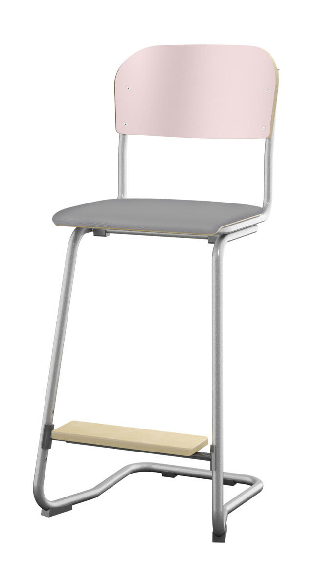 En god stol som kan stables 4 stoler i høyden og er enkel å henge opp på bodet. Stillbar i 4 høyder 45, 51, 57 og 63 cm. Sete og rygg i høytrykkslaminat. Med fotstøtte. OBS! Øvre del av stolen skal alltid ha 2 hull i nedre rørdel. Maks sittehøyde er 63cm.