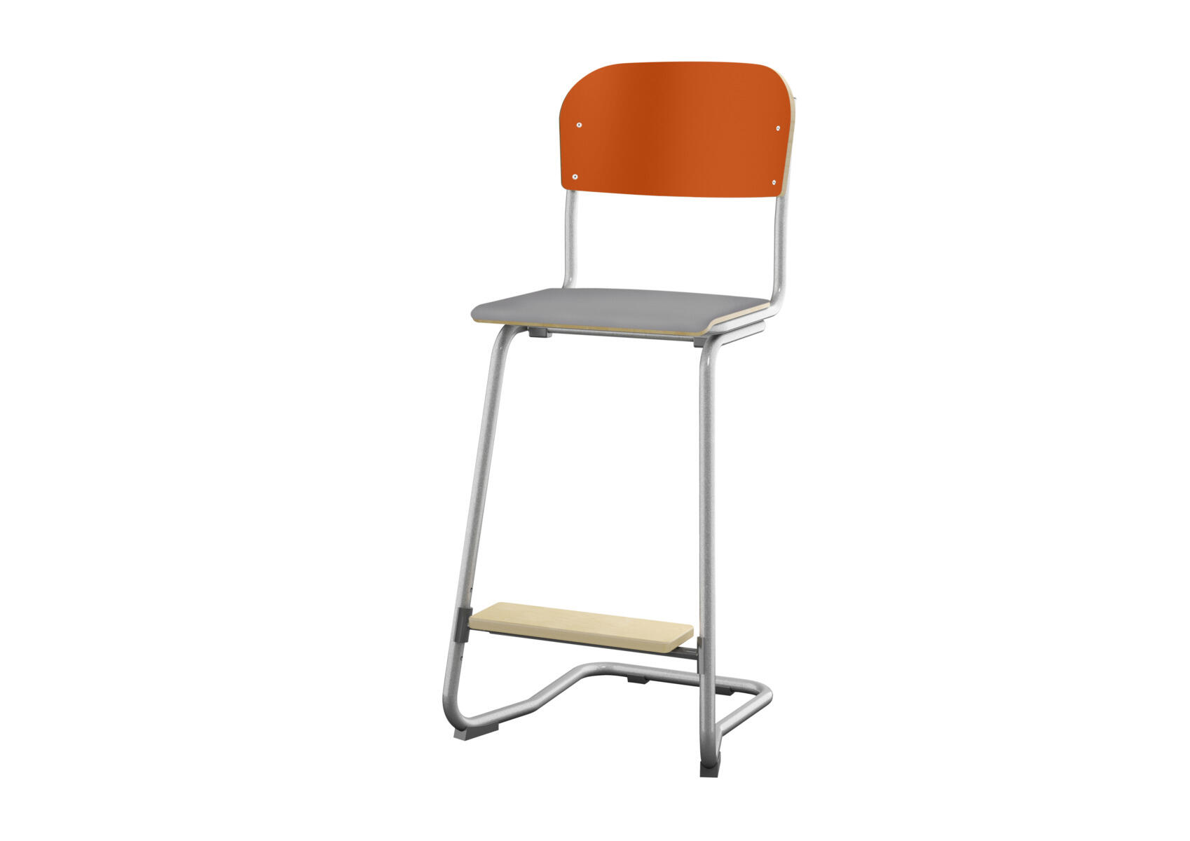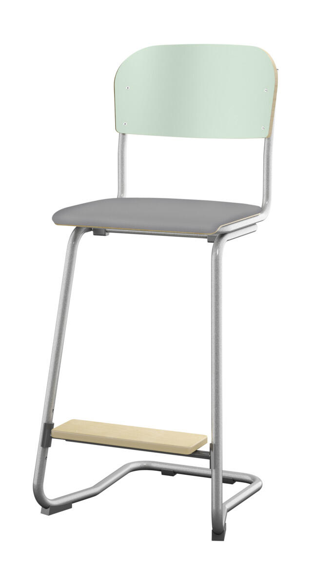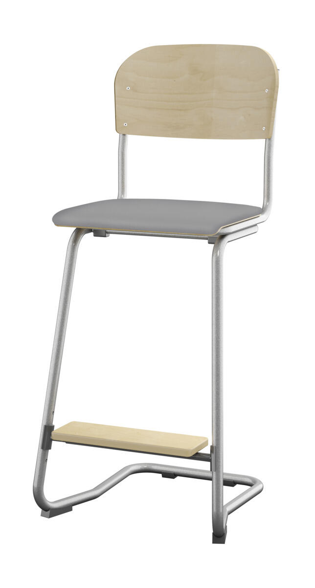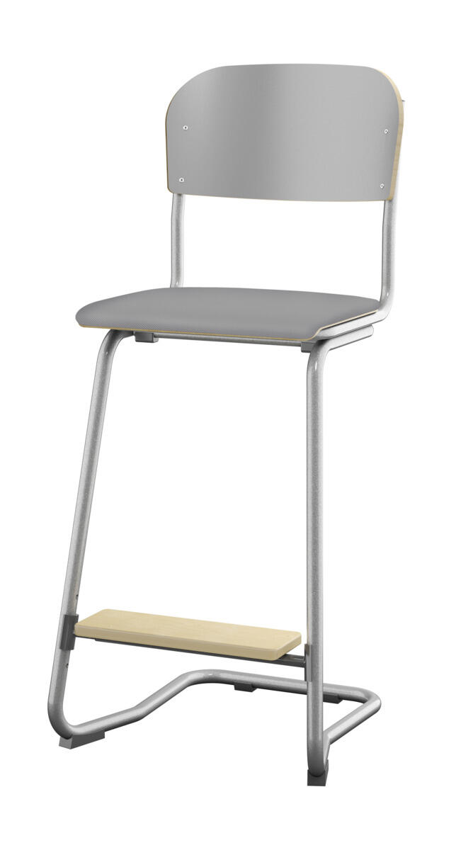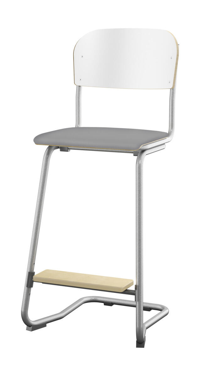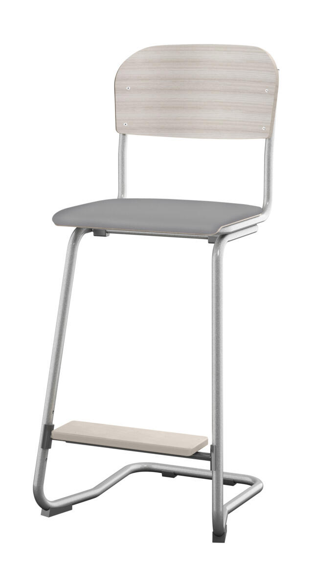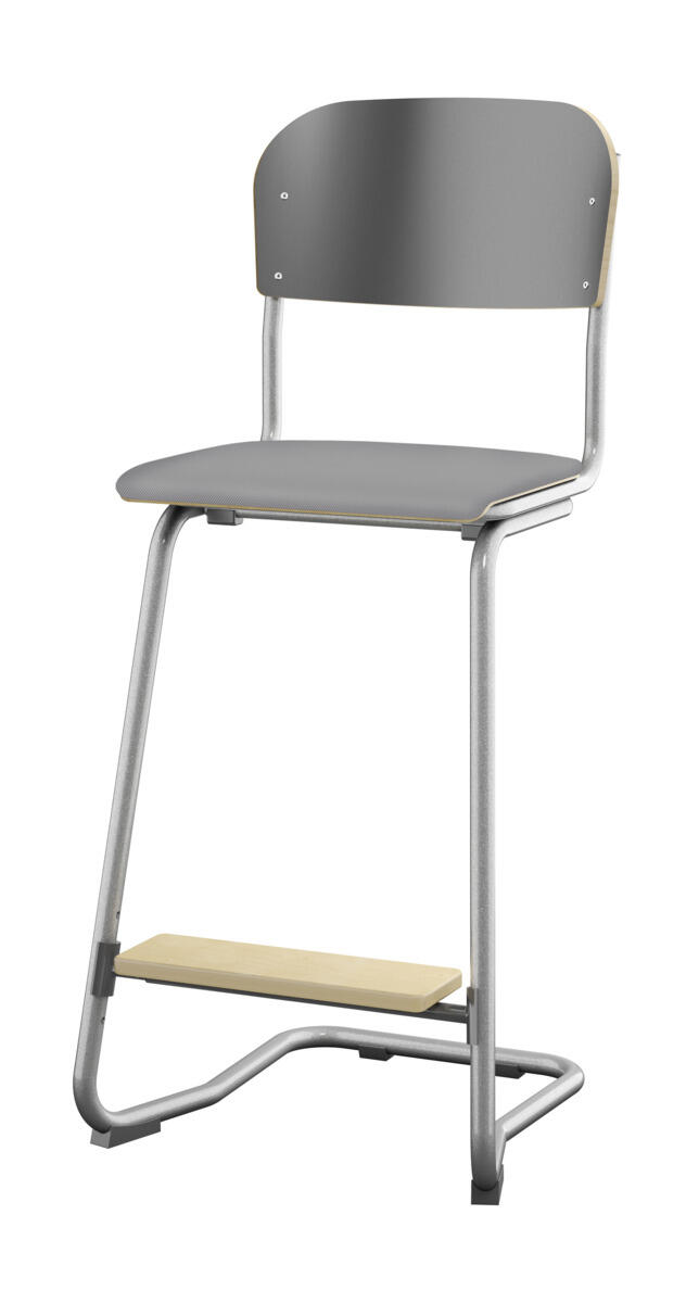 Sete og rygg i høytrykkslaminat. Epoxylakkert understell i sølv RAL 9006. Sittemål (bxd) 36x35 cm, sittehøyde 57-60-63 cm. Totaldybde 54 cm. Vekt 6,4 kg. Regulerbart fotbrett i 3 faste høyder. Kan stables maks 4 stoler i høyden. Støydempende føtter. Kan henges på bord.