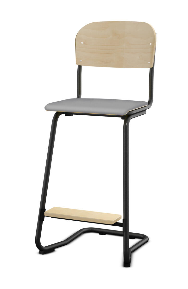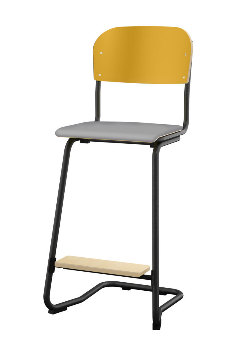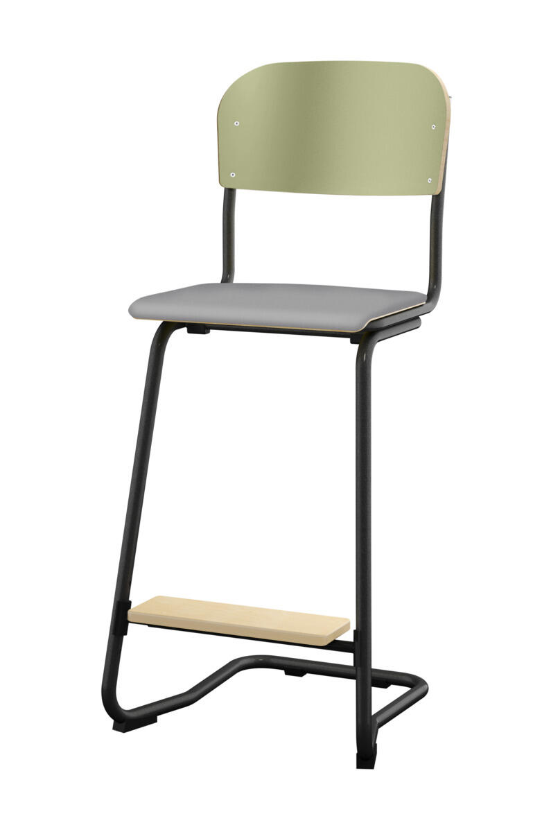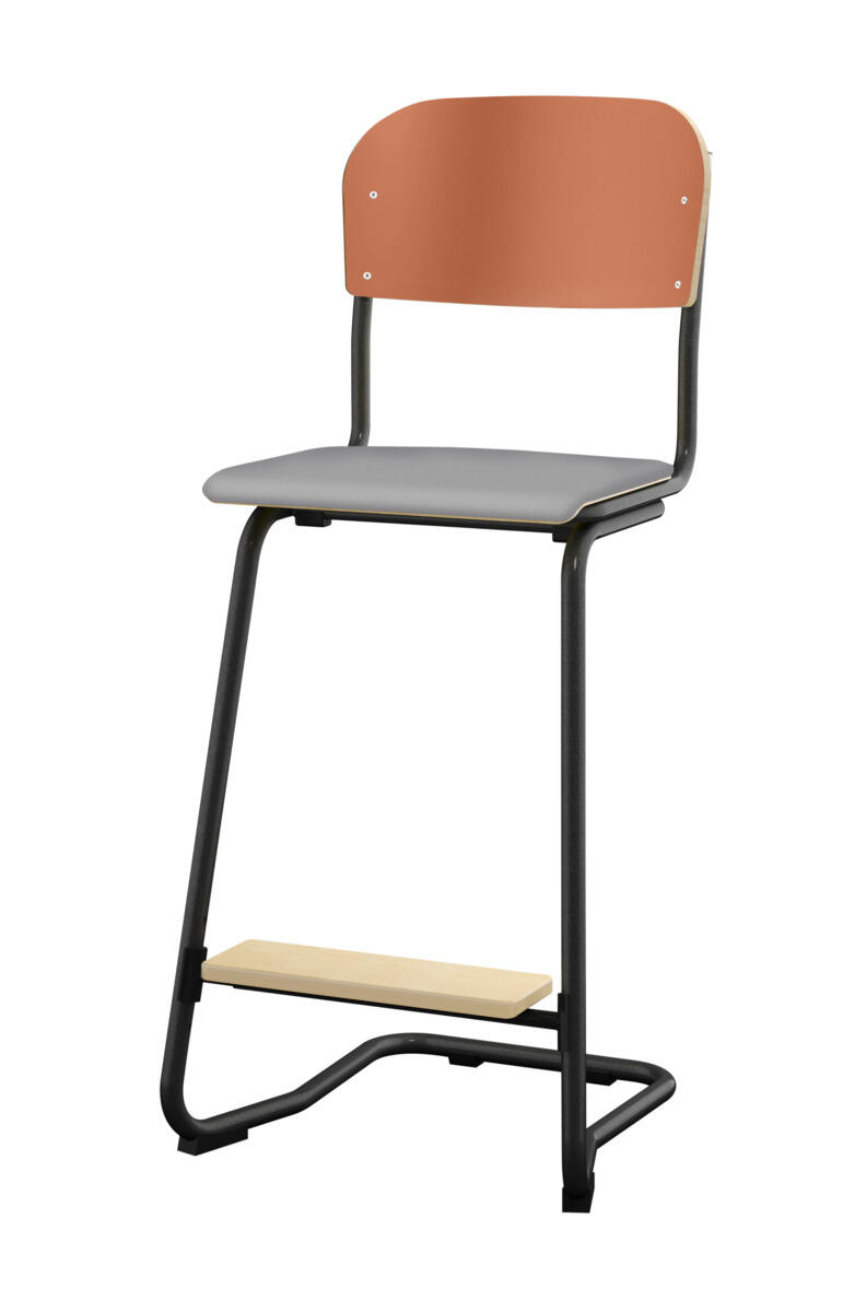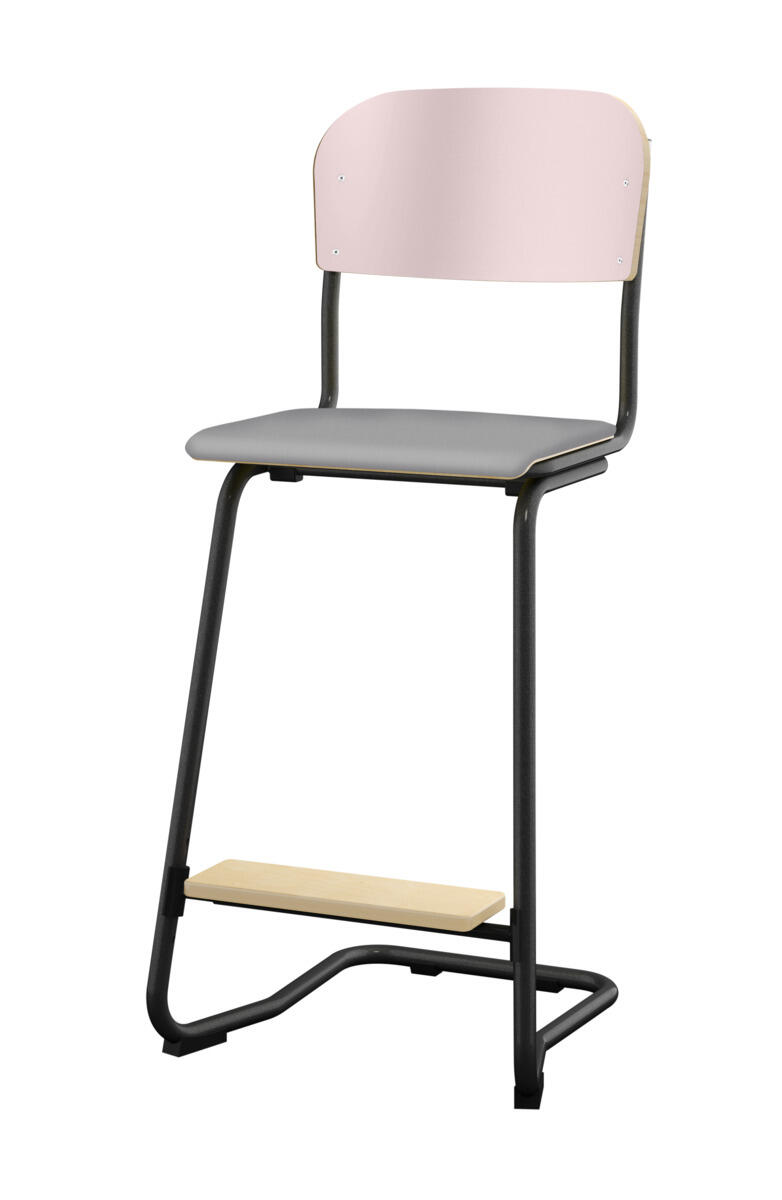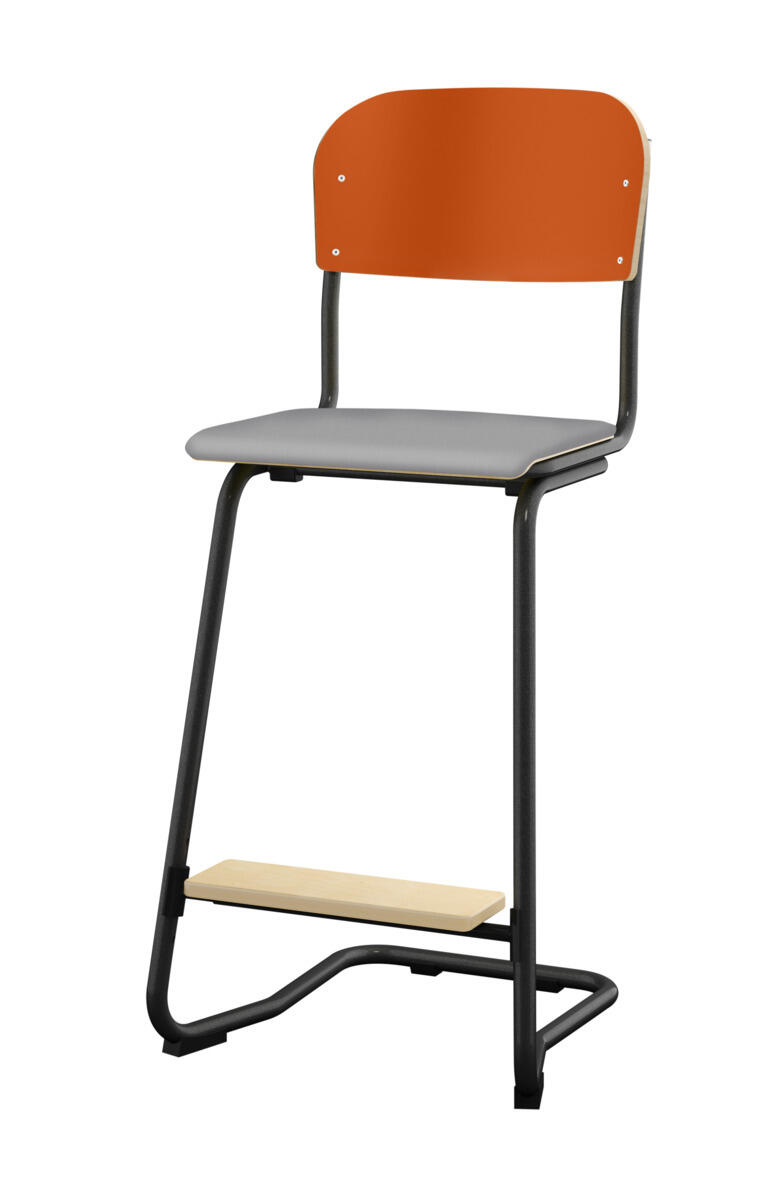 En god stol som kan stables 4 stoler i høyden og er enkel å henge opp på bodet. Stillbar i 4 høyder 45, 51, 57 og 63 cm. Sete og rygg i høytrykkslaminat. Med fotstøtte. OBS! Øvre del av stolen skal alltid ha 2 hull i nedre rørdel. Stort sete. Maks sittehøyde er 63cm.
