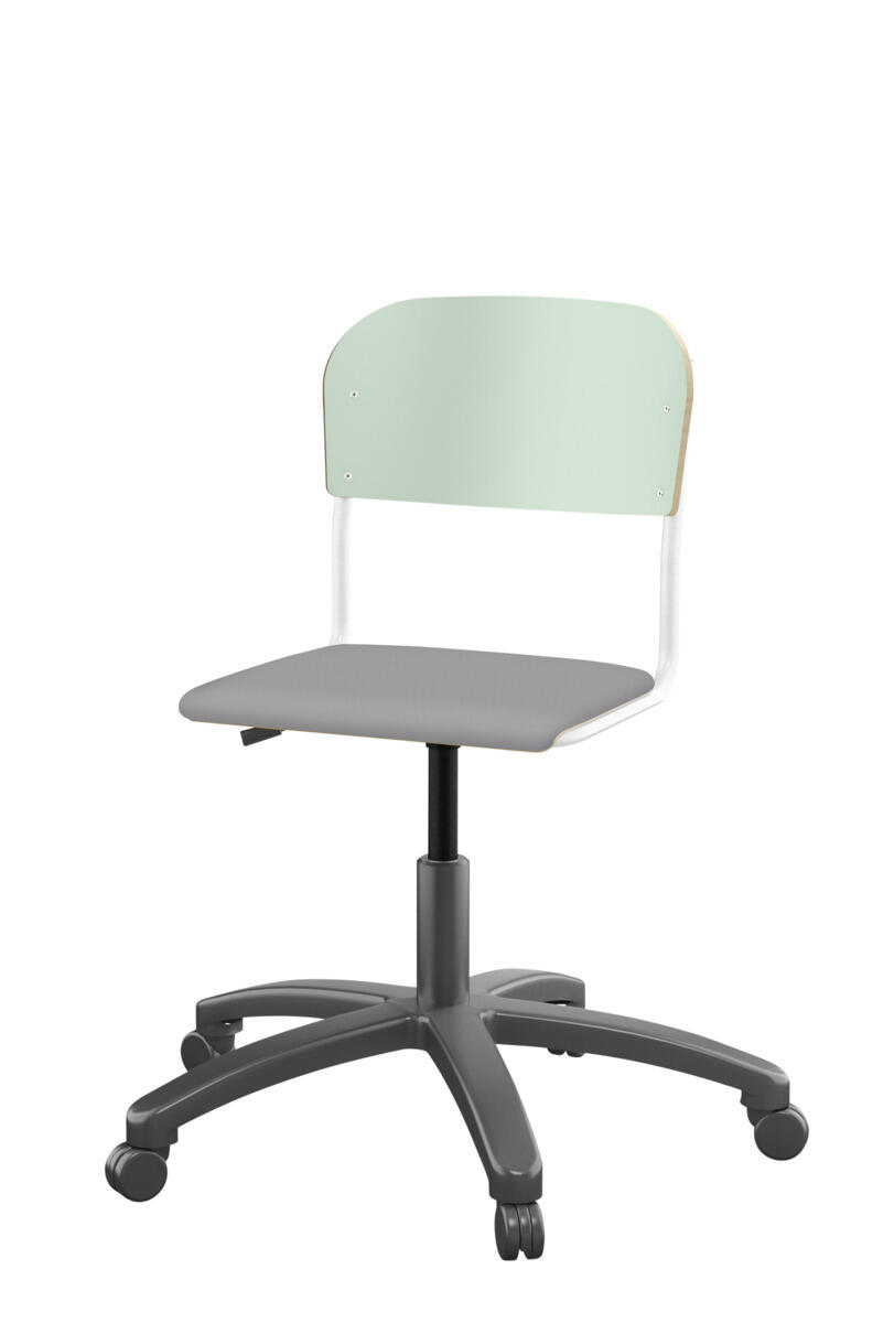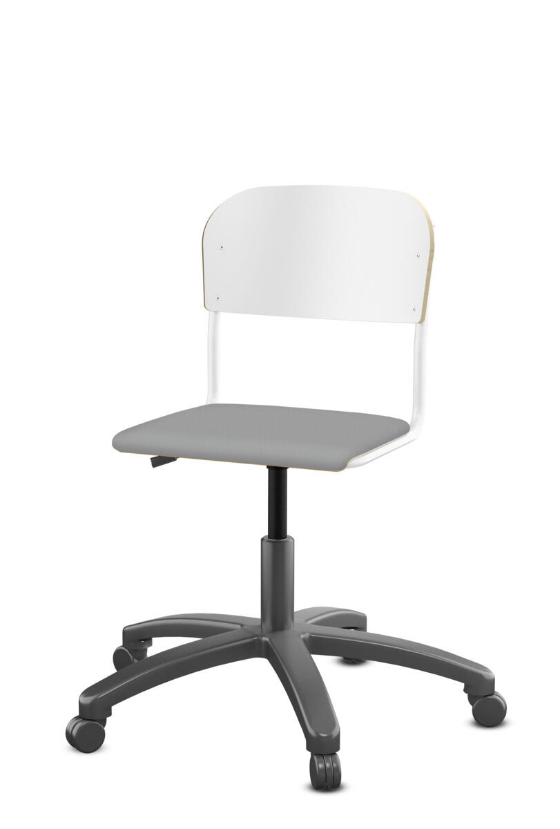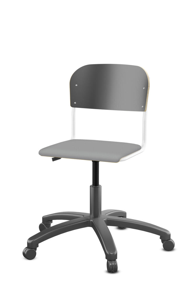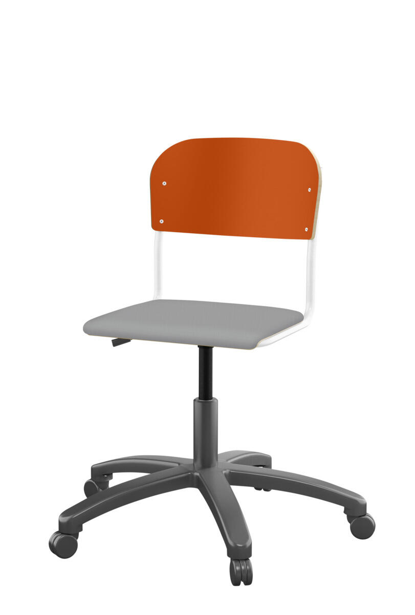 Elevstol med plastskall i støpt polyuretan. Innstøpte muttere for solid innfesting til understell. Kryss i svart nylon med hjul. Sittehøyde 38-50 cm. Setebredde 44 cm, setedybde 40 cm.