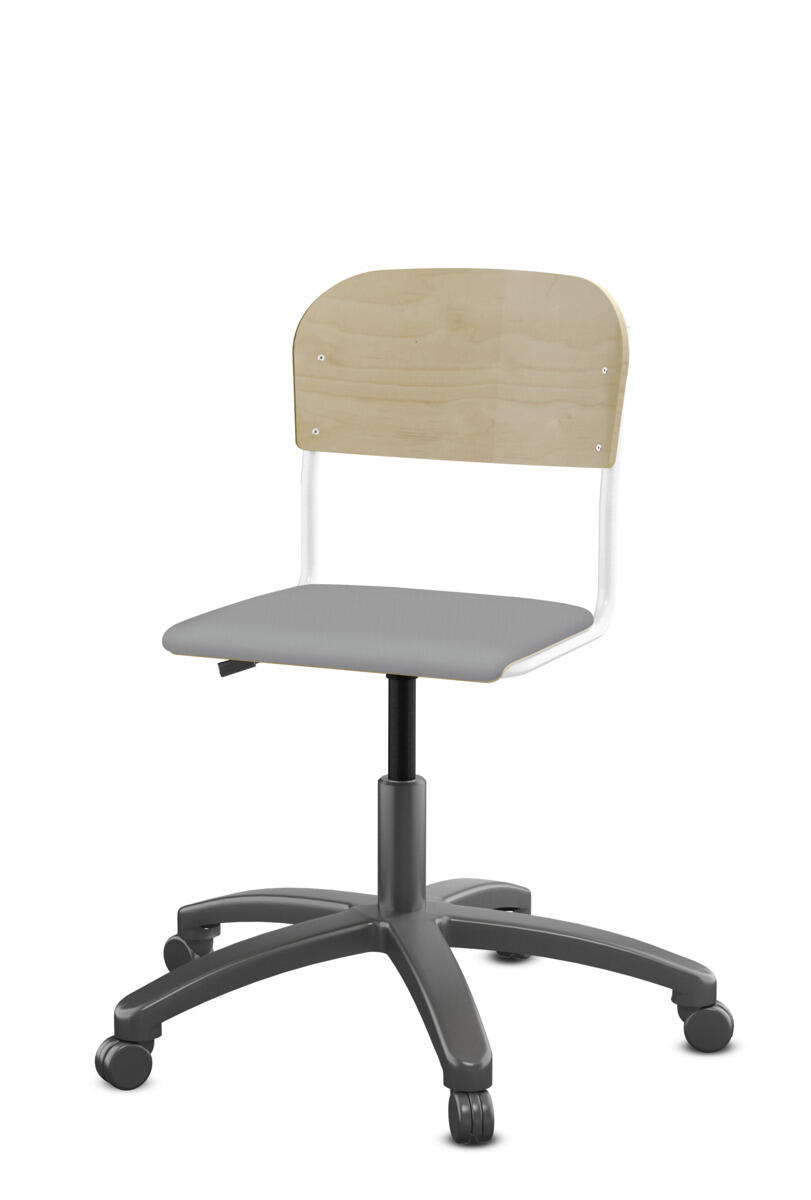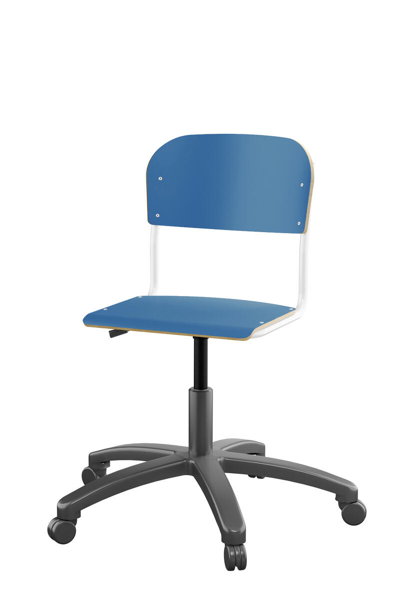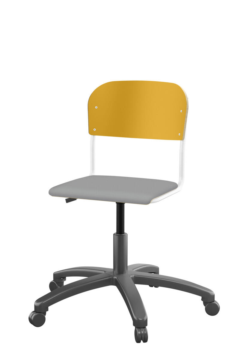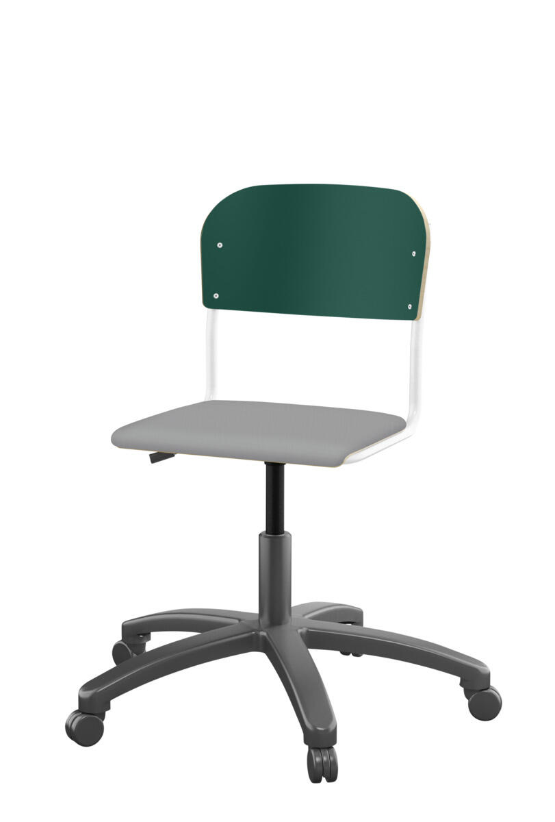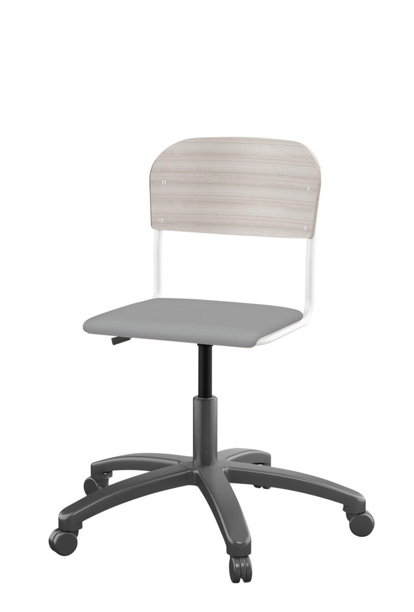 Elevstol med plastskall i støpt polyuretan. Innstøpte muttere for solid innfesting til understell. Kryss i svart nylon med hjul. Sittehøyde 38-50 cm. Setebredde 44 cm, setedybde 40 cm.