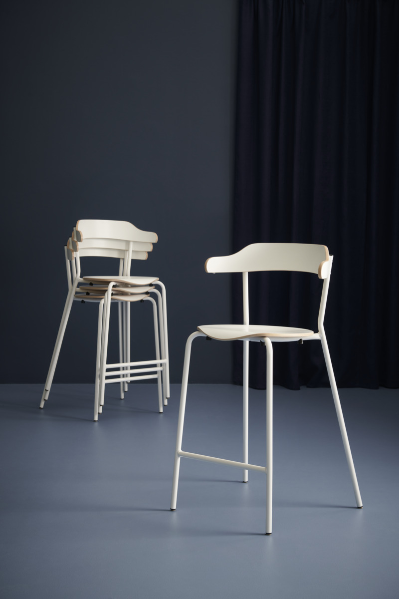 Kan stables (maks 8 stoler). Kan henges opp. Støydempende knotter. Sete og rygg i høytrykkslaminat. Epoxylakkert understell hvit RAL9003. Sittehøyde 43 cm, sittedybde 38 cm, Sittebredde 38,5 cm, totalbredde 50 cm. Vekt 3,75 kg. Testet og godkjent for offentlige miljøer ihht gjeldende Eurapakrav.