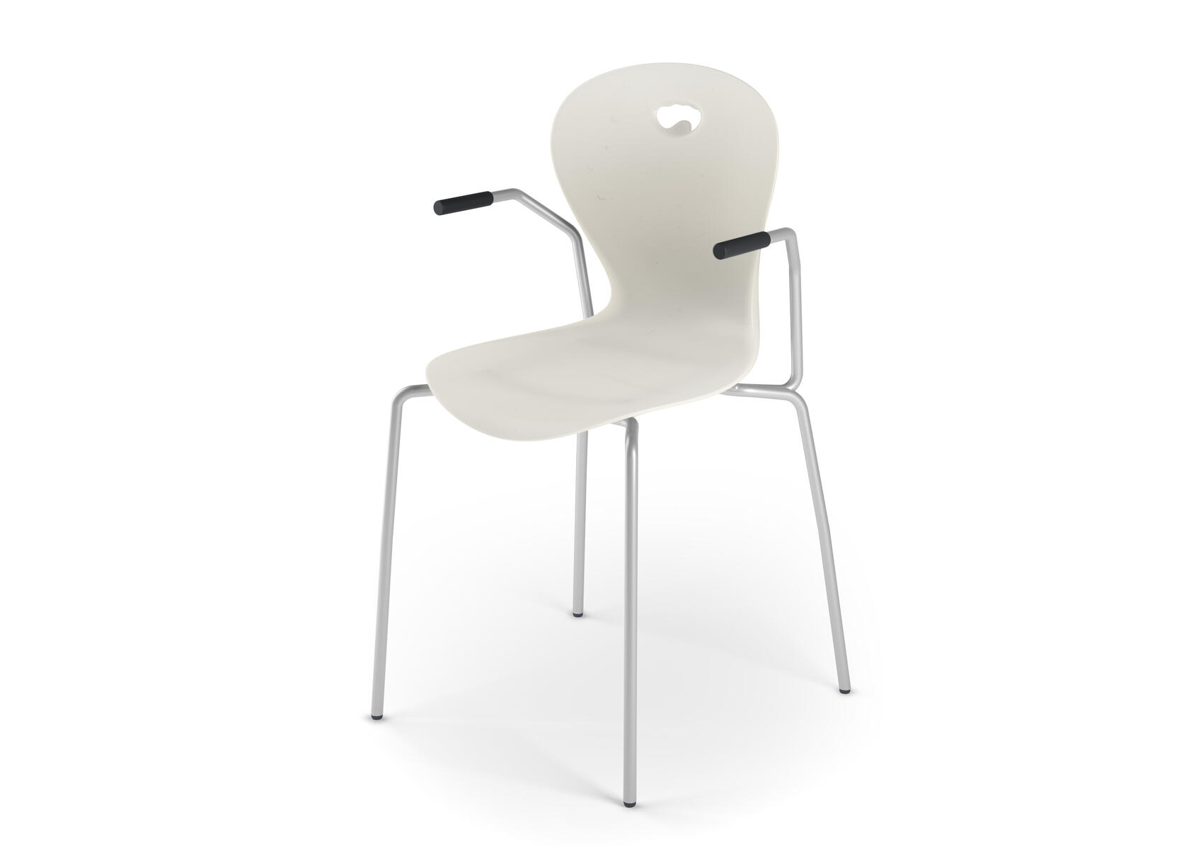 Plastskall i 100% resirkulert materiale. Veskekrok i plastskallet. Uppfyller EN 1729-1 4&5 som innebærer at brukere mellom 133 og 176 cm sitter bekvemt og ergonomisk riktig i stolen. Veskekrok på baksiden. Kan stables. Hvitlakkert understell RAL 9003.