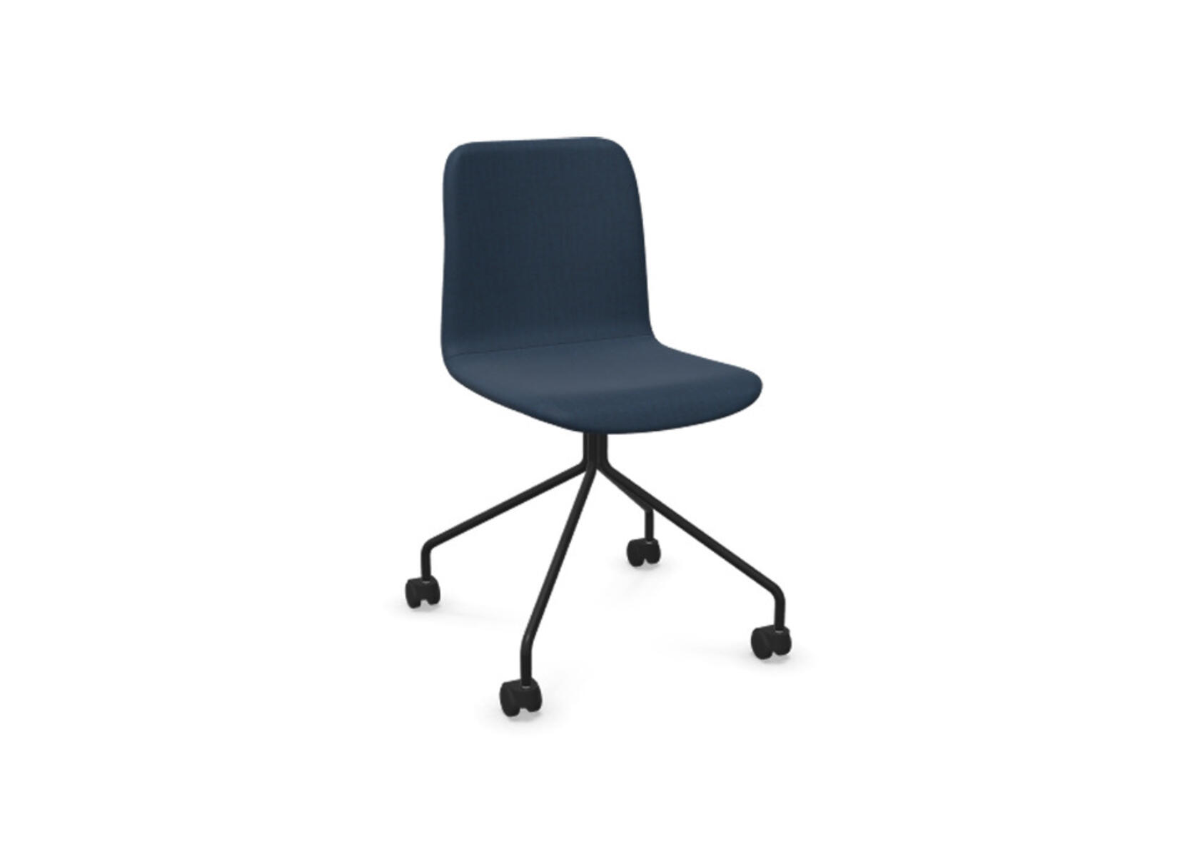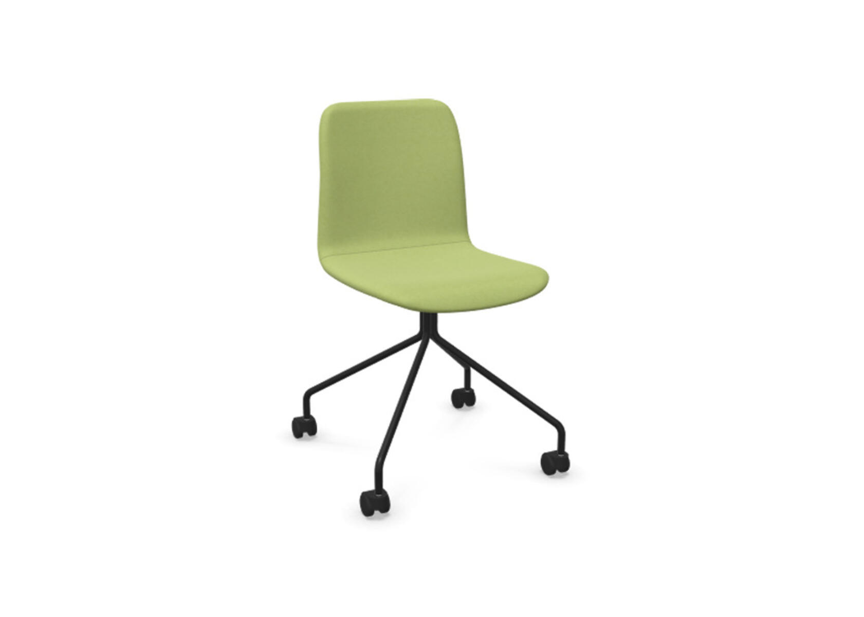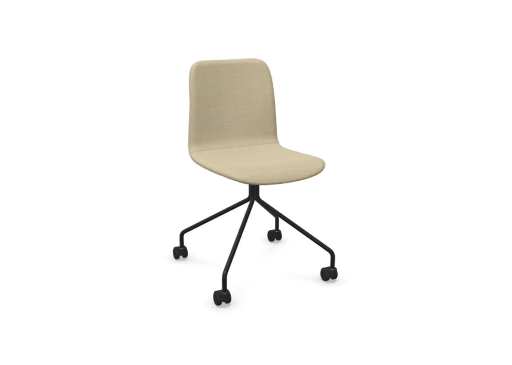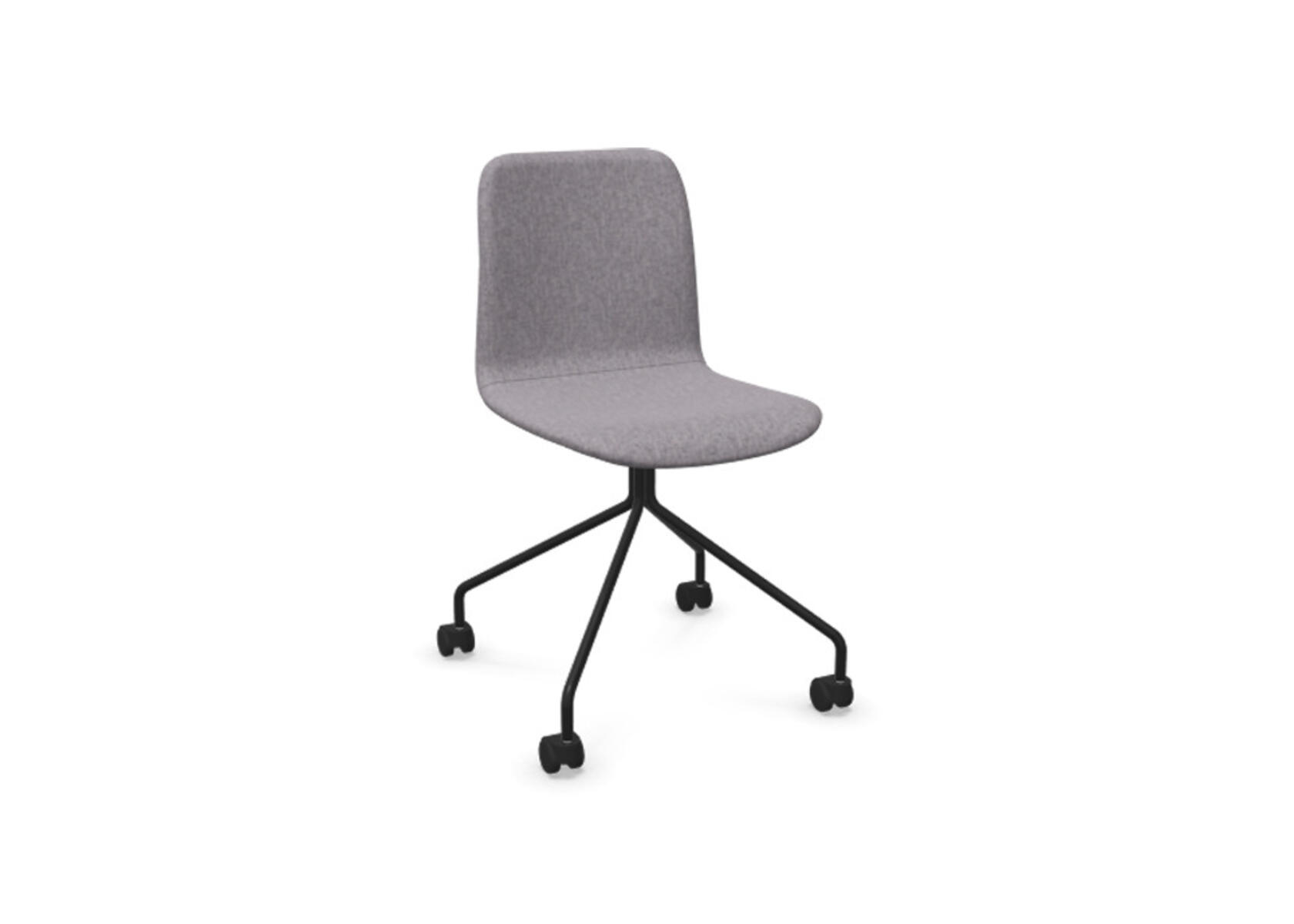 Seteskall i formpresset kryssfiner trukket med kaldskum, som gir både komfort og støtte. Stabilt pulverlakkert 4-kryss understell av 18 mm rør med hjul for harde gulv. Armlener finnes som tilvalg. Maksimal vekt: 110 kg. Stolen er verken høydejusterbar eller roterbar.